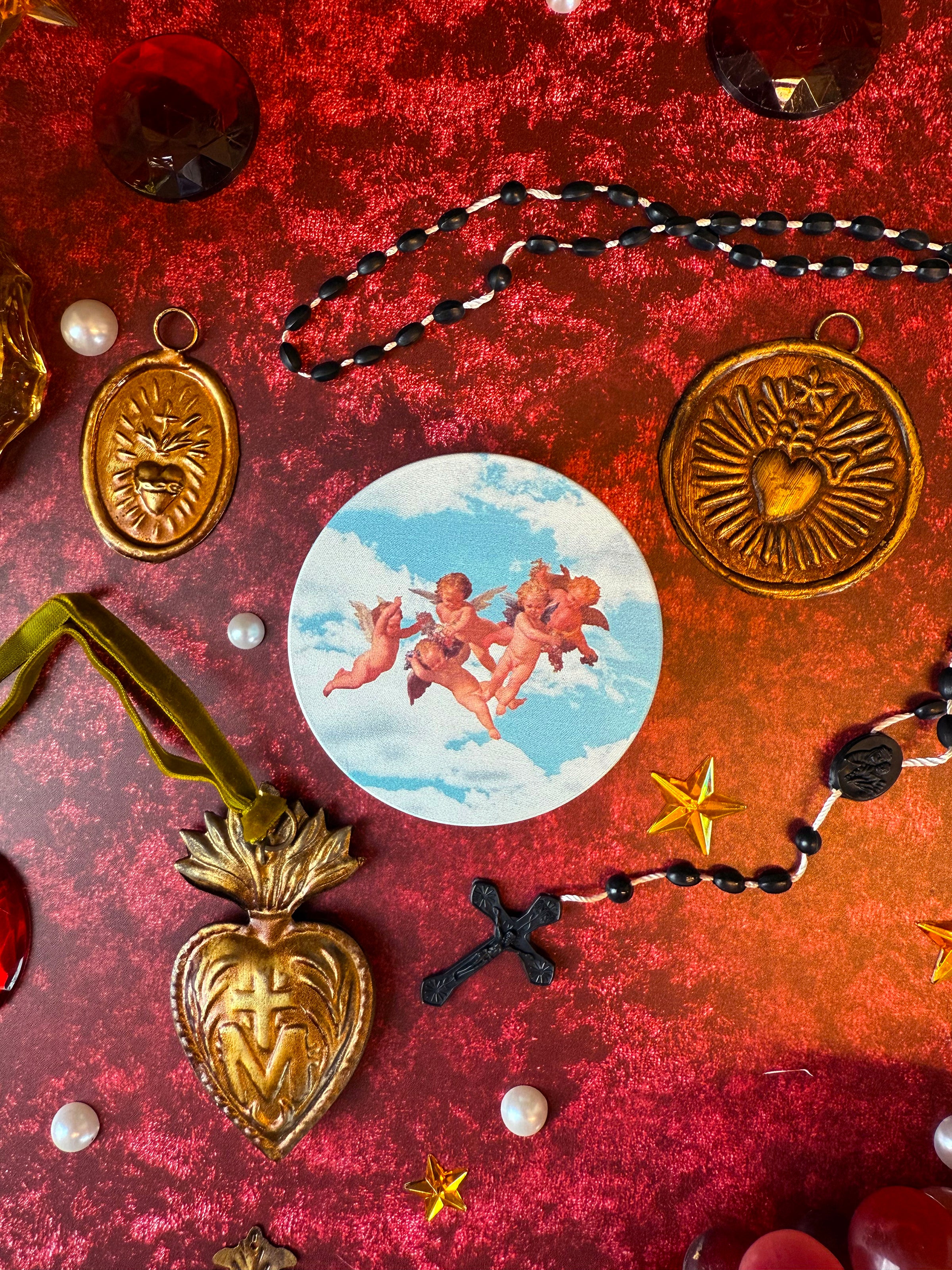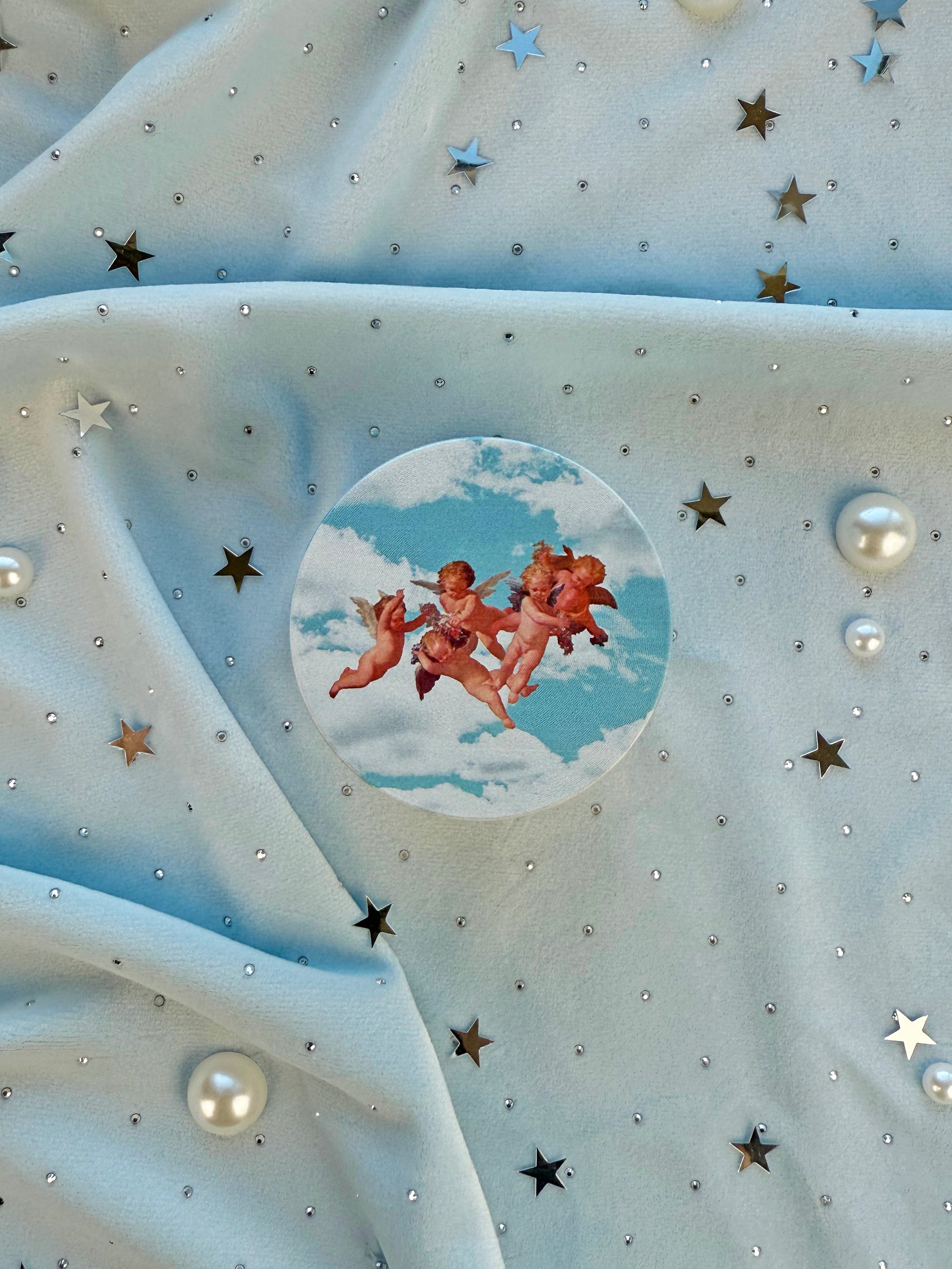 This gorgeous Cherub Grinder features a flight of cherubs against a soft blue sky - whimsical and wonderful! It has four parts with three compartments. The top has a magnetic closure so you can infinitely grind it while the top stays securely on. The bottom compartment collects the kief and even comes with an adorable little spatula!