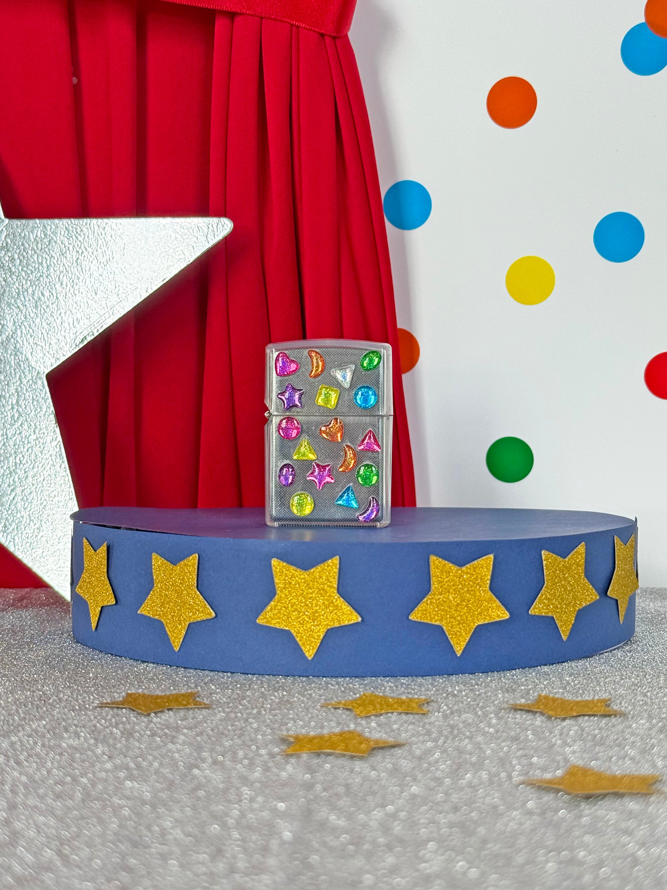 This durable silver lighter comes with a colorful gem covered case! GORG. The case is clear and adorned with the iconic nostalgic shiny gems on both sides. It can be easily removed by sliding out the lighter and can be used with our other zippo style lighters here!