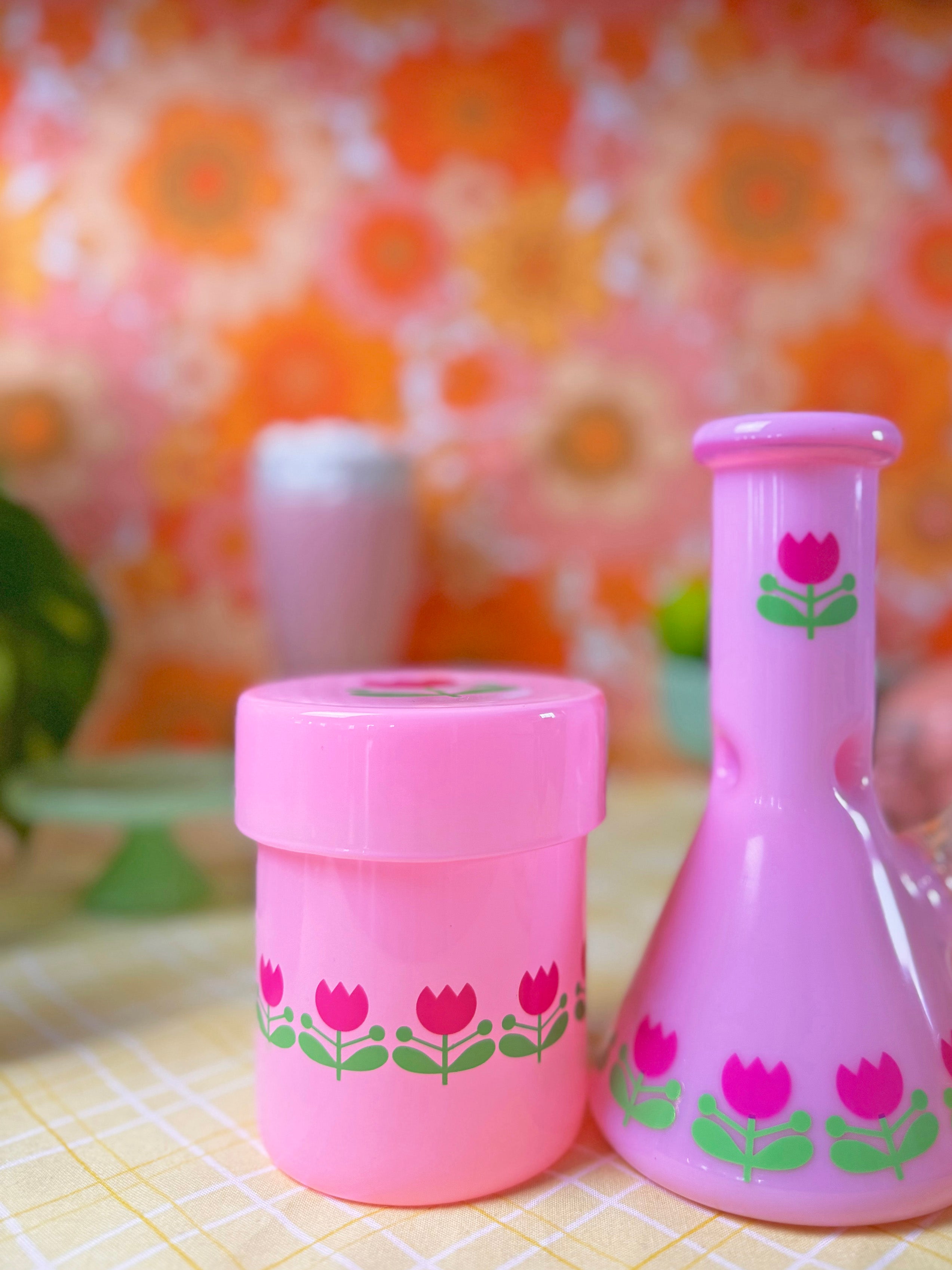 Looking for the perfect place to stash your goods? The timeless design of this stash jar is too cute to pass up. This glass jar features our pink atomic tulip print and a glass top with rubber seal that keeps your stash fresh!