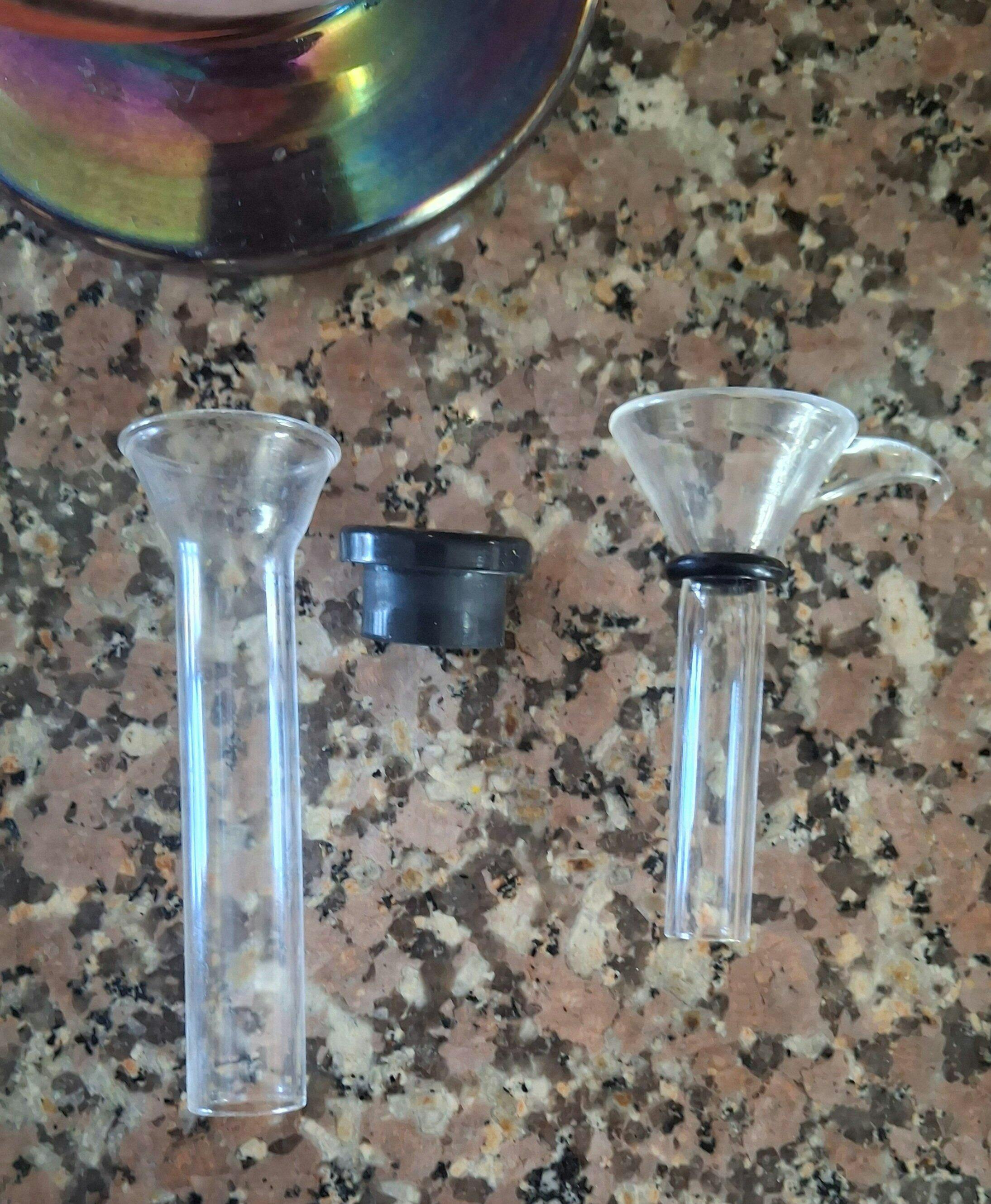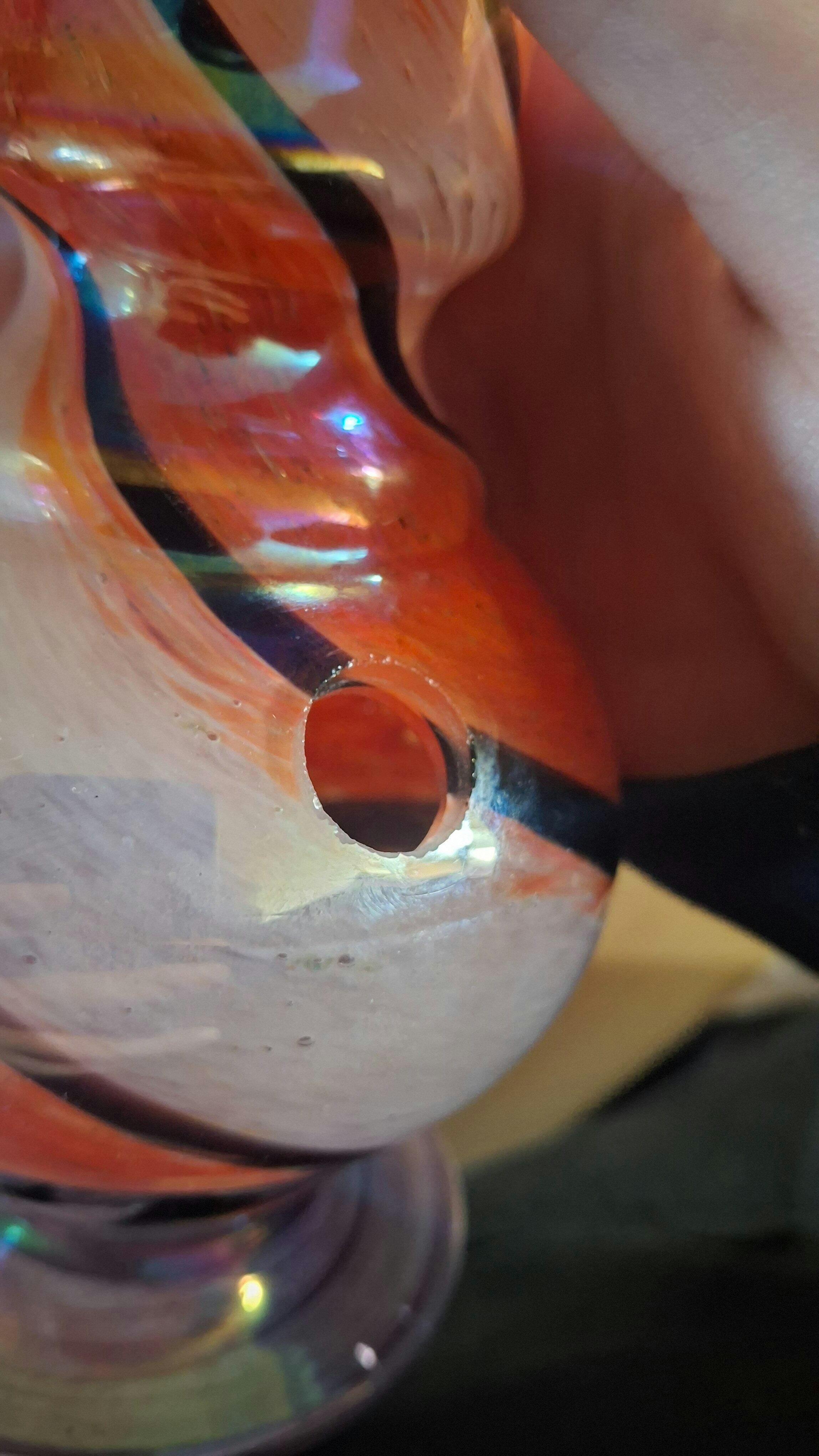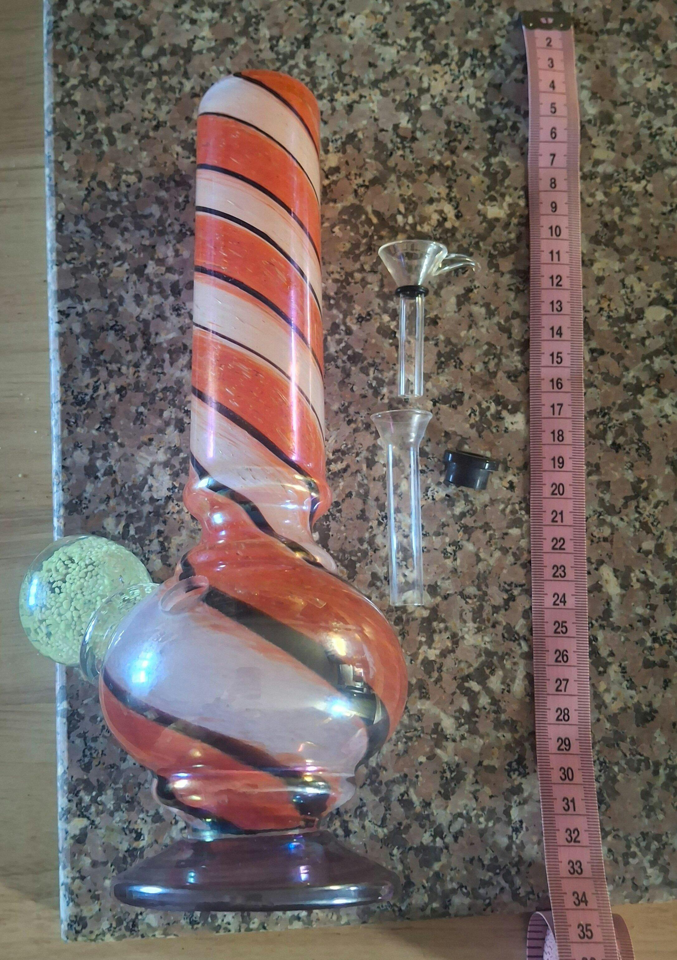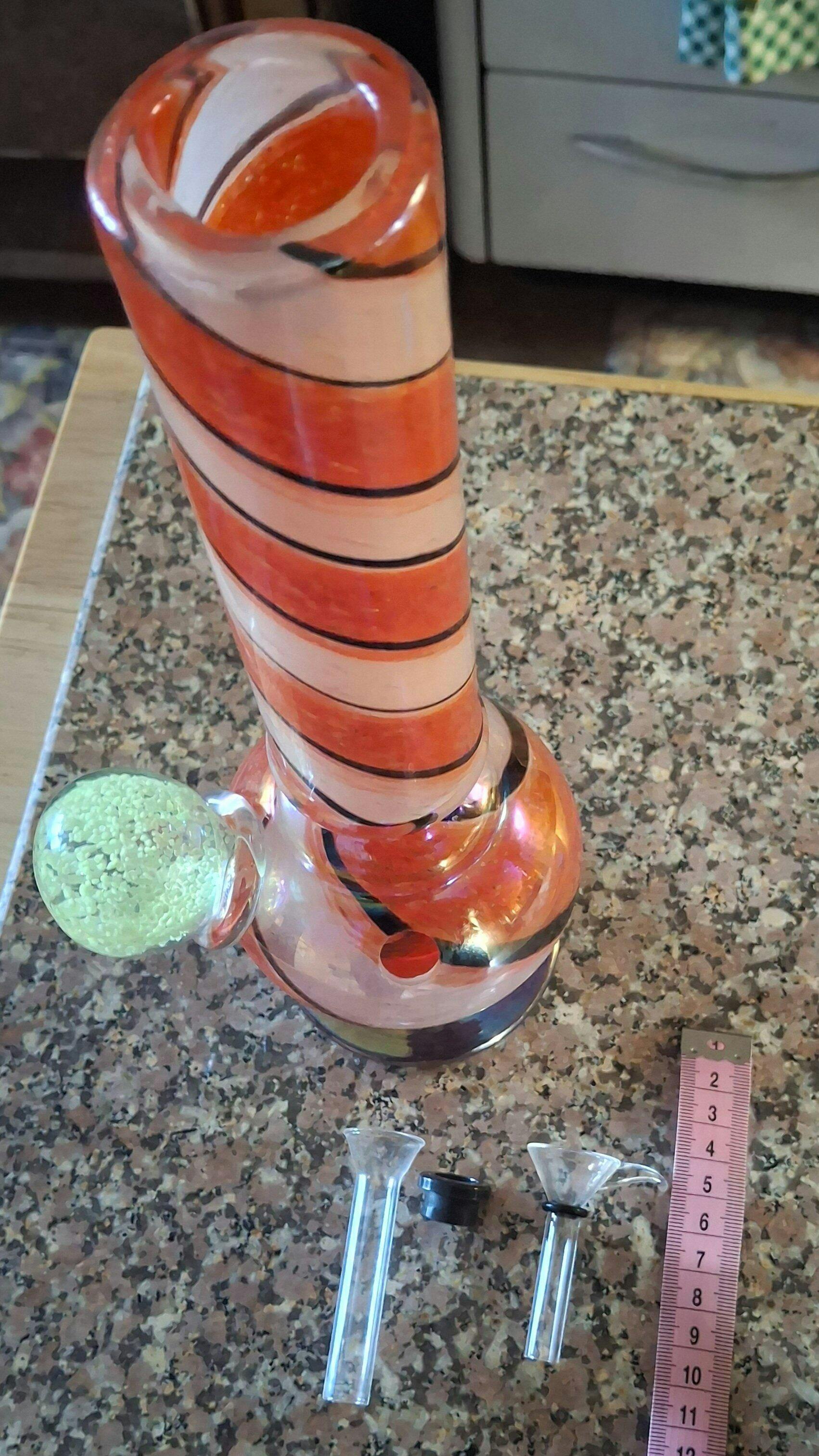 Truly one of the more unique bong we've ever seen! This piece features a stunning red and white stripe design - just like a circus tent! It also has a pretty iridescent finish with a glow in the dark bulb on the side that provides extra grip during your sesh (perf if you're accident prone like us).