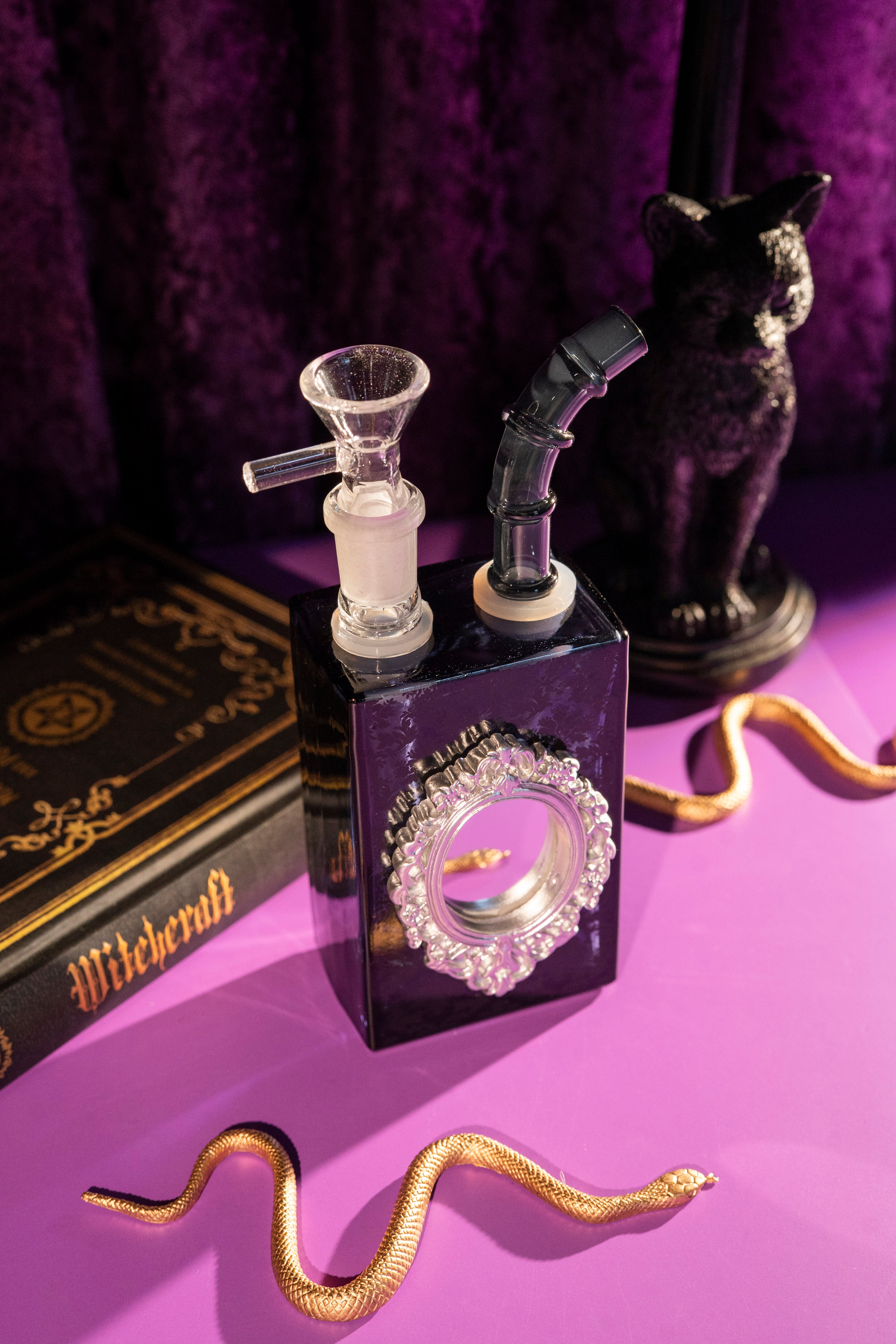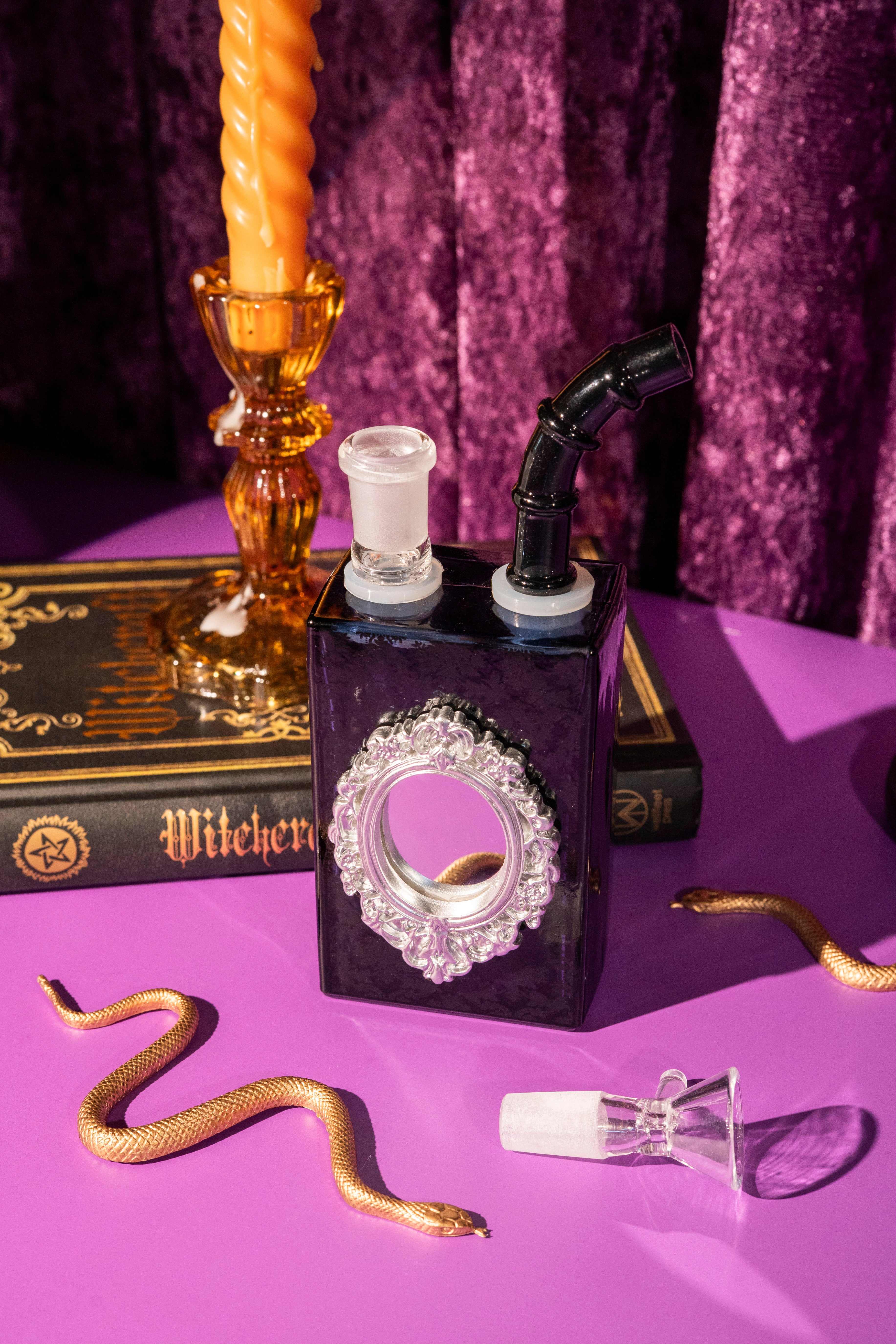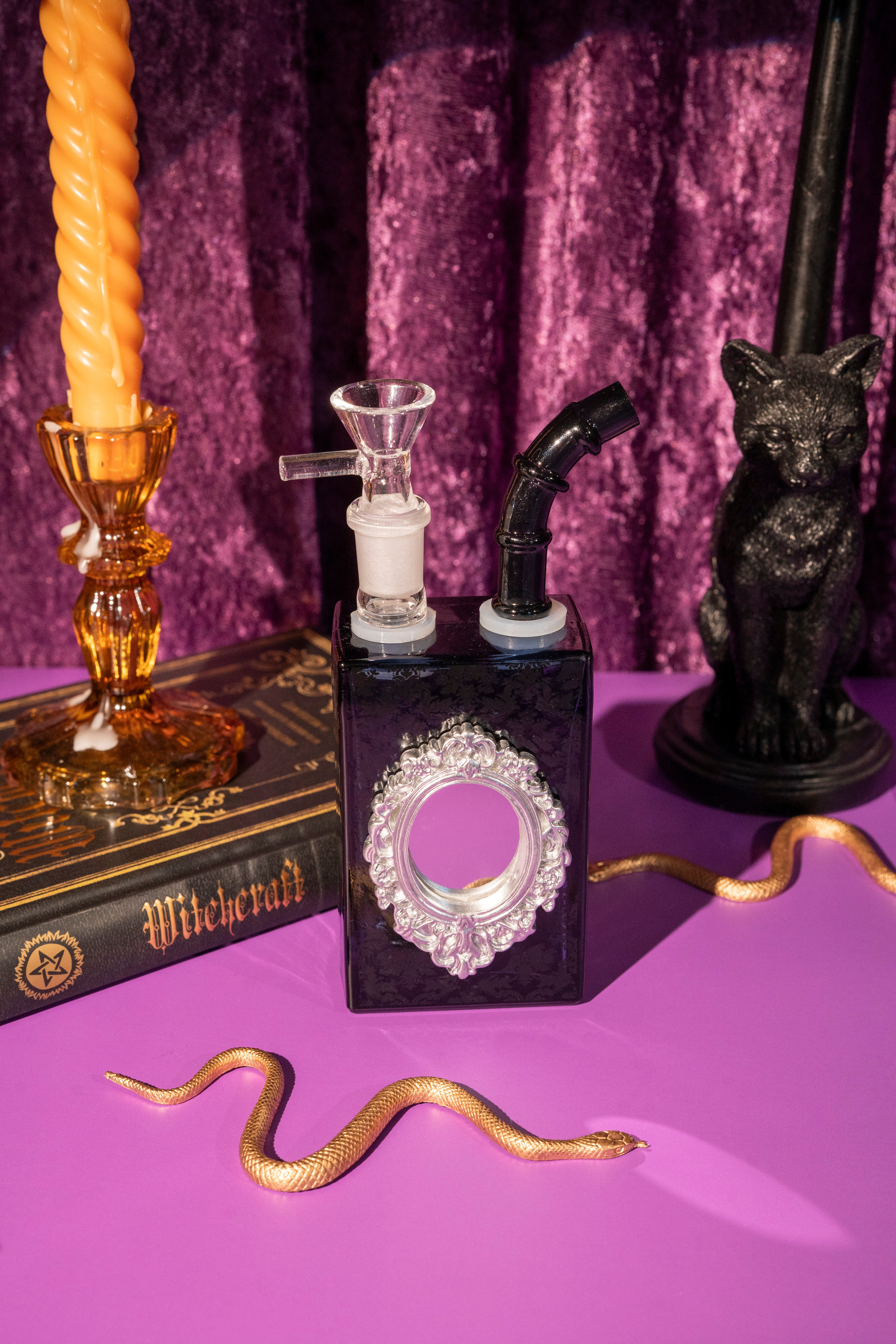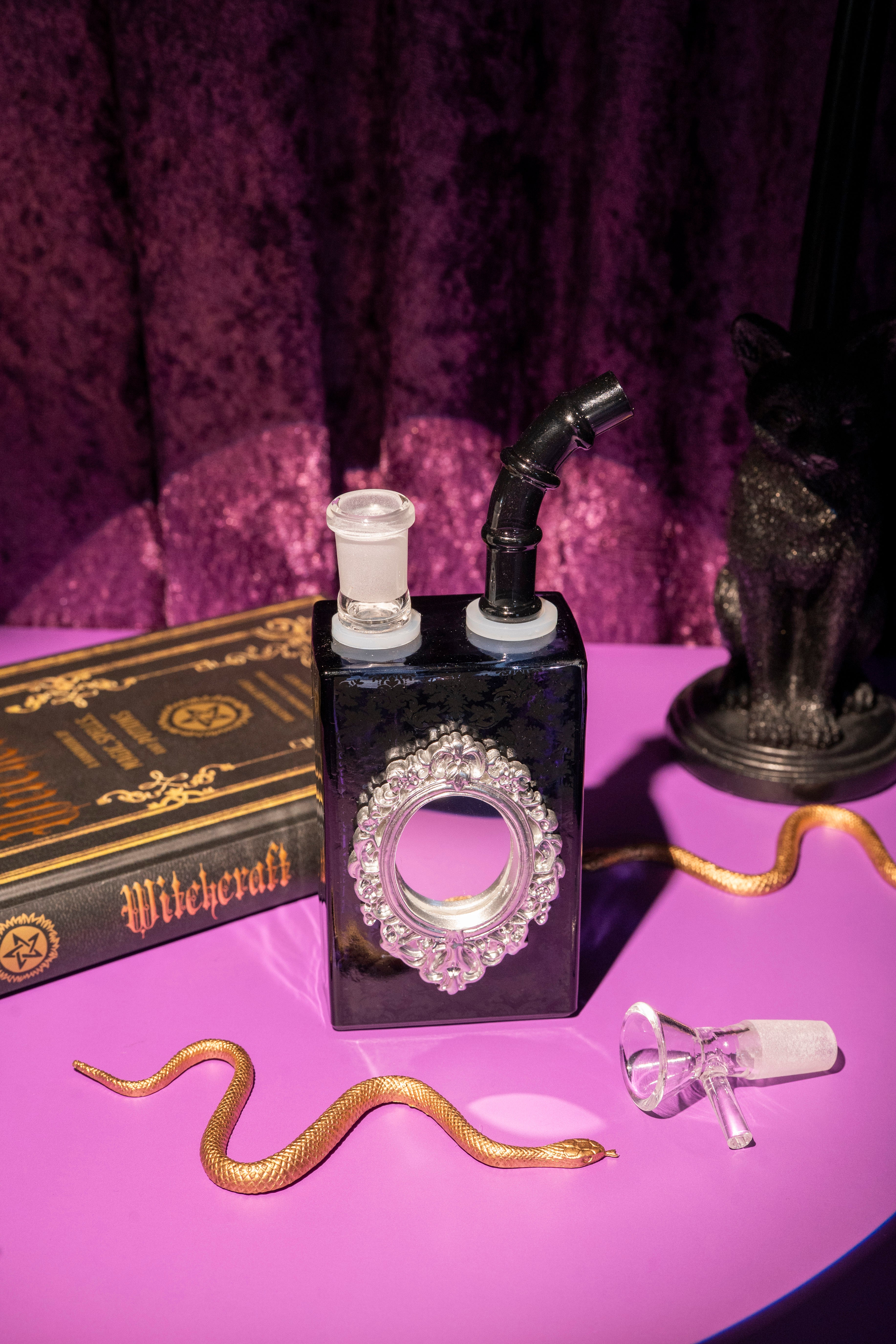 This gothic, juice box style bong is covered in an all over damask pattern and features two vintage-style, fully functional mirrors on each side! Perfect for checking if you're still hot mid sesh (spoiler: you are). It's nice and compact for on-the-go. Just fill her with water and she's ready to go!