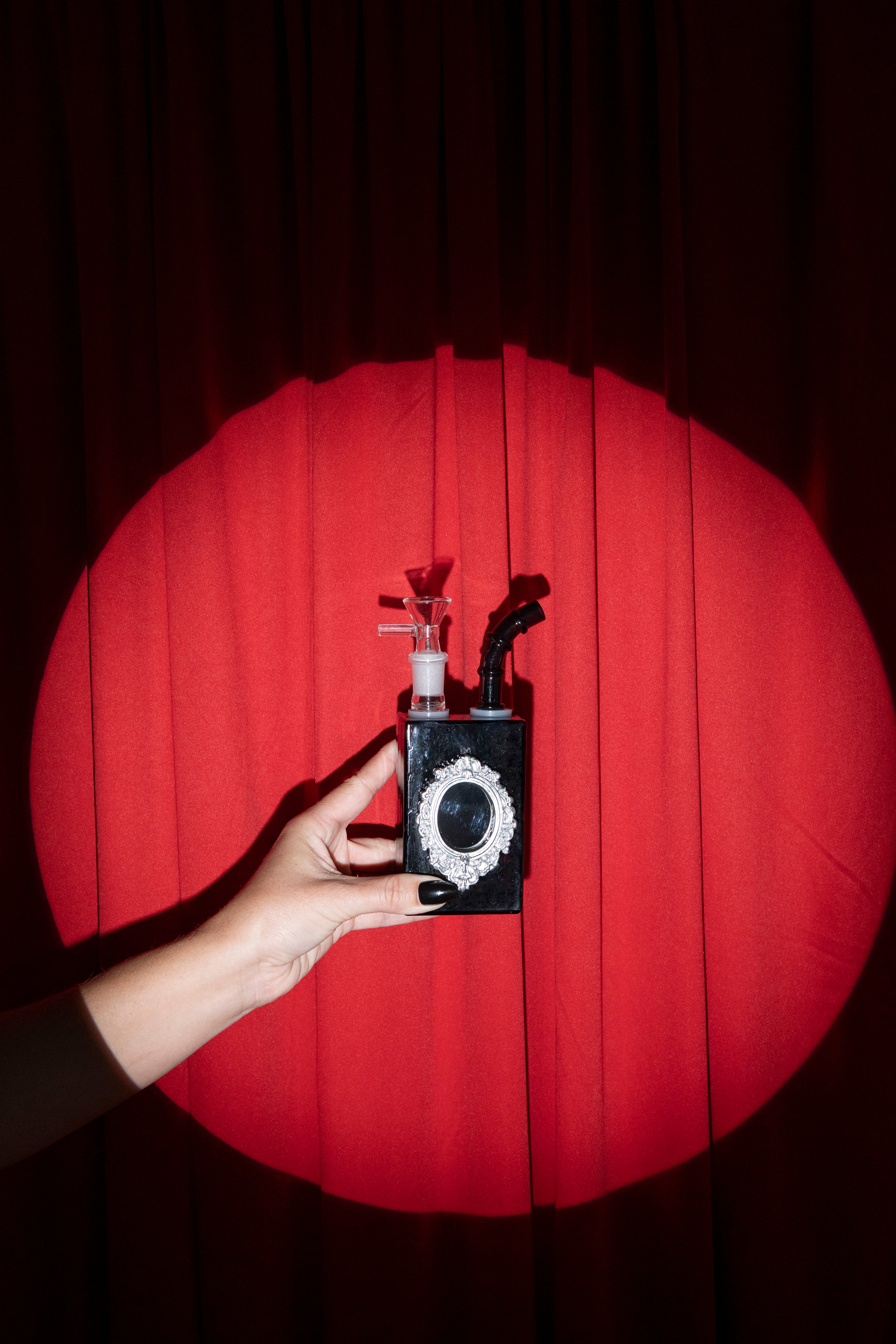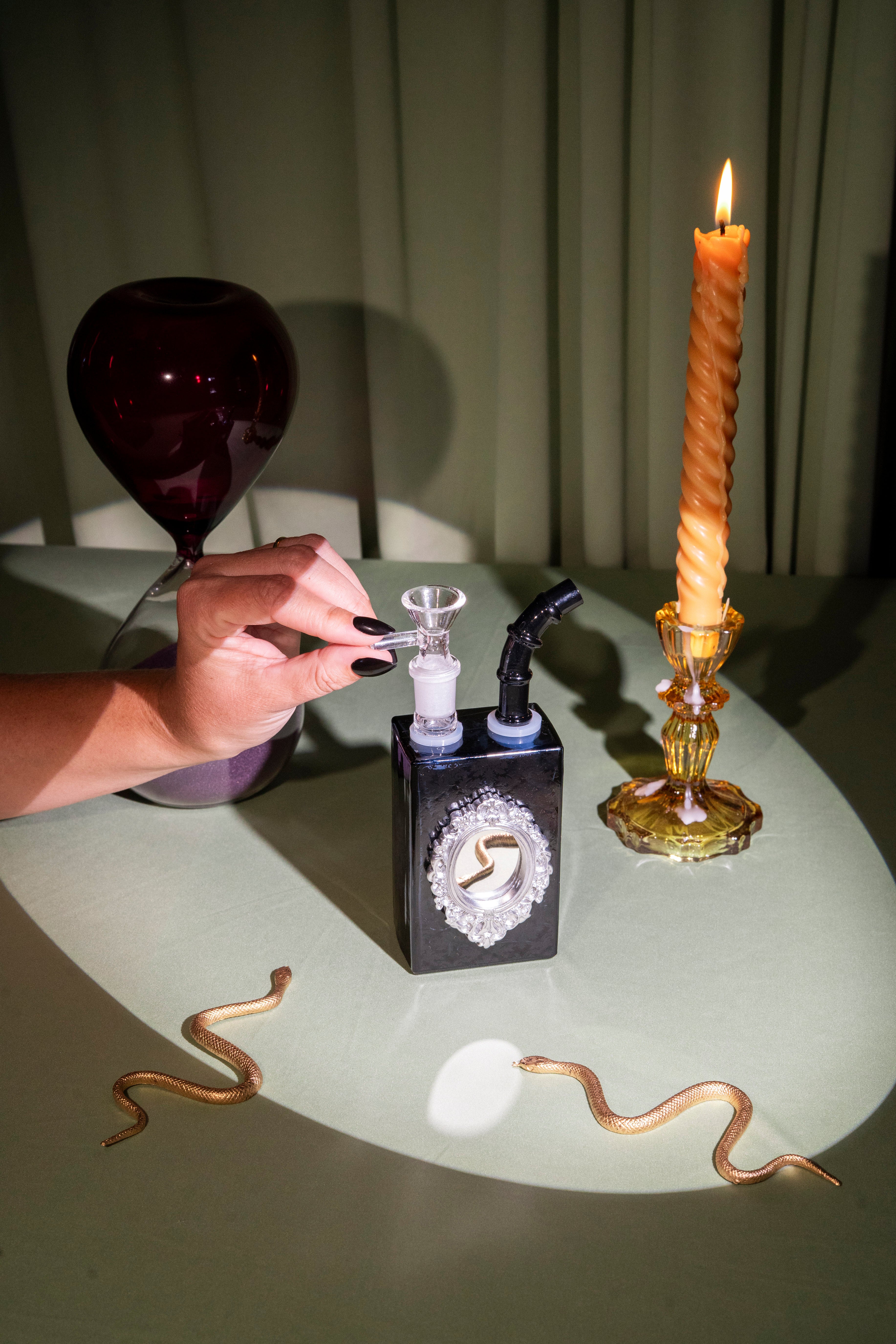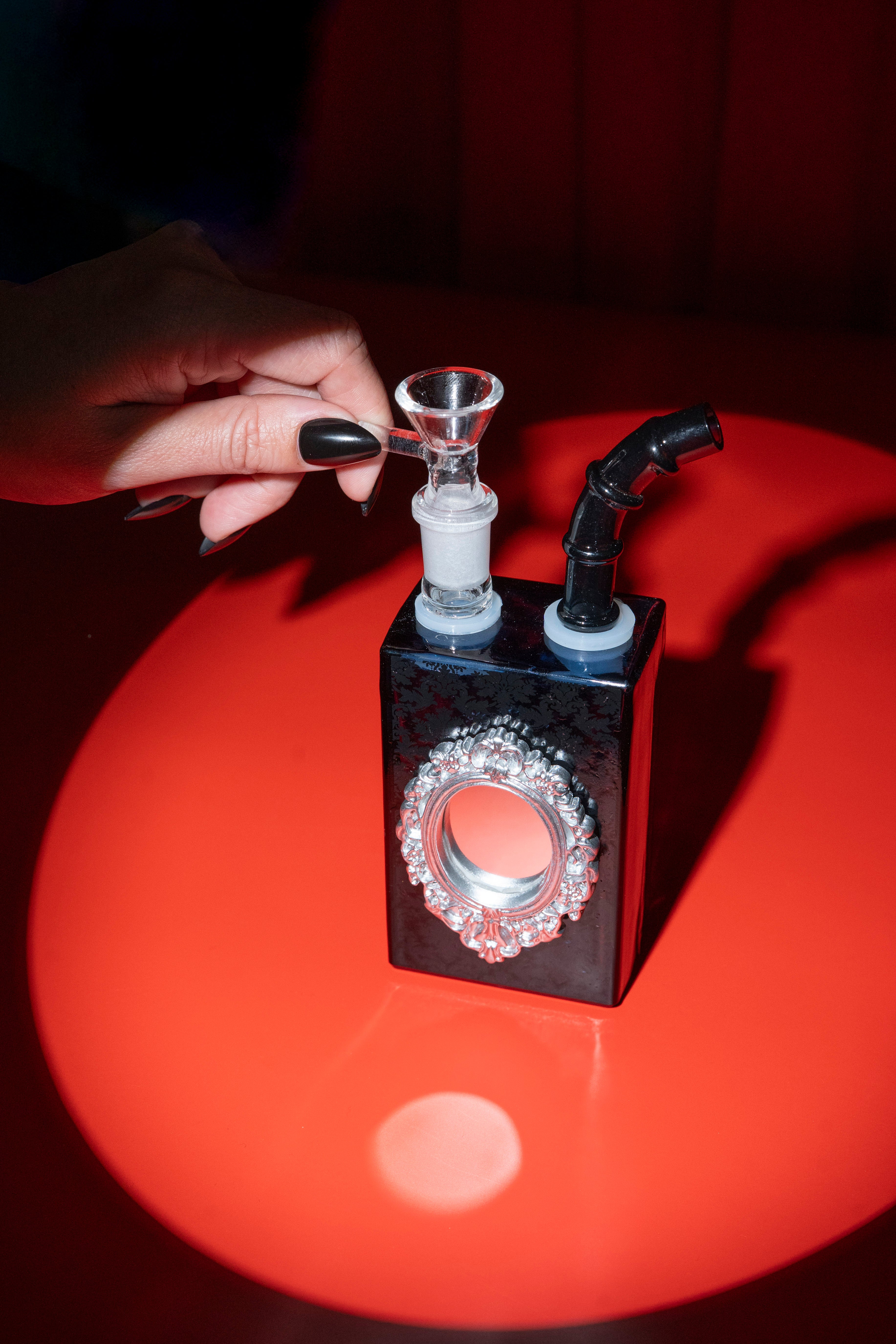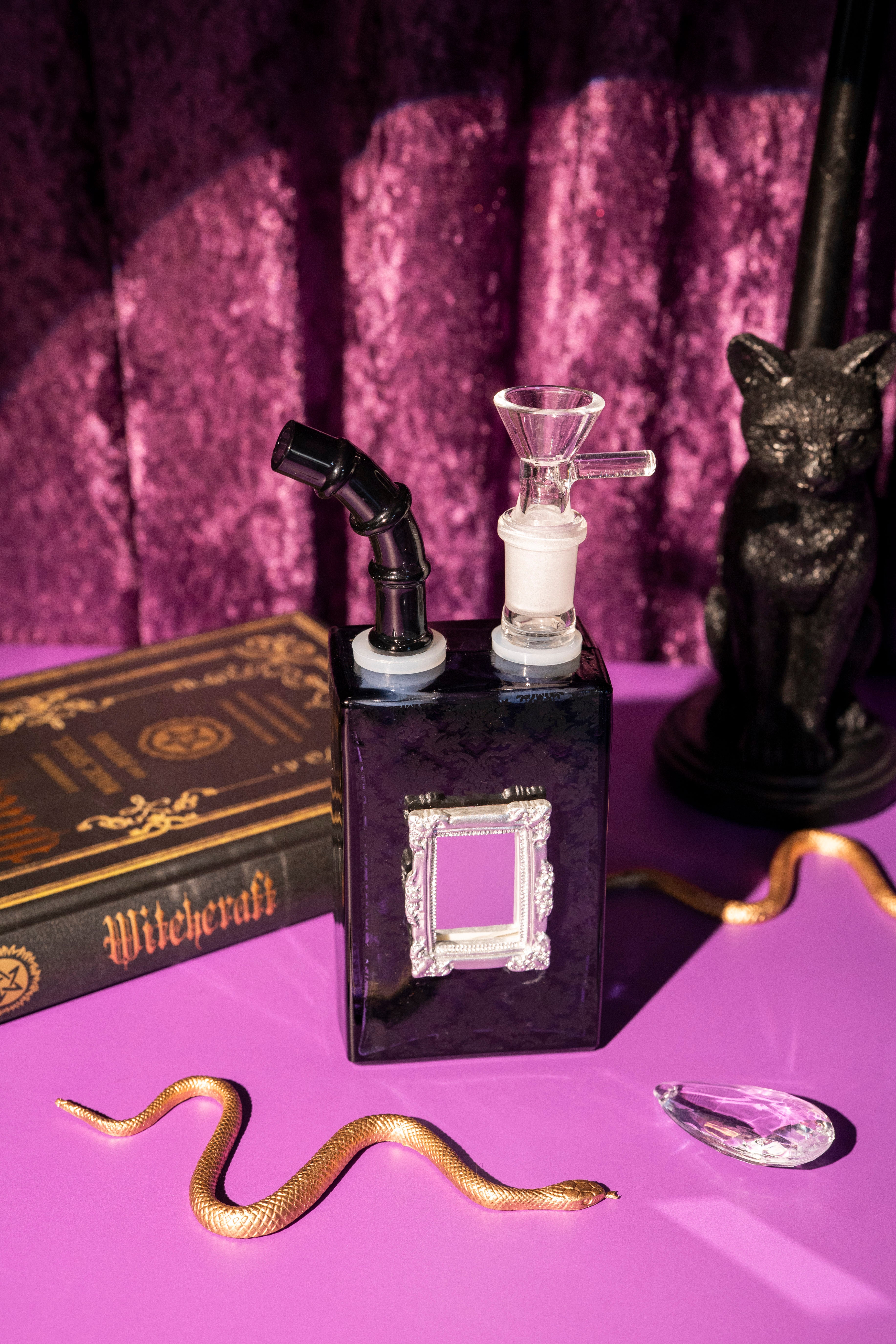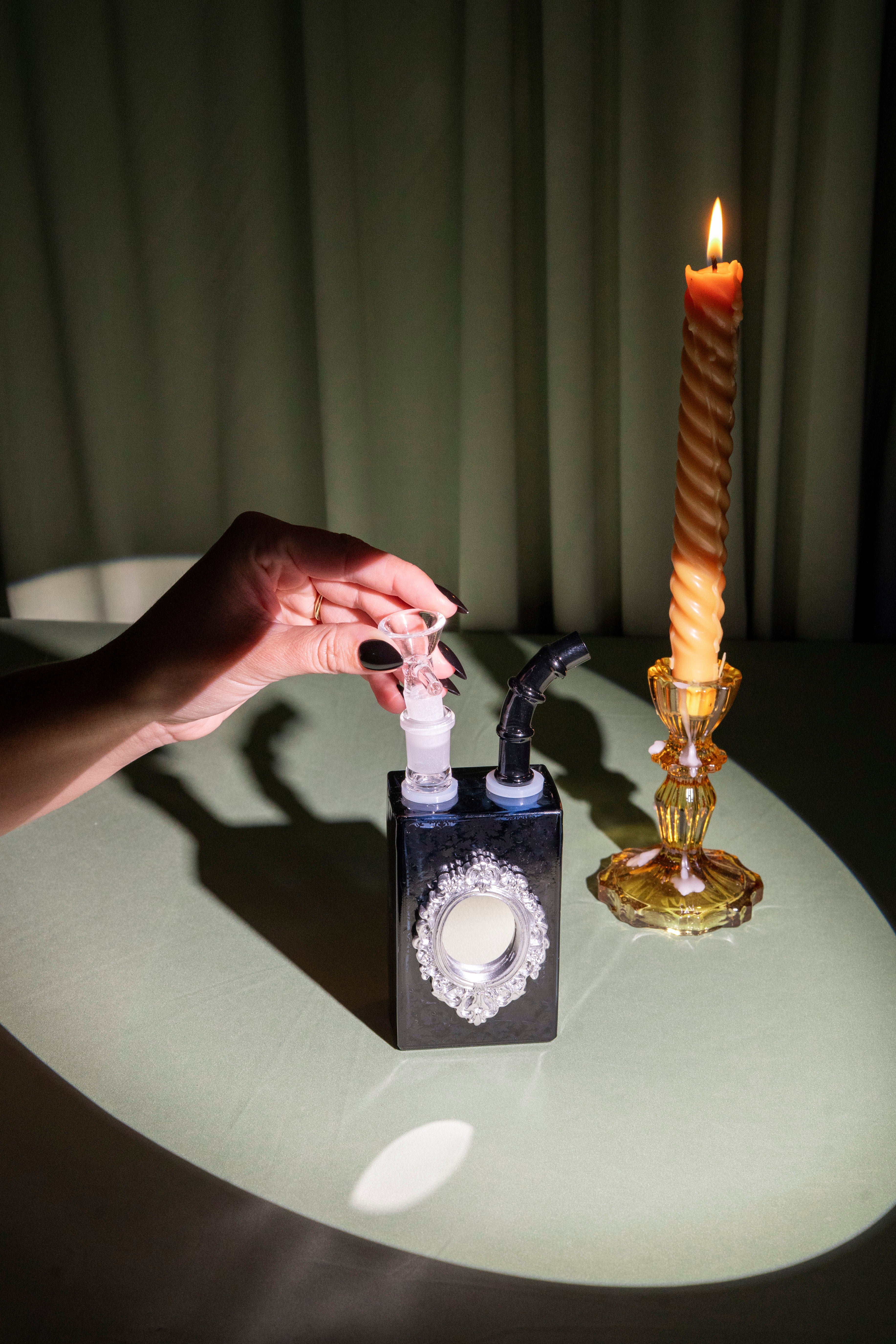 This gothic, juice box style bong is covered in an all over damask pattern and features two vintage-style, fully functional mirrors on each side! Perfect for checking if you're still hot mid sesh (spoiler: you are). It's nice and compact for on-the-go. Just fill her with water and she's ready to go!
