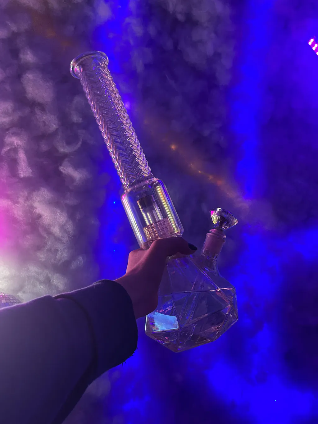 You know what they say, diamond shaped bongs are a girl's best friend! This piece has a gorgeous iridescent finish, a textured glass design on the neck, and even has an extra smoke chamber along the neck with a matrix perc! The super unique multi-faceted base that really shines in the light and would look stunning sitting on a shelf or bar cart when not in use!