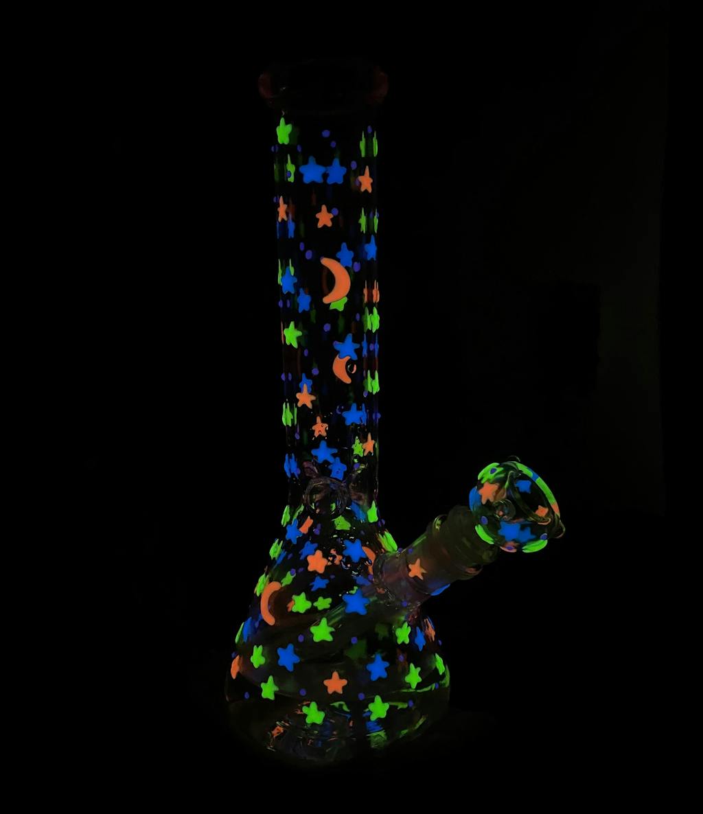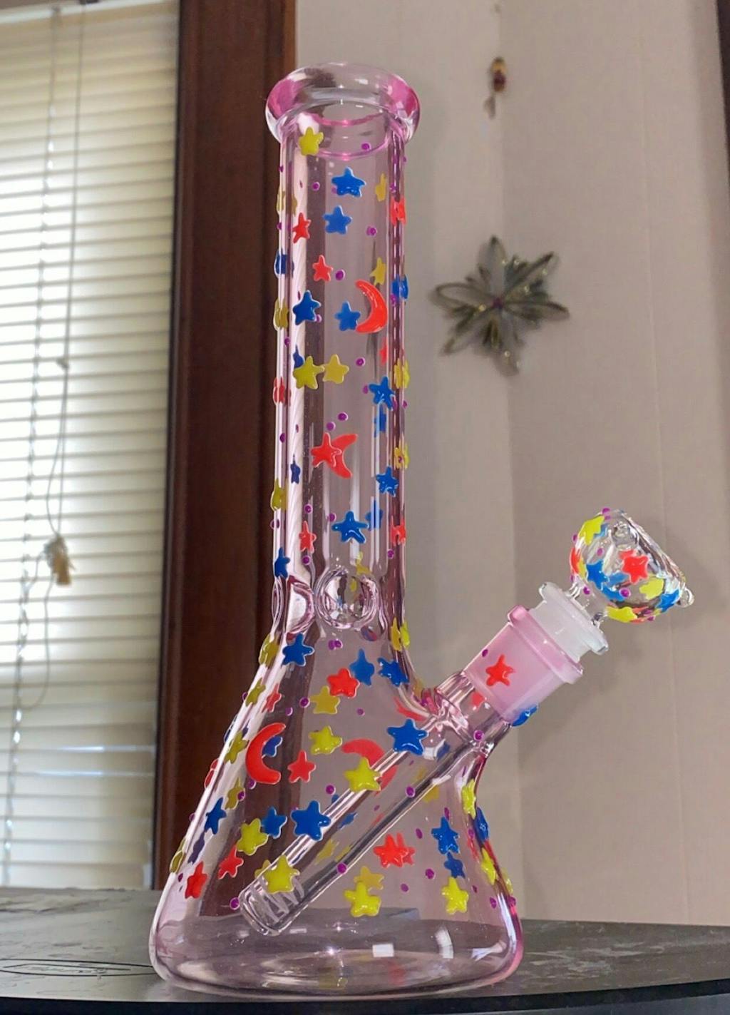 This classic beaker style bong comes in a gorgeous pink color and is covered top to bottom in star+moon puffy paint glow-in-the-dark decals all over!!!! The bong of our dreams. She's got a super sturdy base, perfect if you're accident prone like us - and she even has a built in ice catcher!