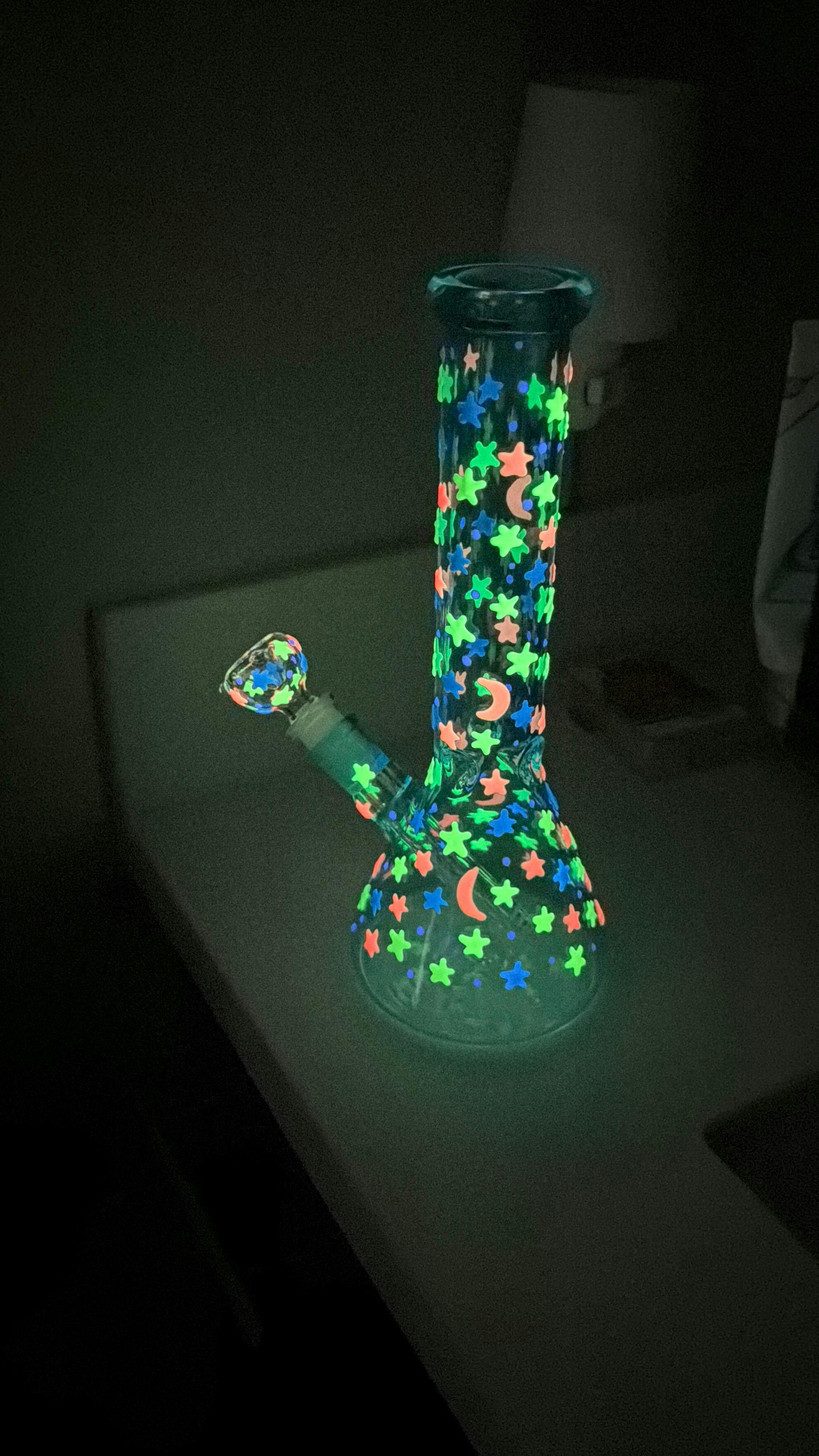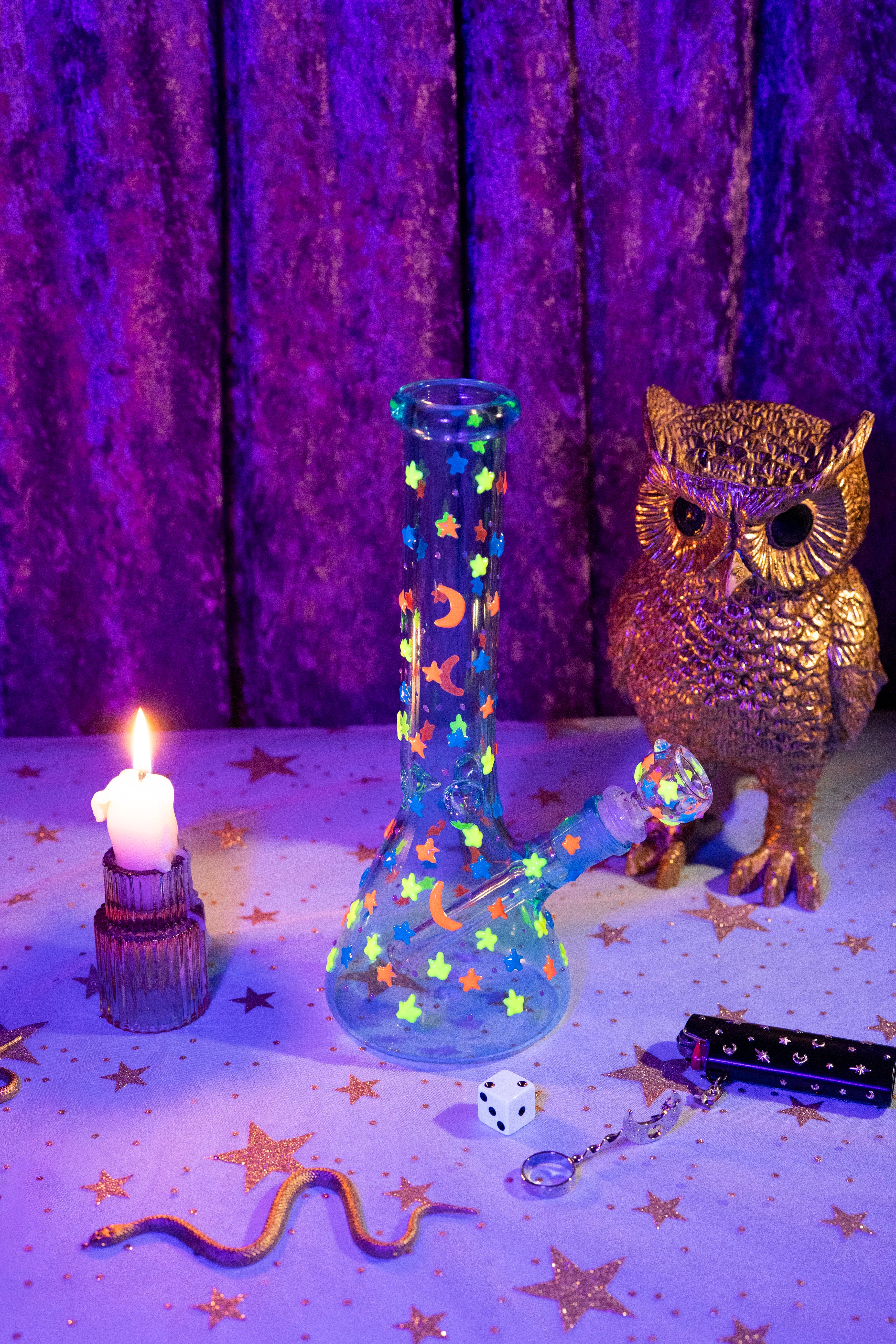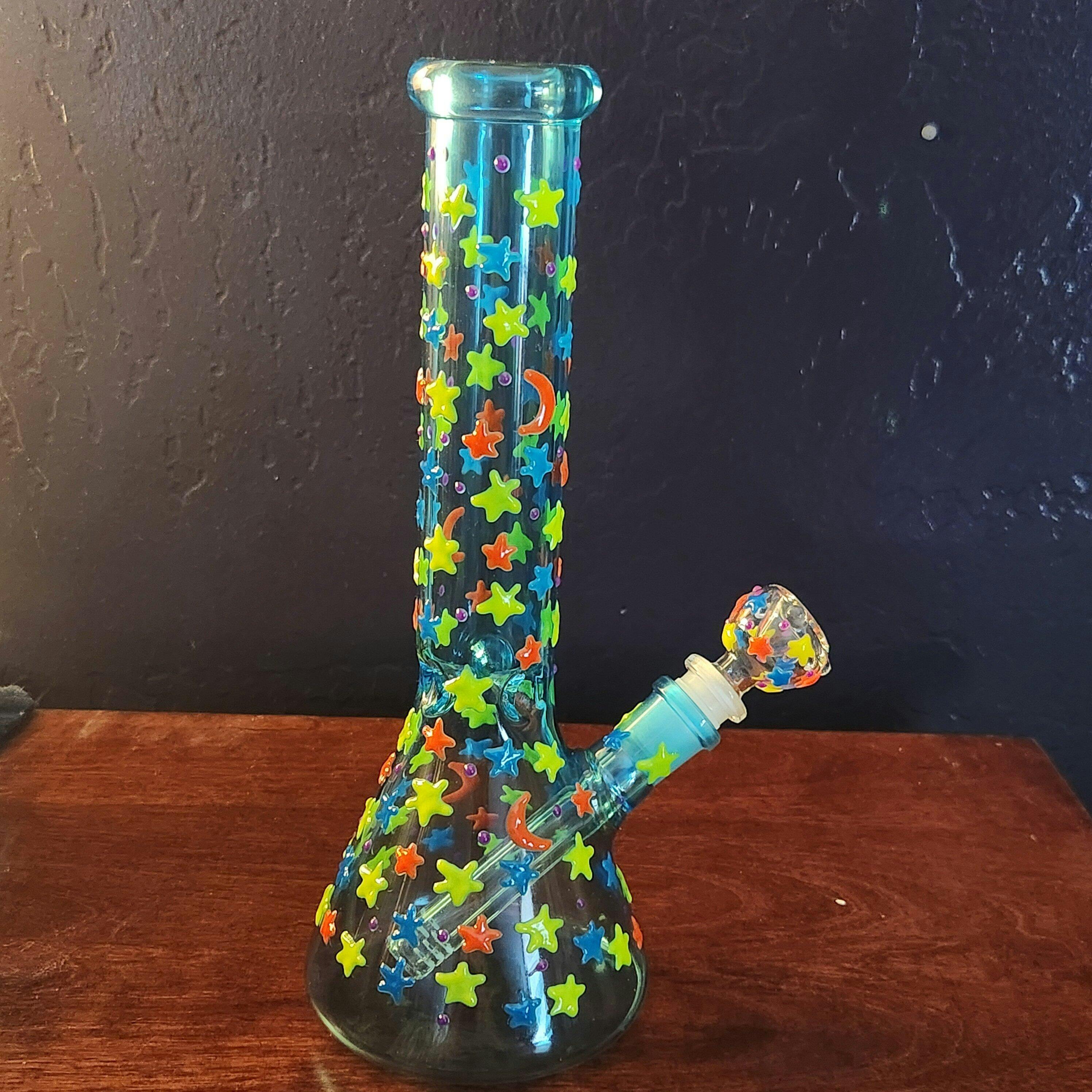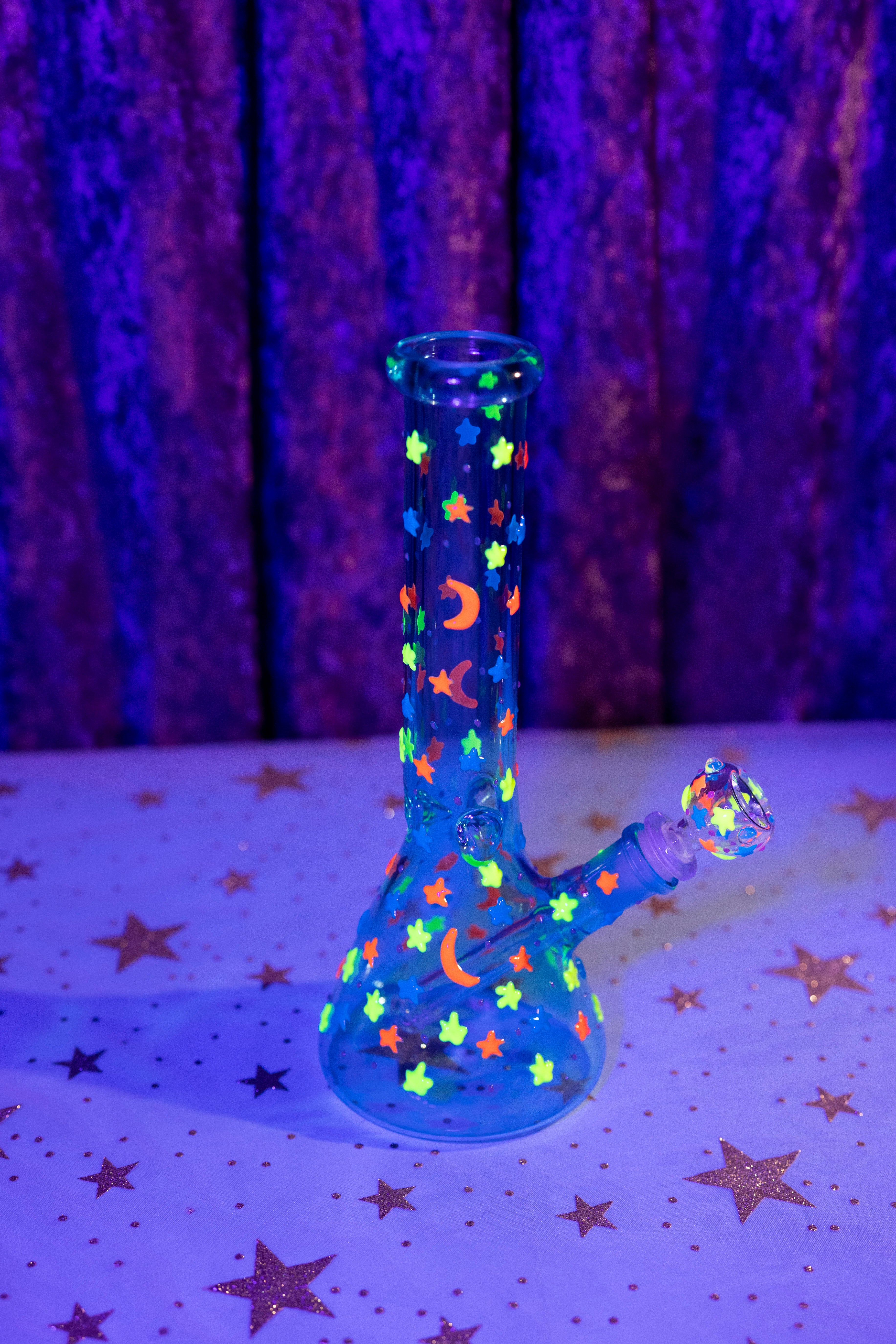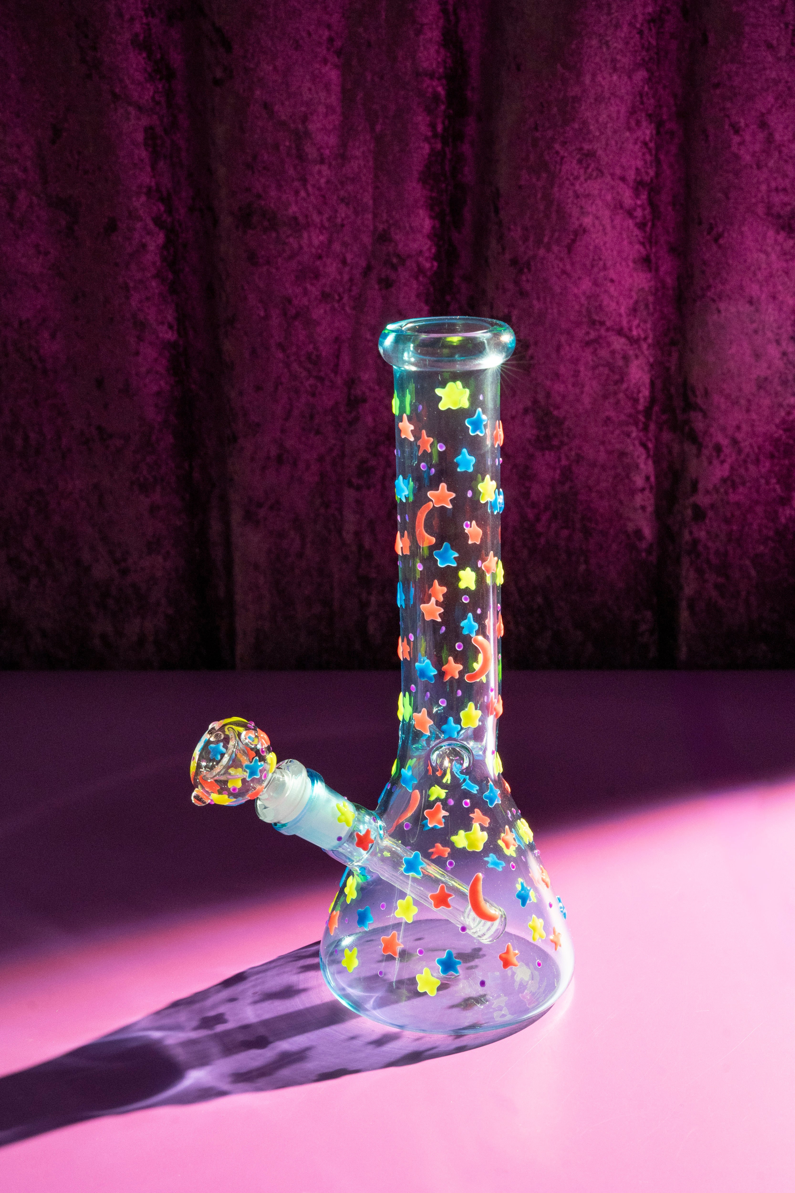 This classic beaker style bong comes in a gorgeous blue color and is covered top to bottom in star+moon puffy paint glow-in-the-dark decals all over!!!! The bong of our dreams. She's got a super sturdy base, perfect if you're accident prone like us - and she even has a built in ice catcher!