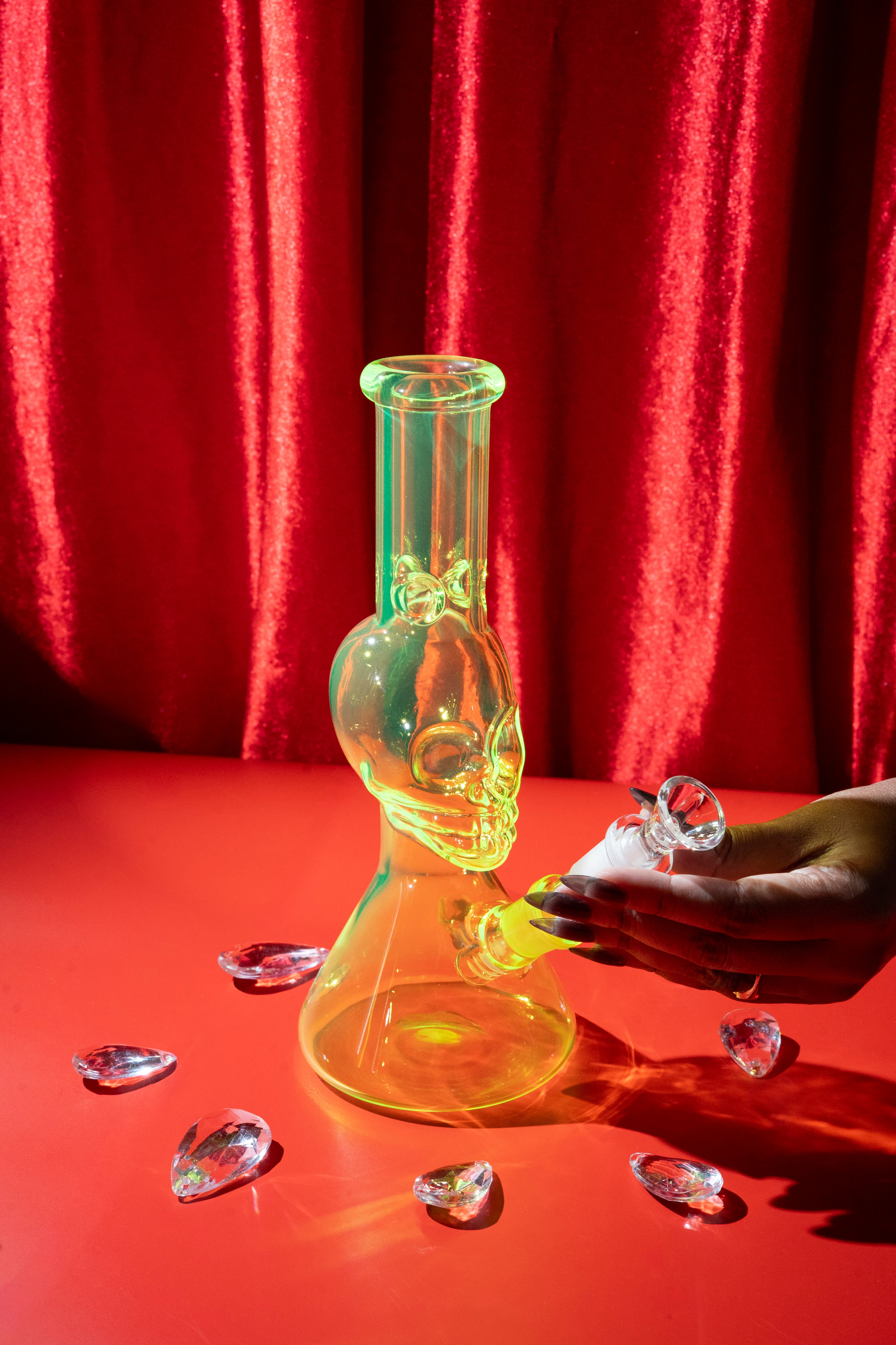 This bong features an extra, skull-shaped smoke chamber along the neck! It has an all-over slime green finish, a super sturdy beaker style base (perfect if you're accident prone like us), and an ice catcher!