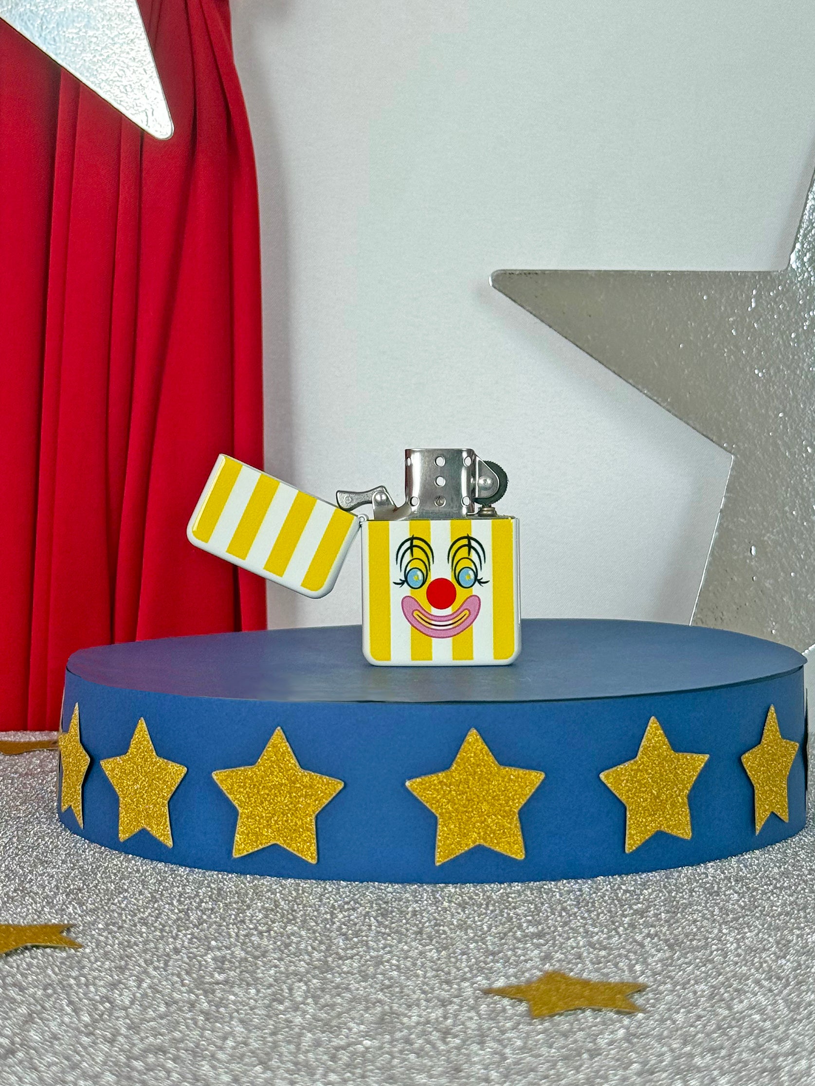 The front of this lighter has a white and yellow striped design and features an iconic smiling clown face! The back has a red and white striped design. Perfect for lighting cigarettes, candles, or whatever else you need a fire for!