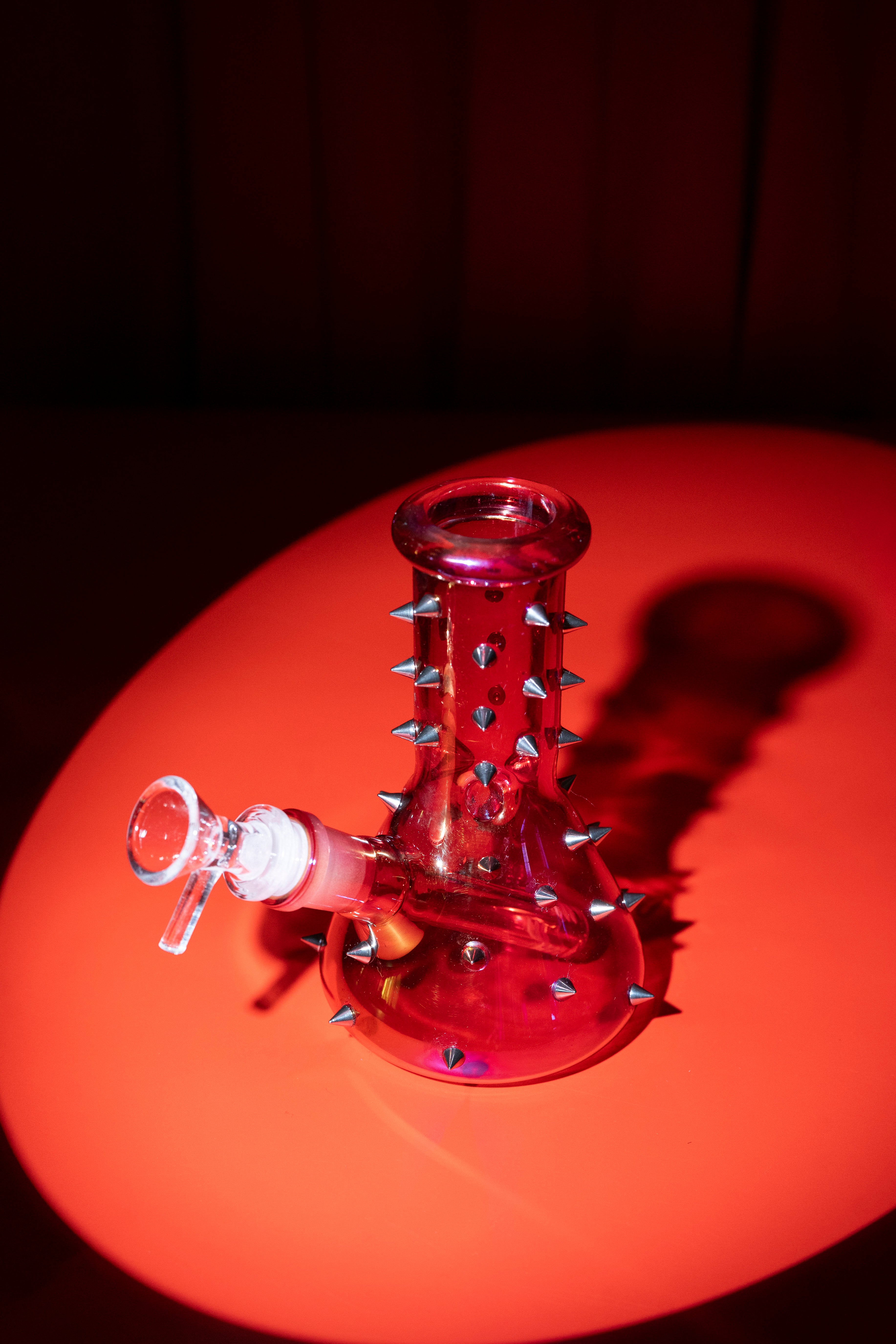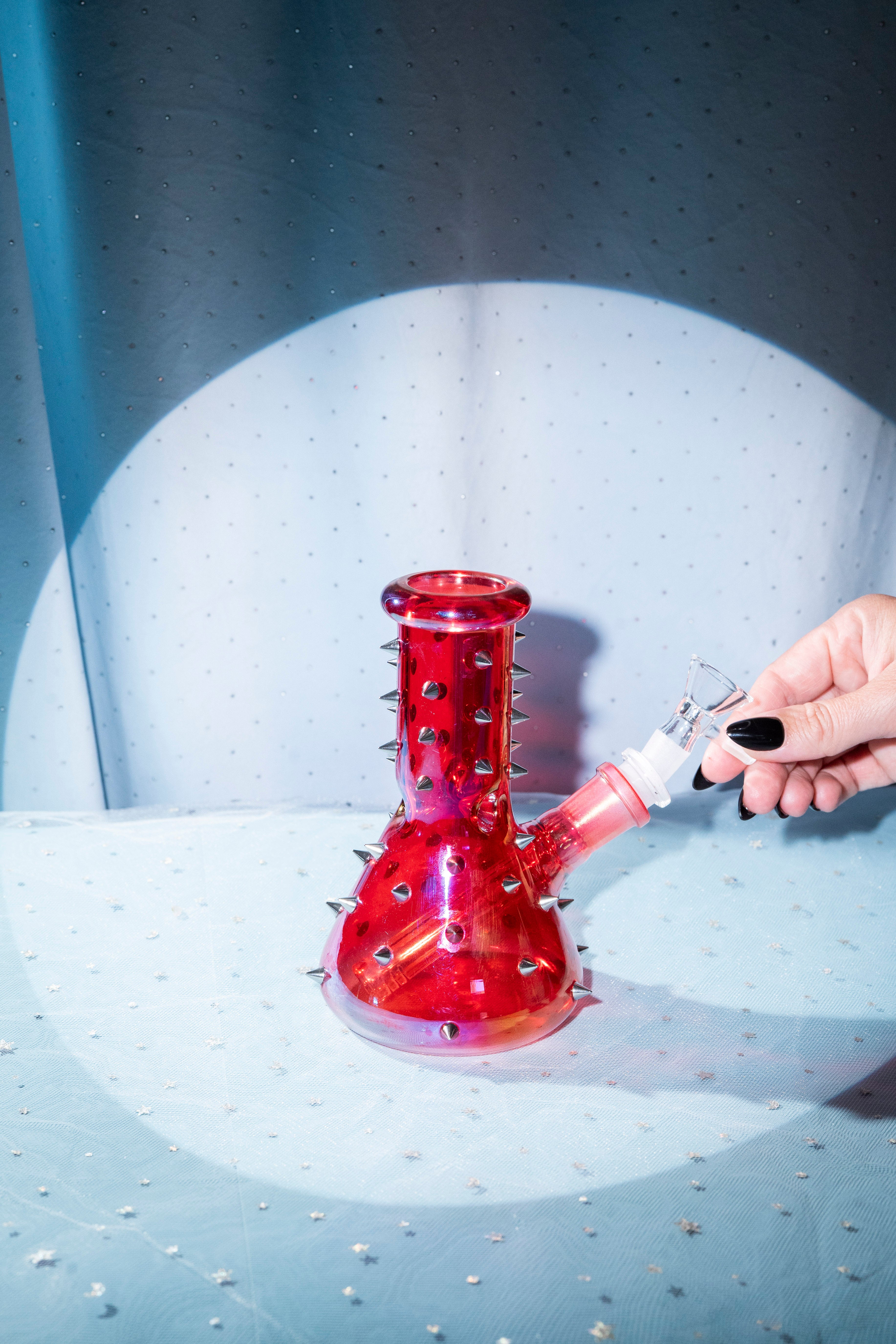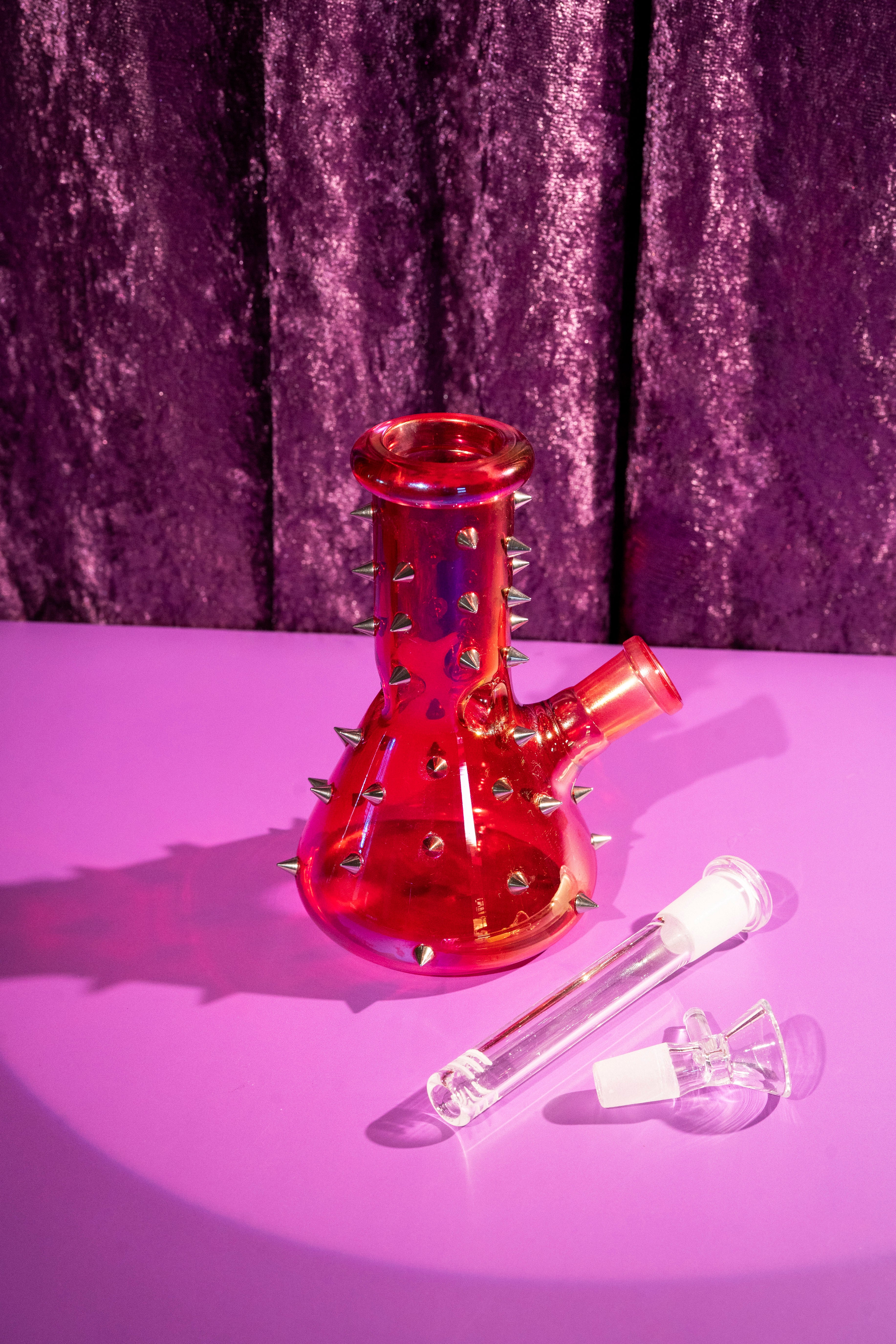 This mini beaker bong is giving early 2000's Avril and we are so here for it! It's covered top to bottom in silver spiky studs! Iconic. It's even got an ice catcher and the iridescent finish completes the look. Just fill her with water and she's ready to go!