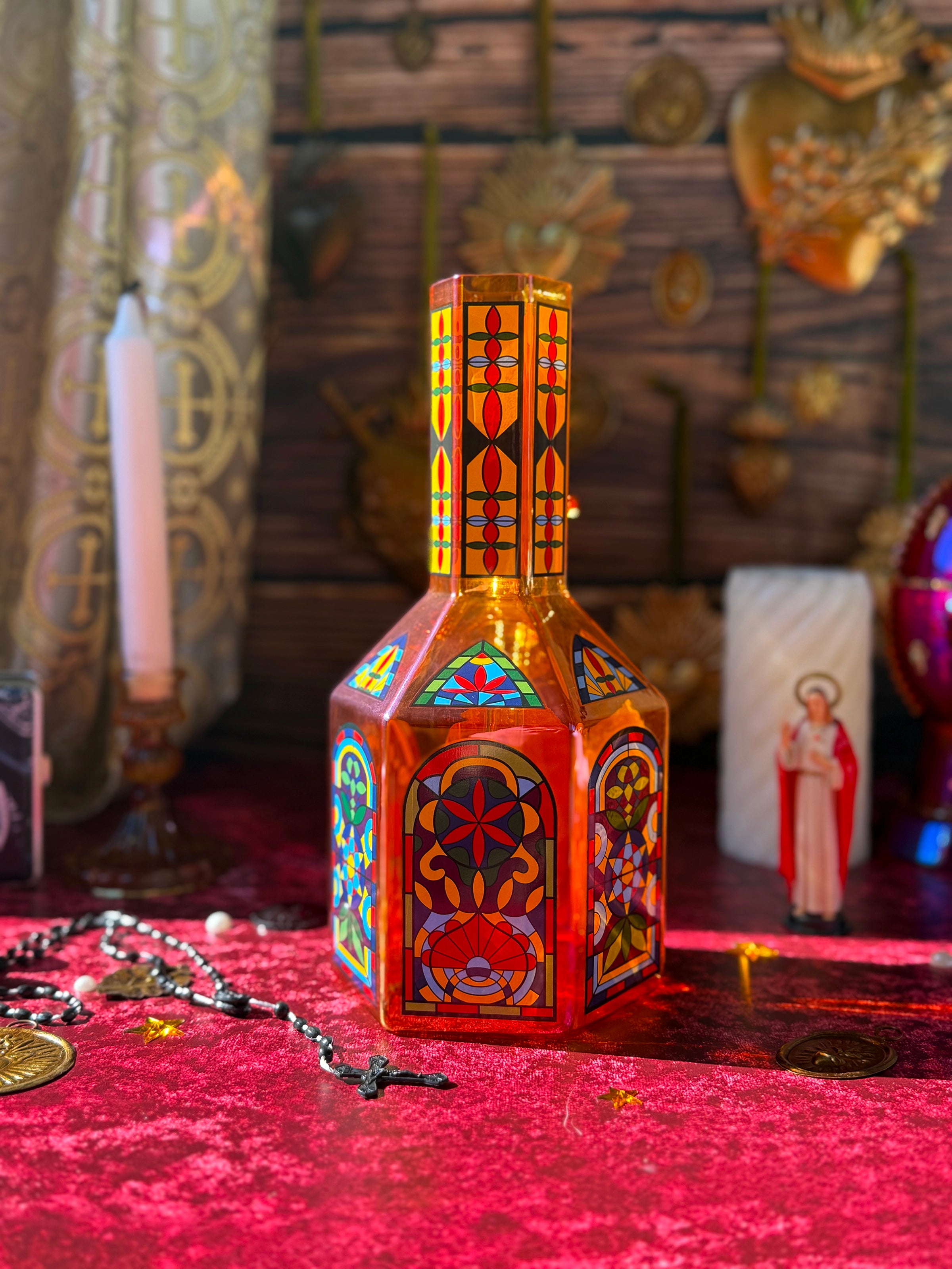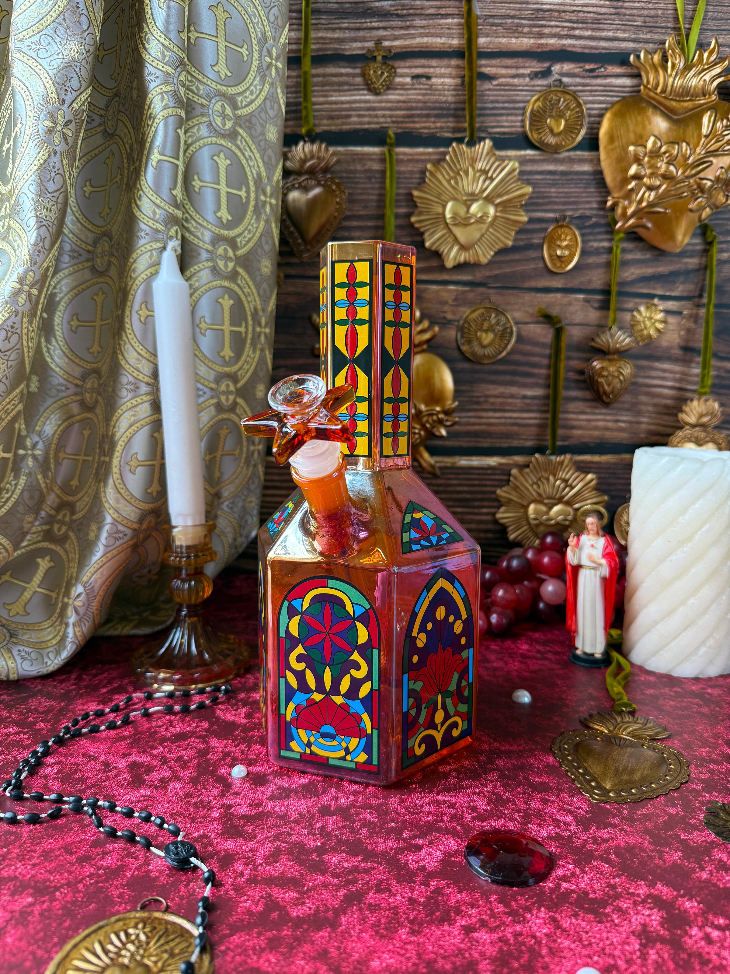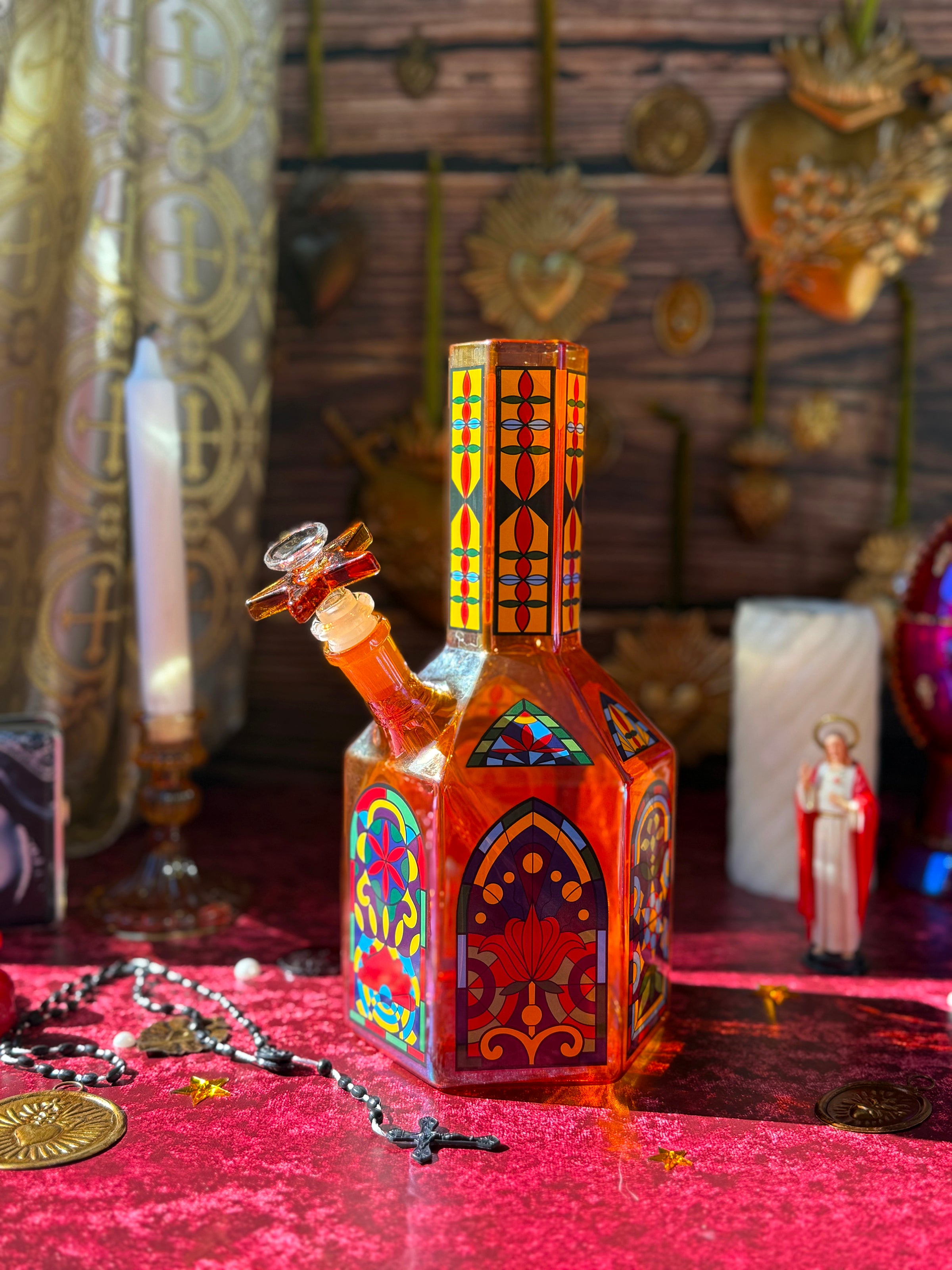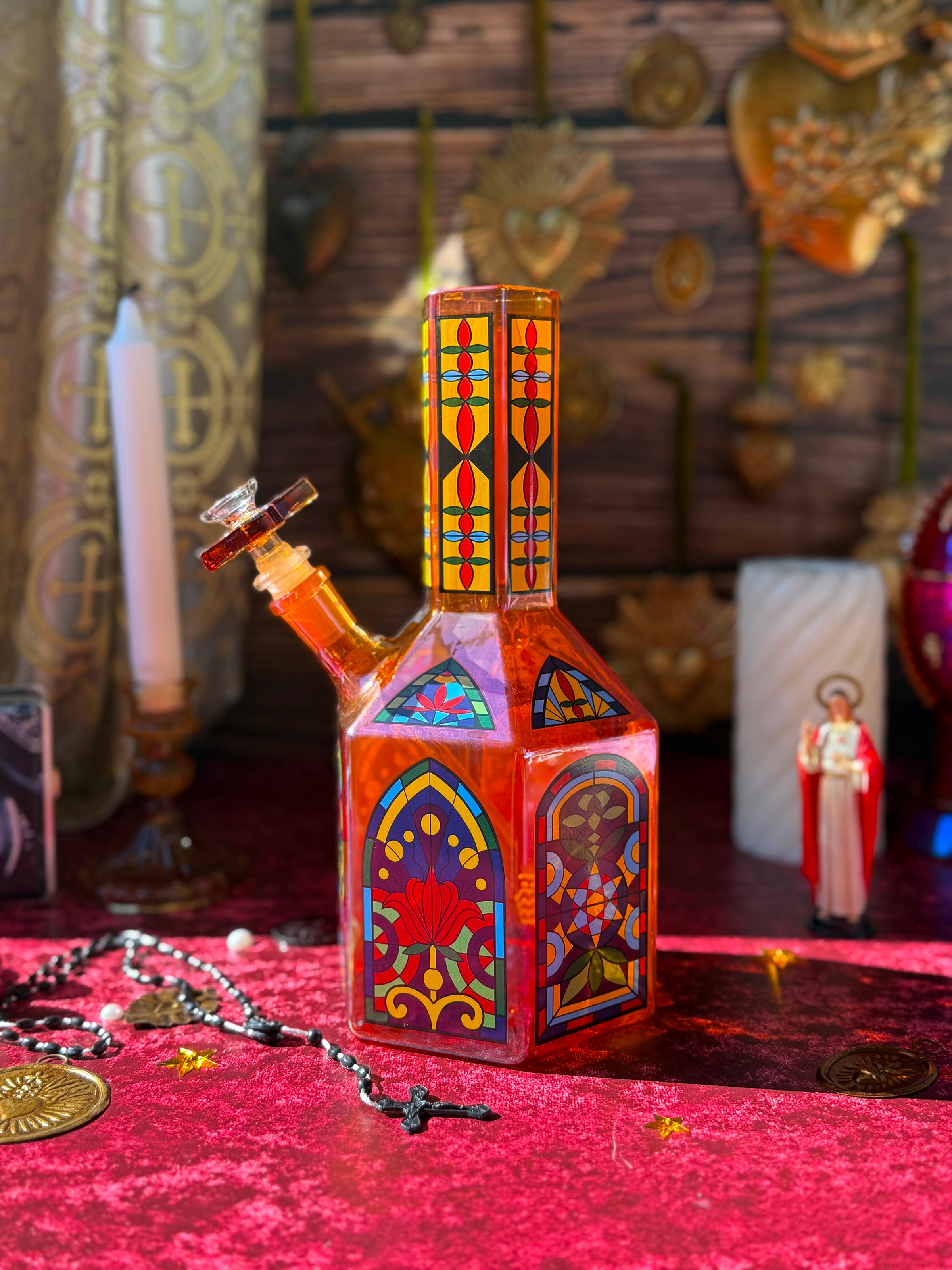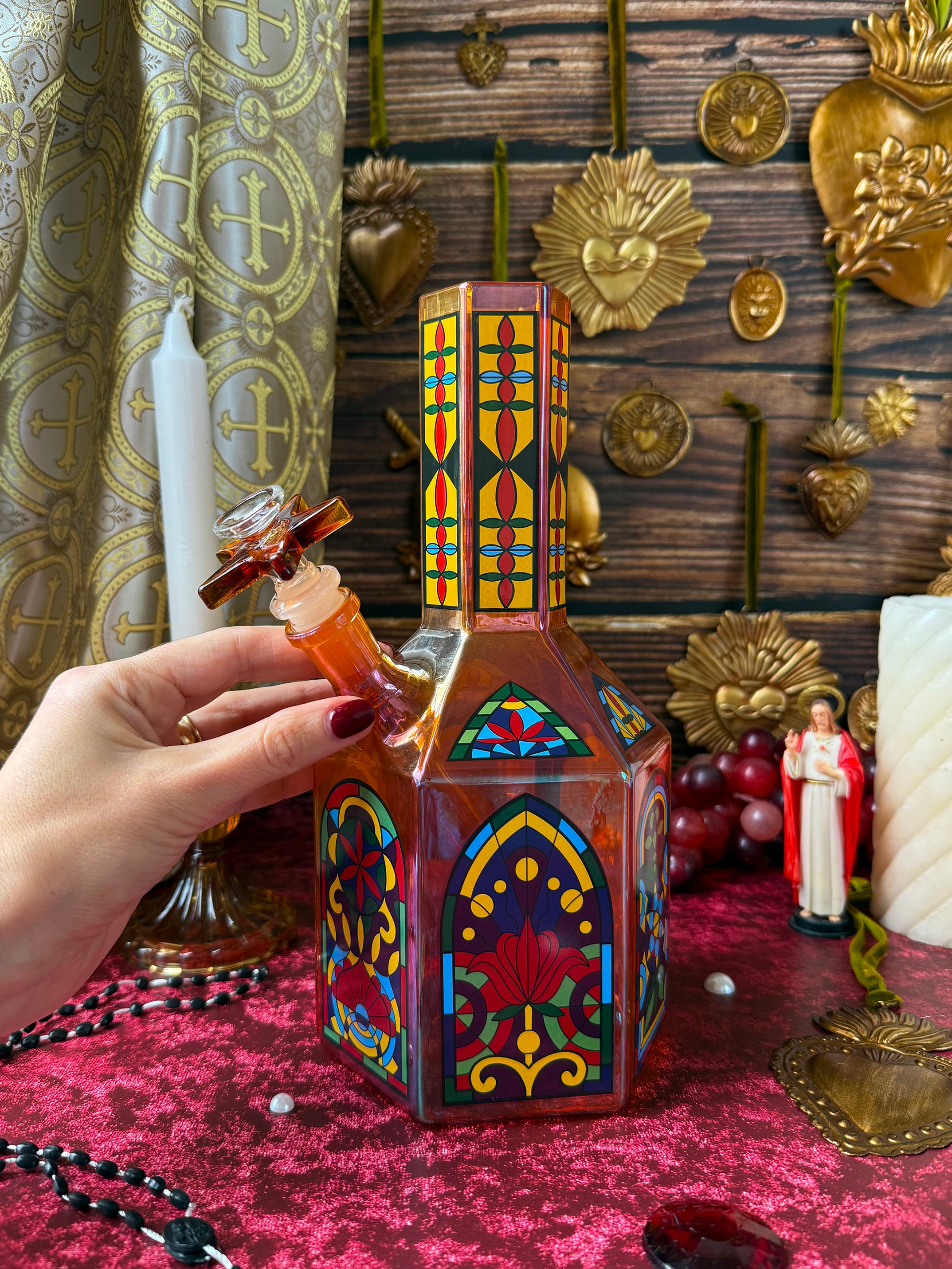This bong is giving major cathedral vibes! Yes, you saw it right- each side of this hexagonal shaped bong features a stained glass window inspired pattern! A super sturdy base keeps her stable, perfect if you're accident prone like us - and she even has a built in ice catcher for some super smooth hits! This baby's got a huge smoke chamber - so you know she packs a punch! Would look stunning on a bar cart or shelf when not in use.