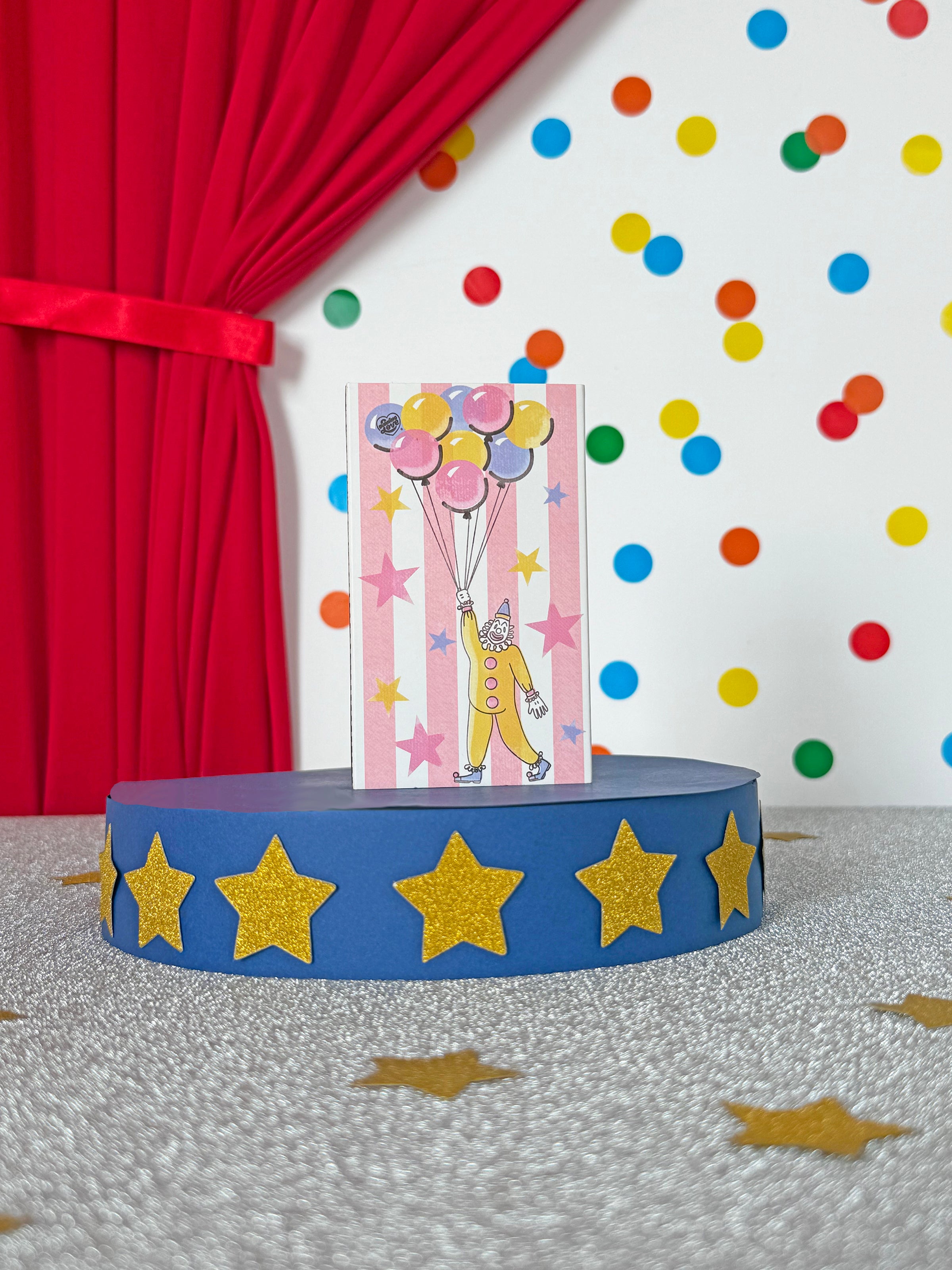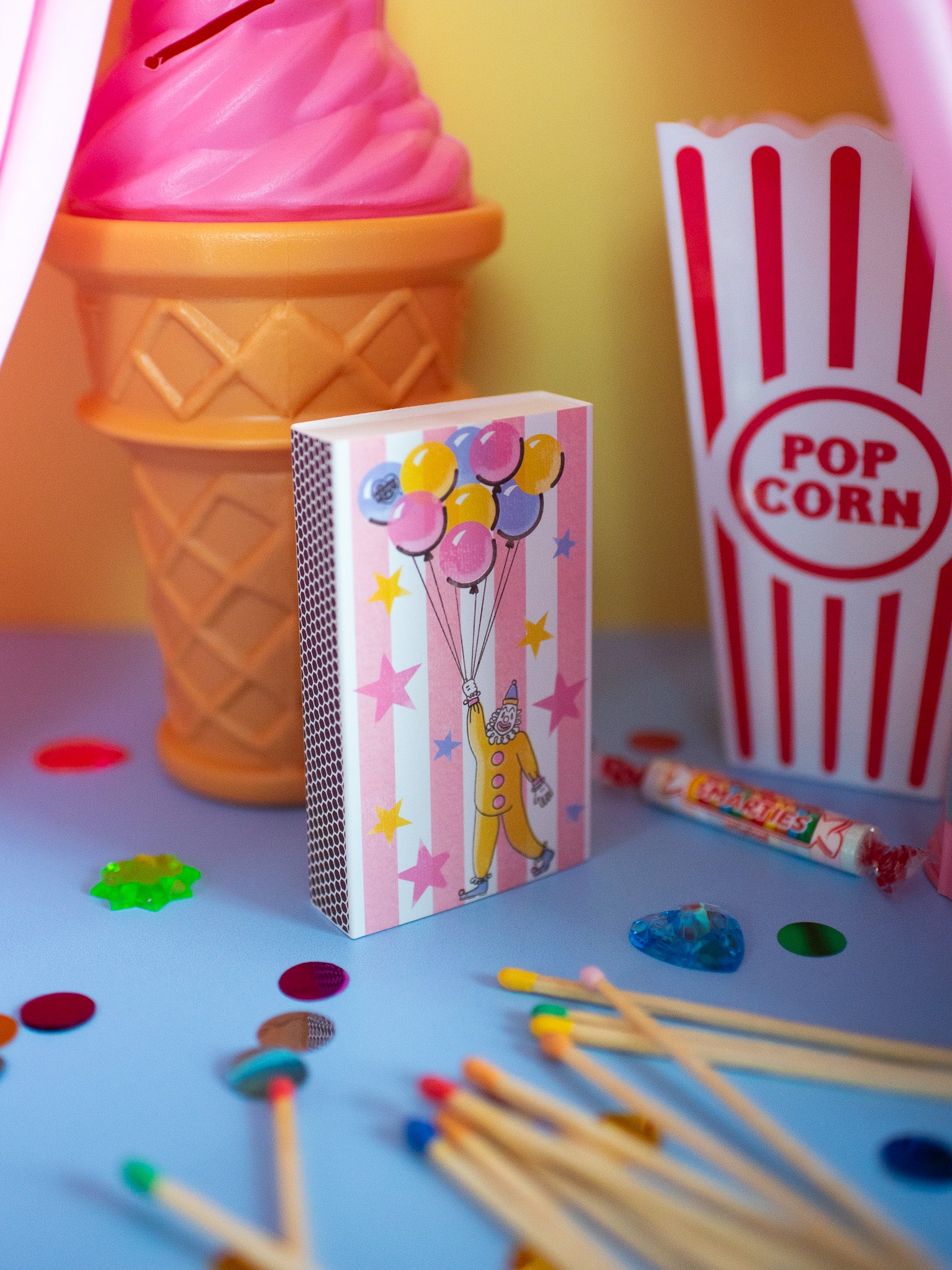 The match box features a cute clown floating away on balloons against a whimsical pink and white striped background! The design is double sided.