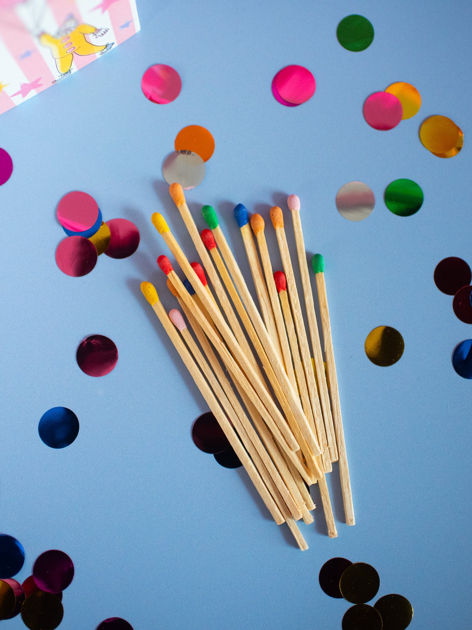 Comes with large, rainbow tipped matches! The striker is on the side of the box.