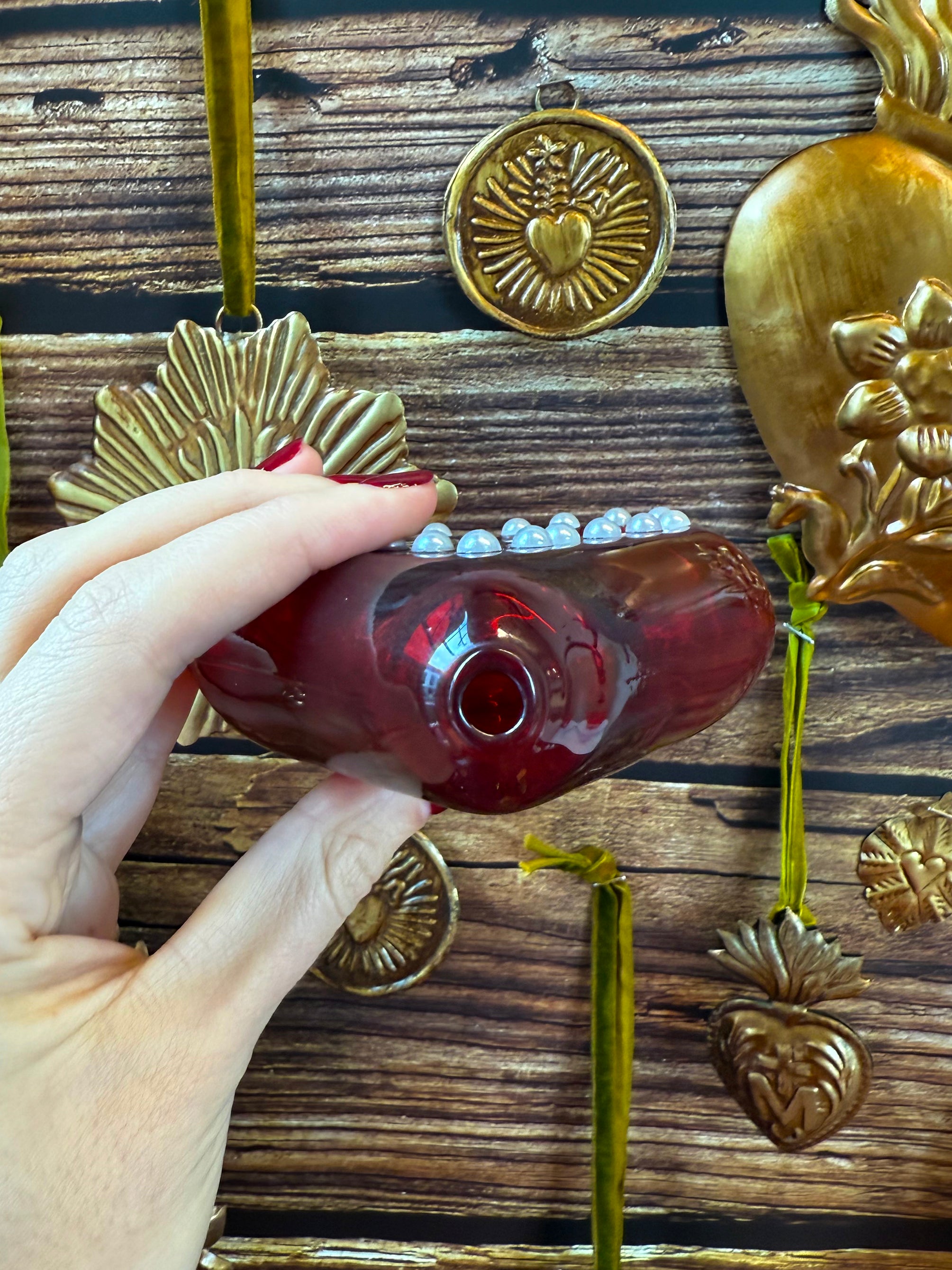 This heart-shaped piece is serving sacred, sanctimonious Catholic guilt! This pipe features a stunning 3D rosary design complete with pearls and gold leaf! It fits comfortably in your hand and rests flat on a table so you don't have to worry about it rolling away.