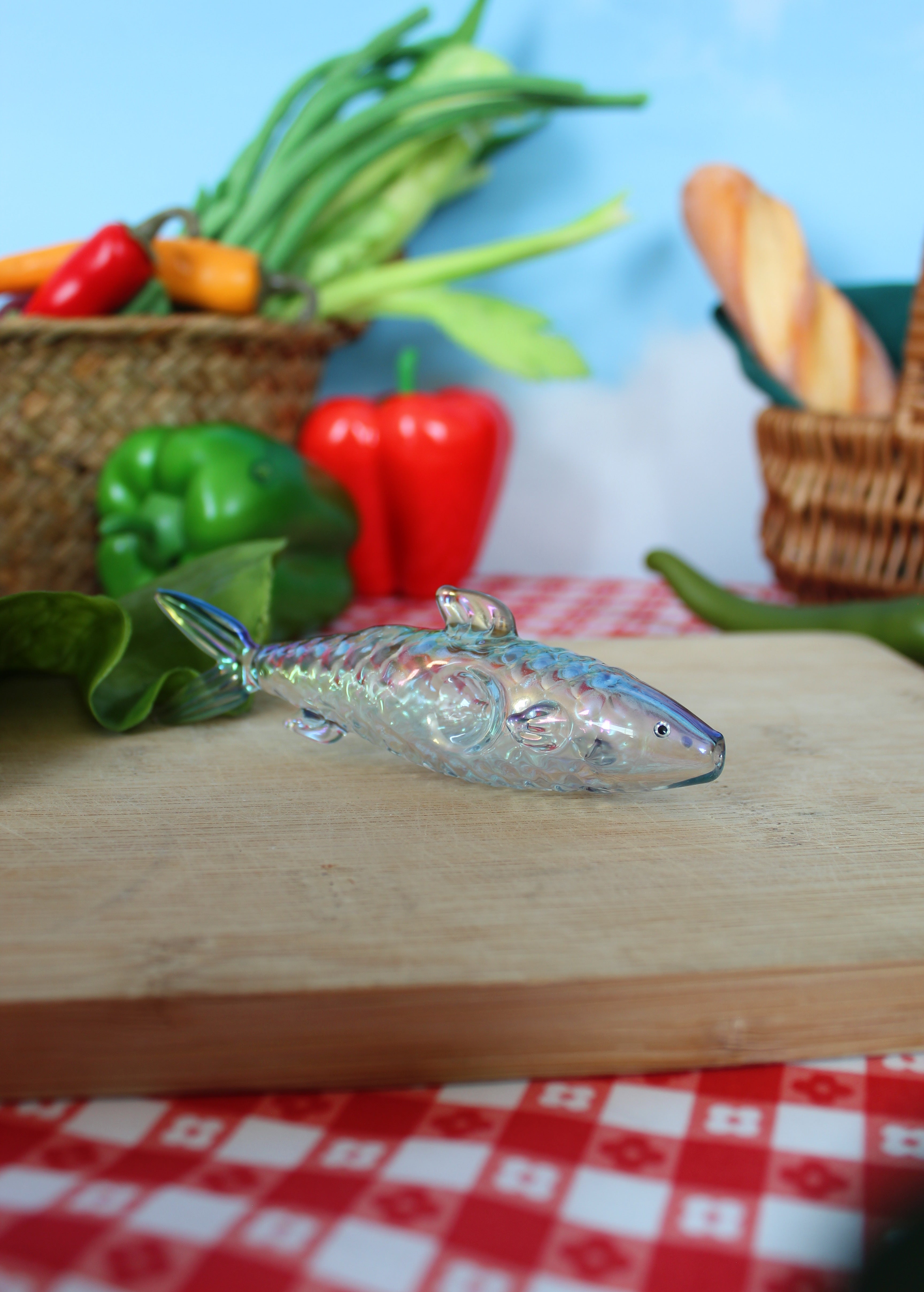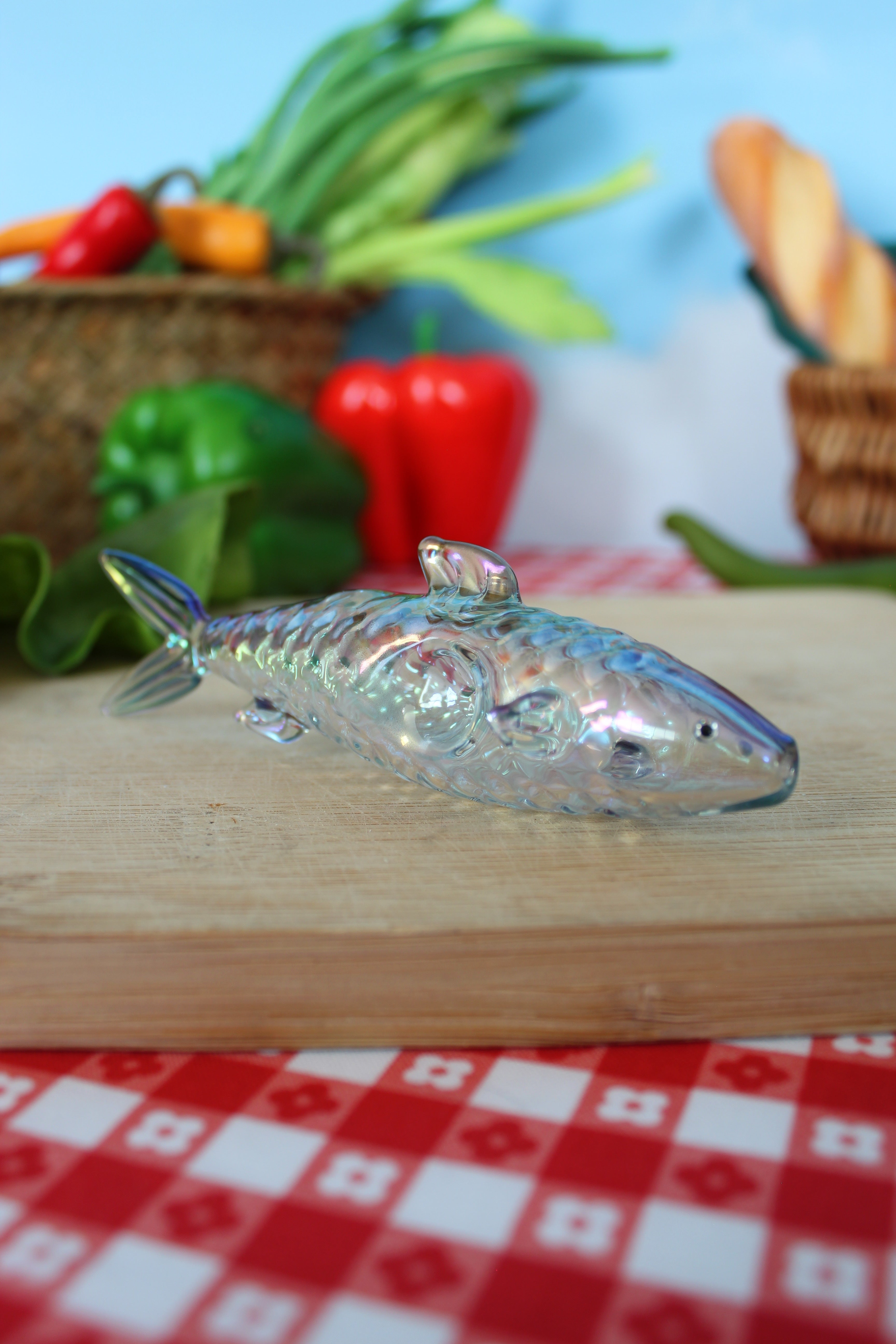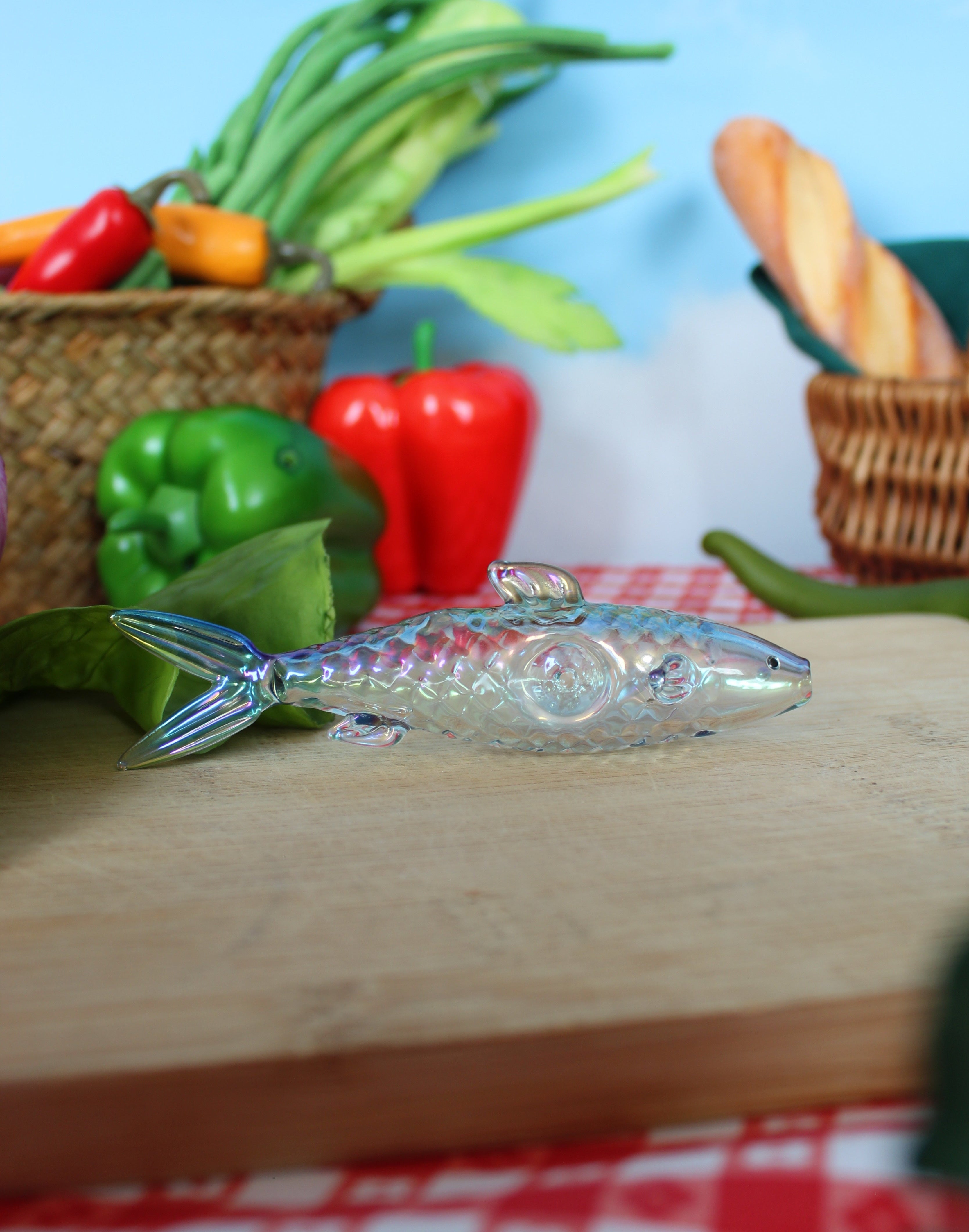 This sardine-shaped piece features a gorgeous iridescent shine, textured scales and fins, and even has the sweetest little face details! Perfect for a 'lil solo sesh or for bringing on-the-go for tiny hits of joy!