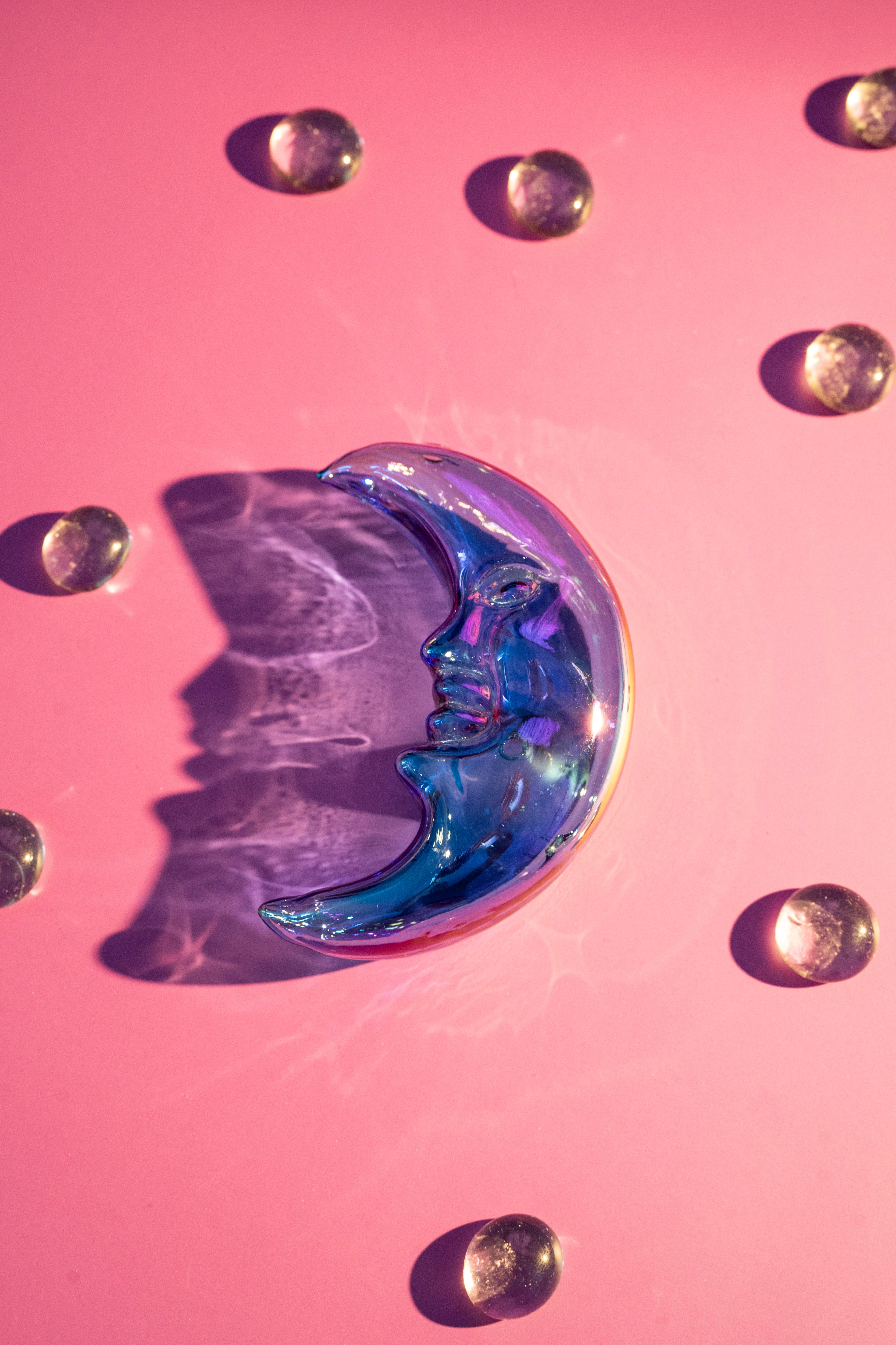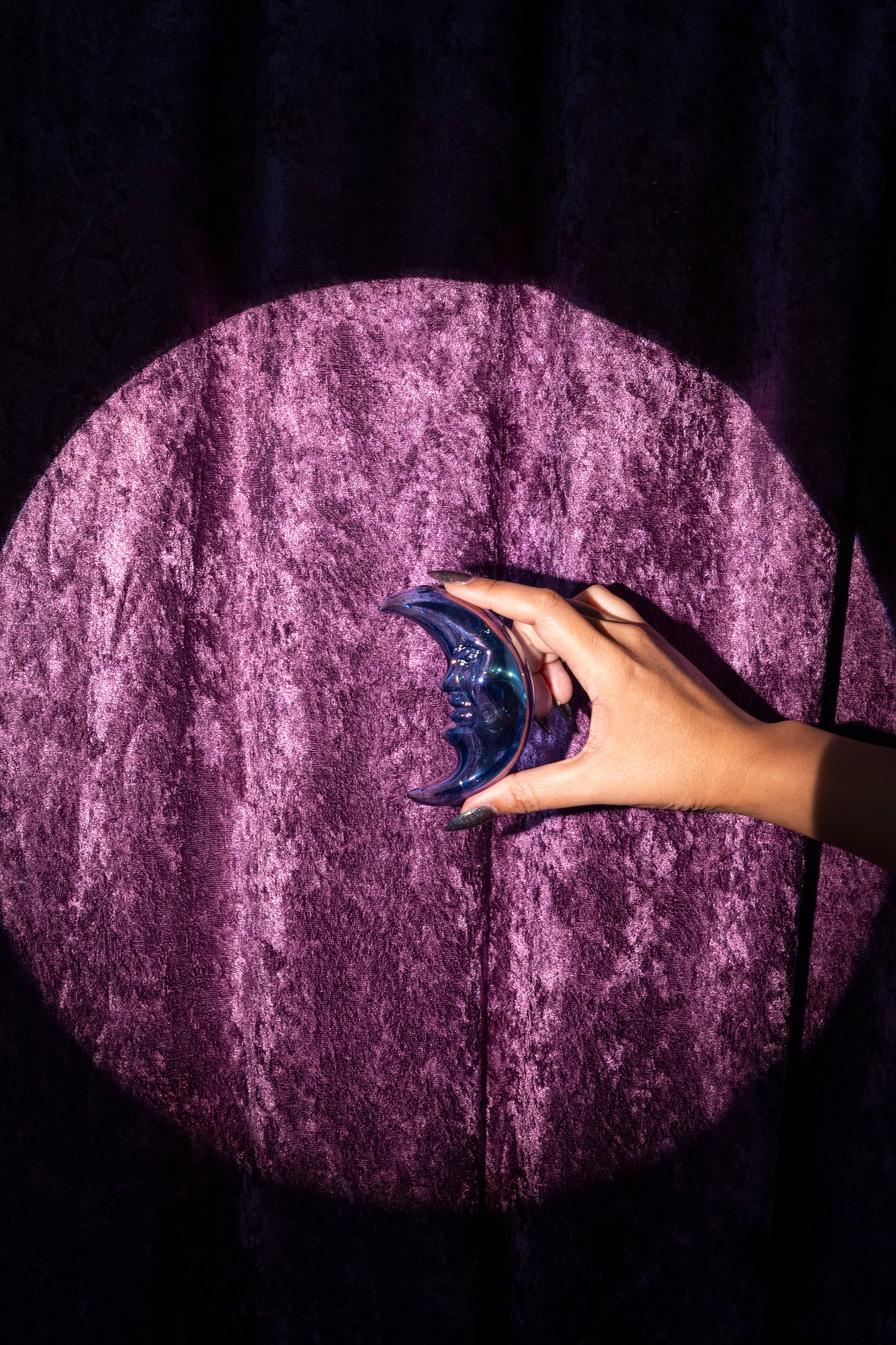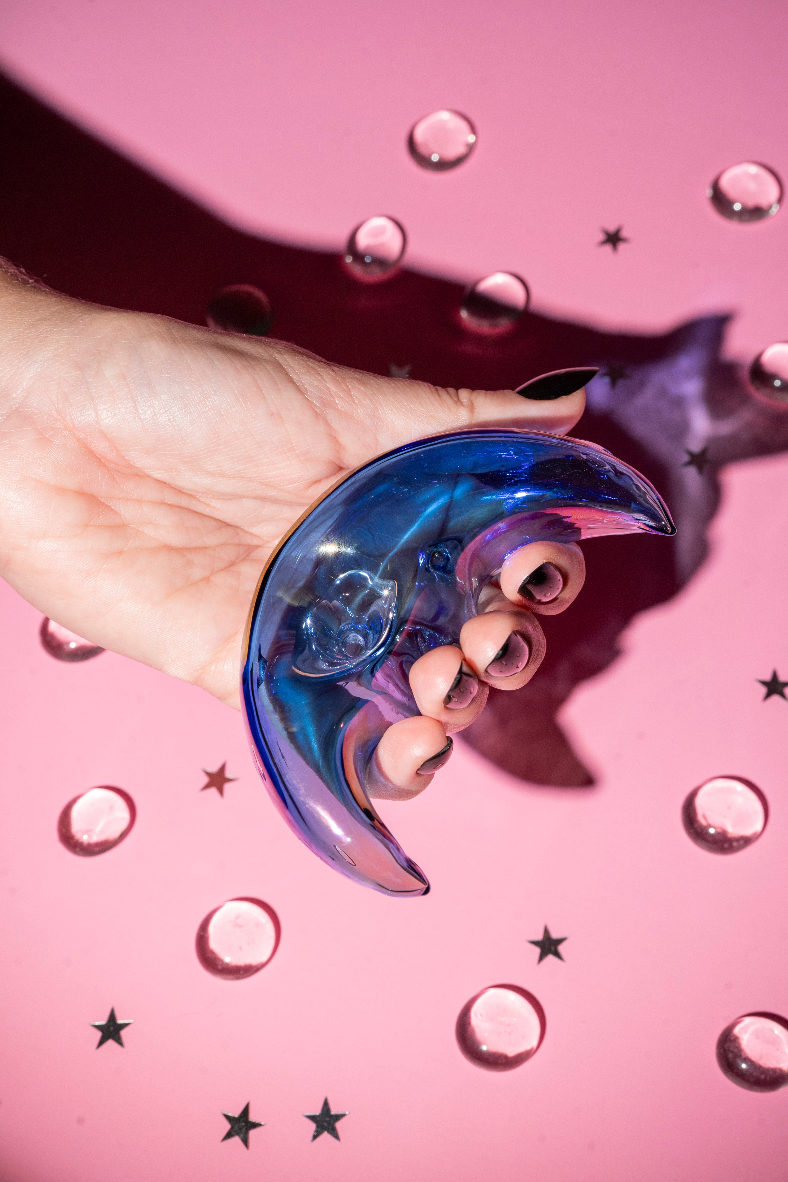 This crescent moon-shaped piece comes in a shimmering iridescent blue color and features that classic, pareidolic moon face! It fits comfortably in your hand and rests flat on a table so you don't have to worry about it rolling away. And at just 4" long, it's the perfect size for a lil solo sesh or for bringing on-the-go!
