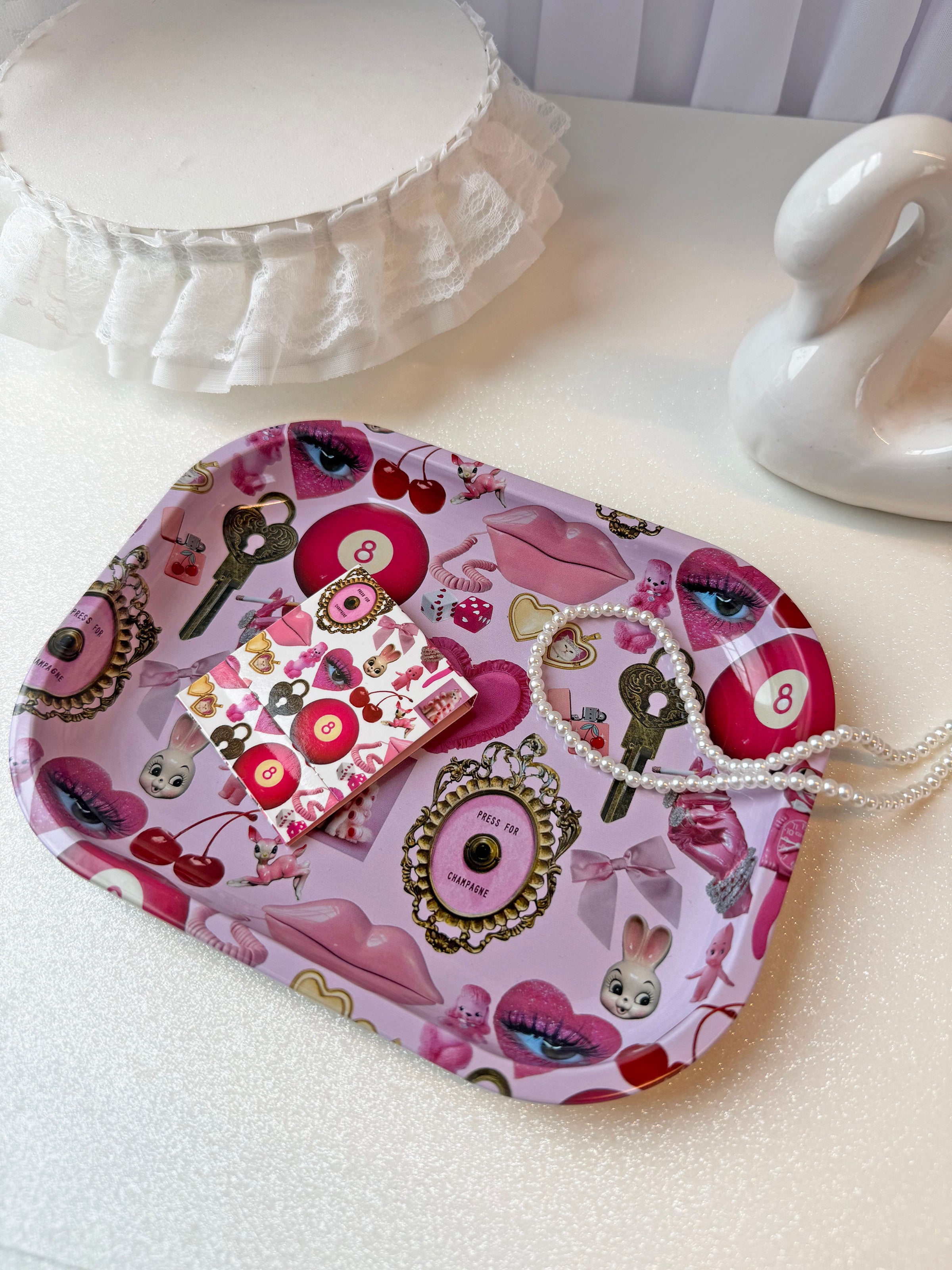 Covered in gorgeous, gorgeous pink things, it features a collage of some of our favorite pink things, from hearts and bows to poodles and kewpie babies! This tray is perf for rolling or as a lil trinket tray around your home.