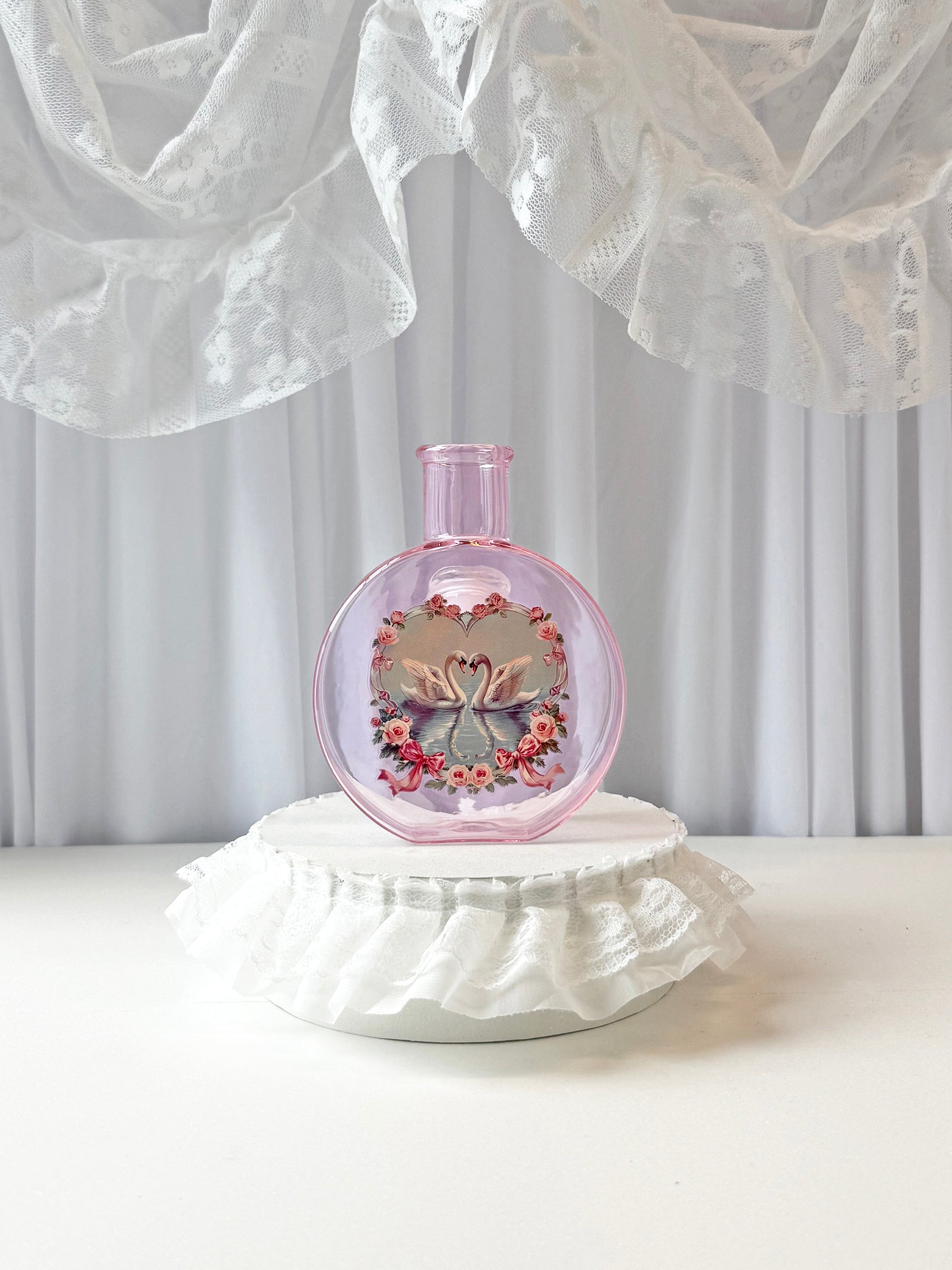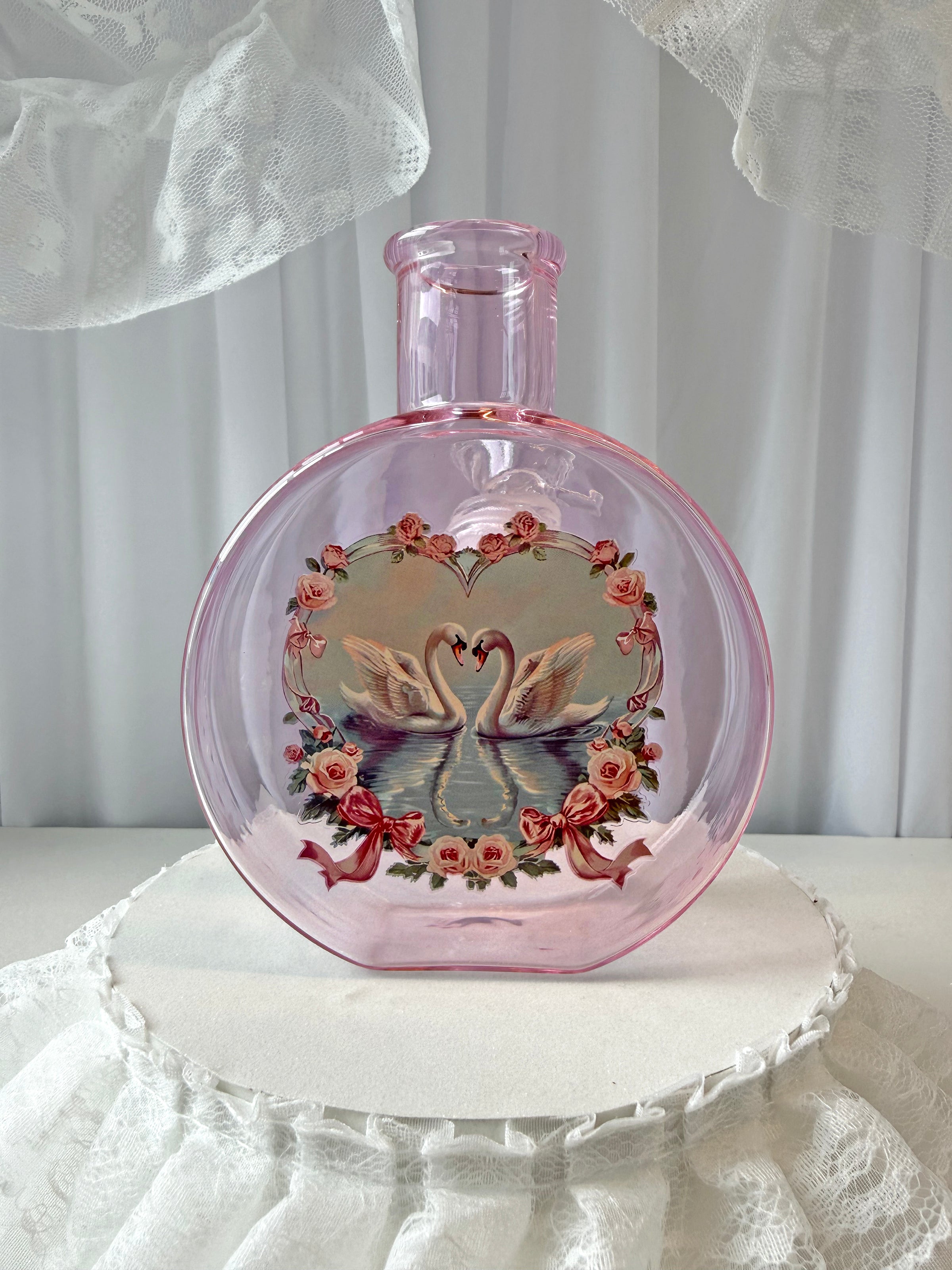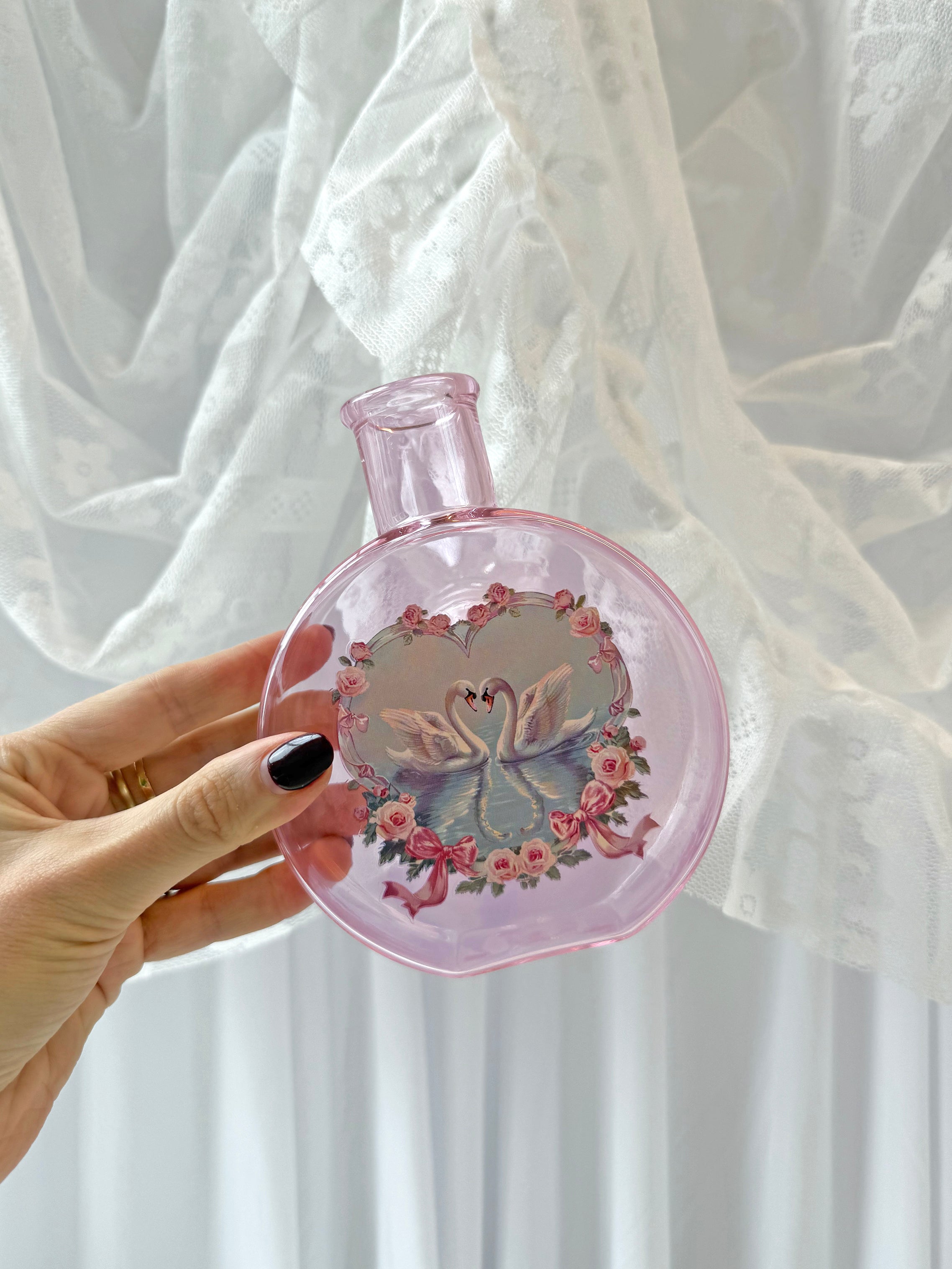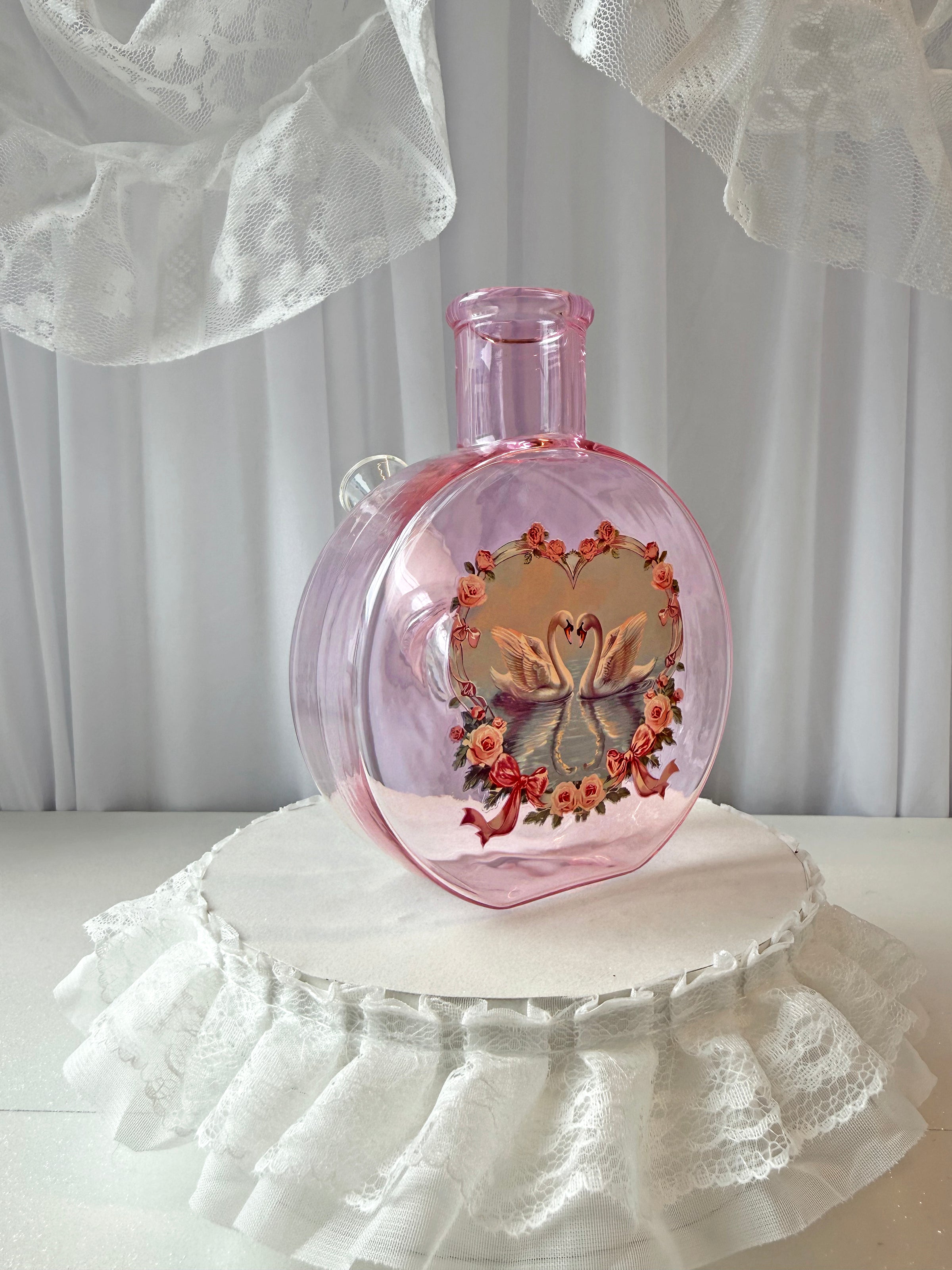 Just like swans mate for life, you'll be in love with this piece for a lifetime! We're OBSESSED with the classy perfume bottle shape of this bong! The front features a beautiful design that's totally serving Swan Lake vibes, featuring two swans in a darling floral heart! Would look stunning on a bar cart or shelf when not in use <3