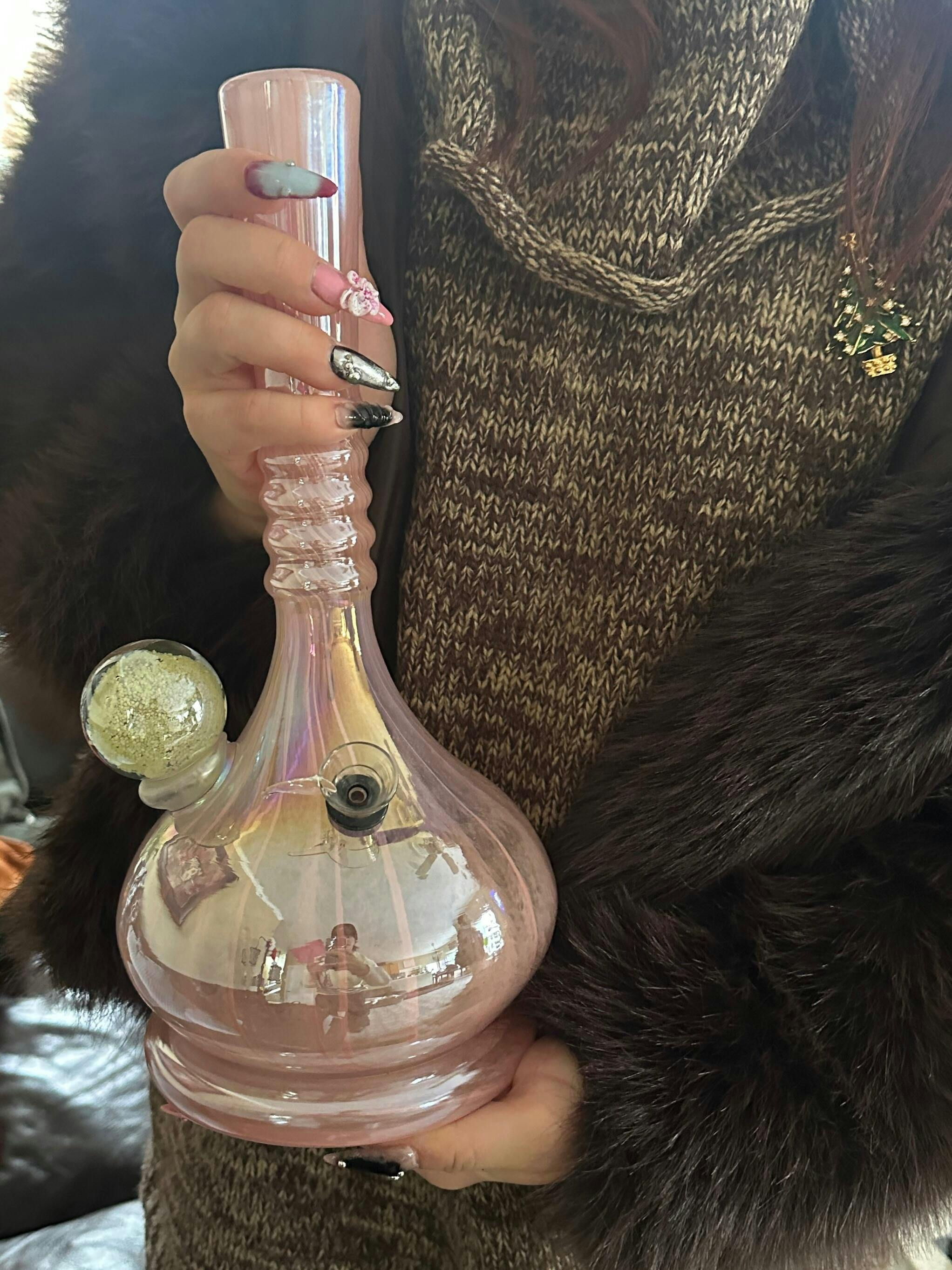Truly one of the most gorgeous bongs we've ever seen. This piece features a stunning iridescent pink striped design all over - it almost resembles a seashell in the sunlight! It also has a cute little decorative bulb on the side that provides extra grip during your sesh (perf if you're accident prone like us). Just fill her with water and you're ready to go!