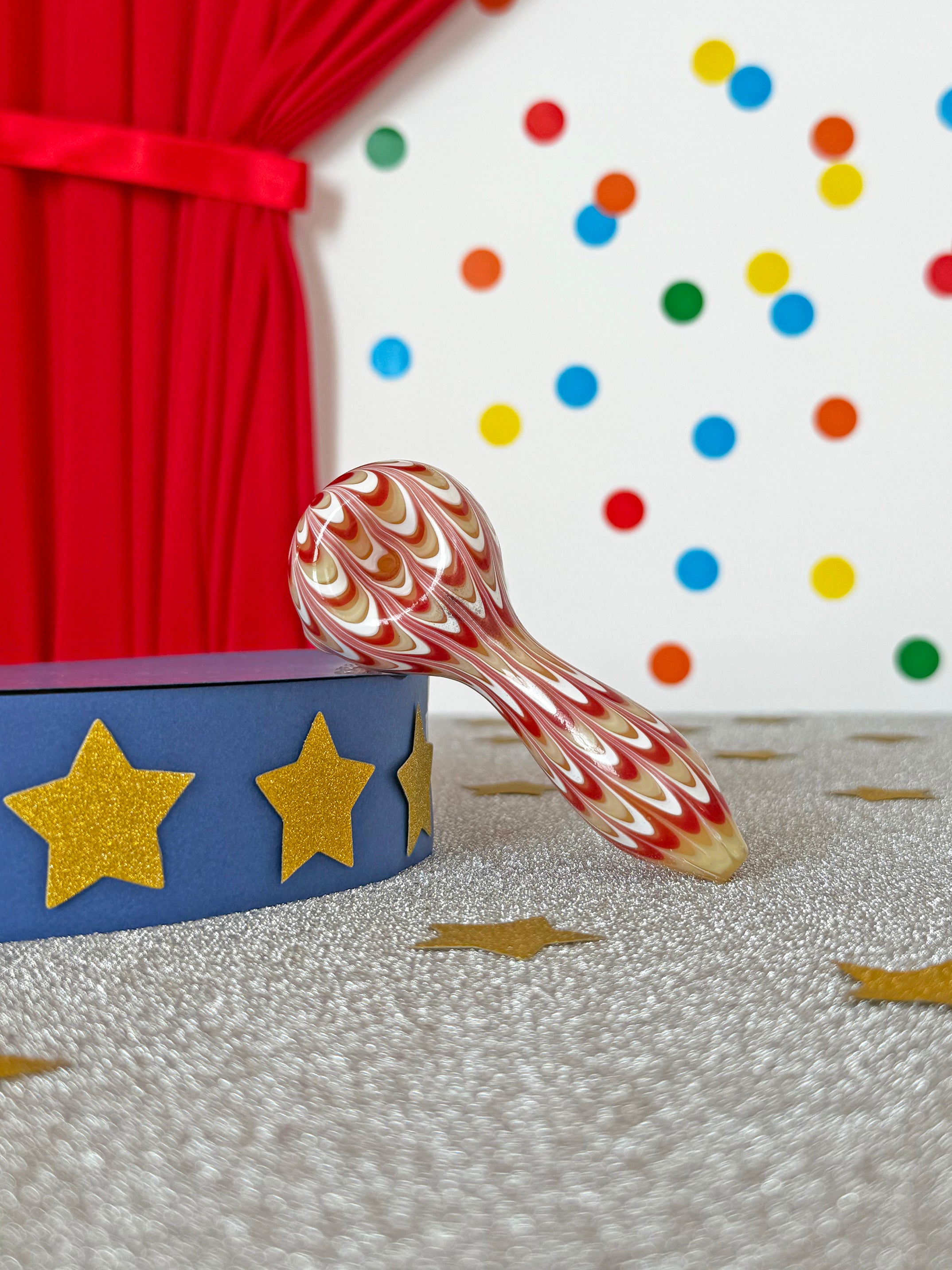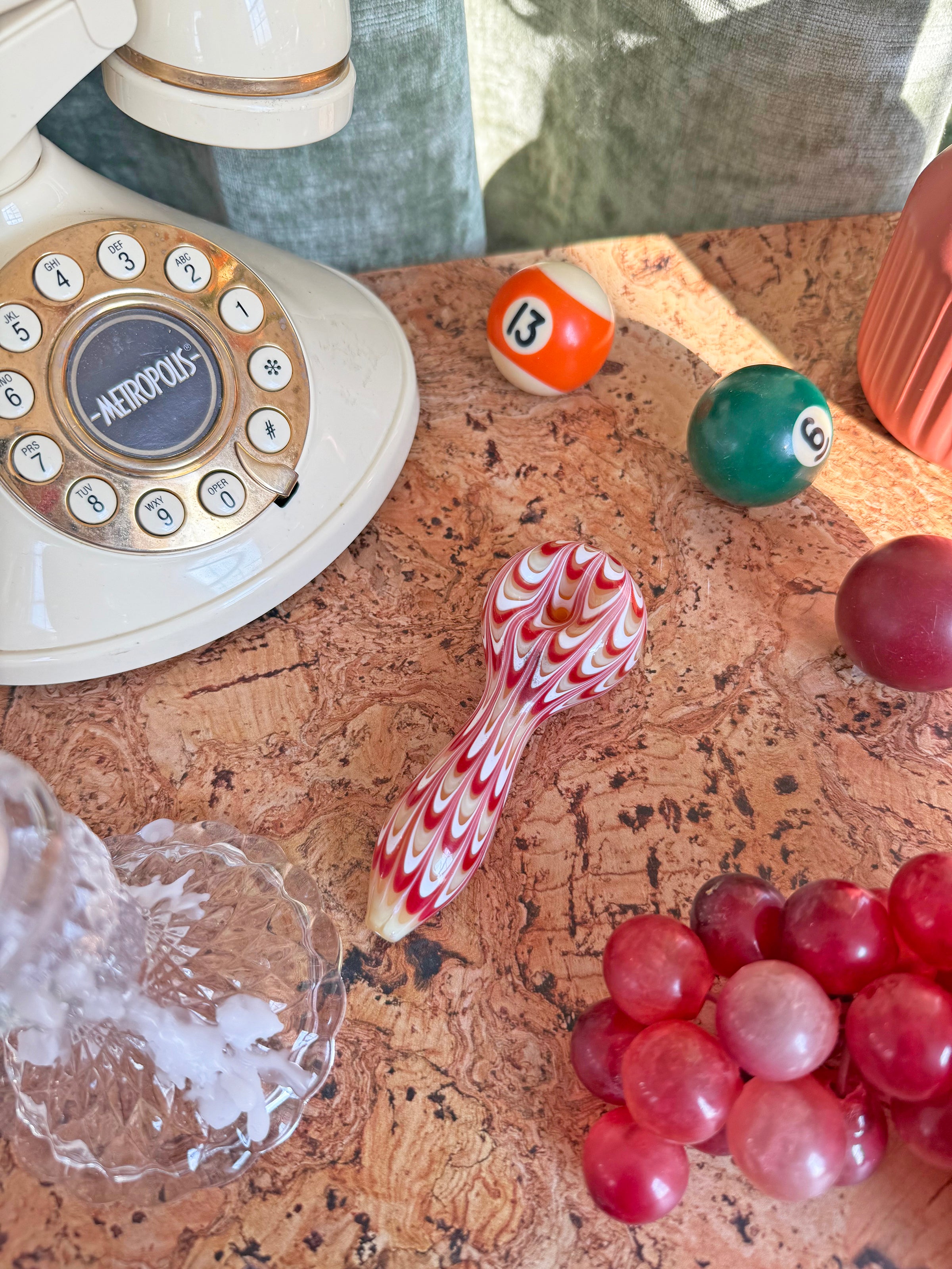 This cutie pipe features a swirly red, white, and brown pattern from top to bottom! It's got that classic hand-pipe shape that feels super sturdy in your hand - perfect if you're accident prone like us. And at just 4.25" long, it's the perfect size to throw in your stash bag and bring on-the-go!