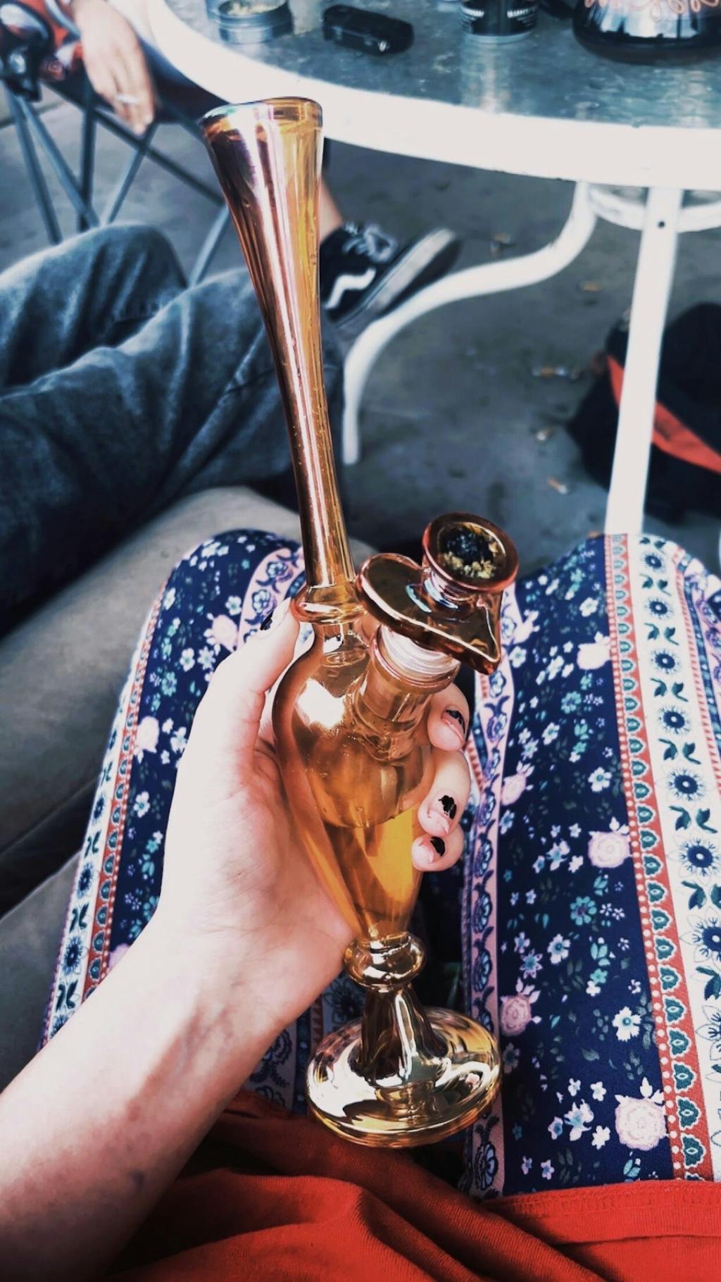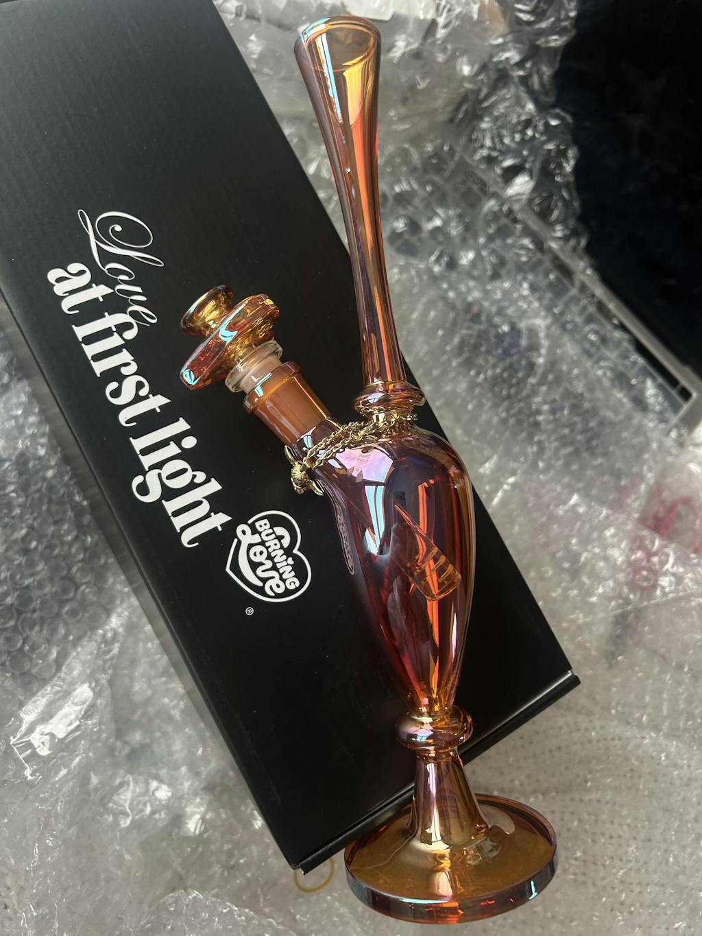 With a sleek design straight out of the roaring 20s, this piece is channeling major art deco vibes. The perfect blend of opulence and function, she's guaranteed to add a touch of class to your smoke sesh! She's got a nice sturdy base, a stunning amber iridescent finish, a matching amber heart slide, and a cute little removable cherub charm around the neck. She also looks gorgeous on a dresser or bar cart when not in use. Obsessed!Â