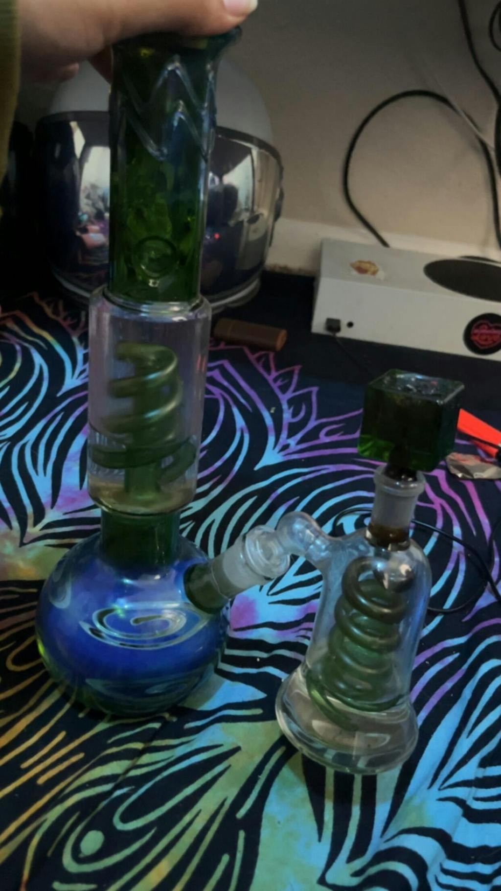 This bong features iridescent swirly green borosilicate glass and a unique corkscrew perc along the neck - it even has an ice catcher so you know you're getting a smooth hit every time! Would look so pretty sitting on a shelf or bar cart when not in use.