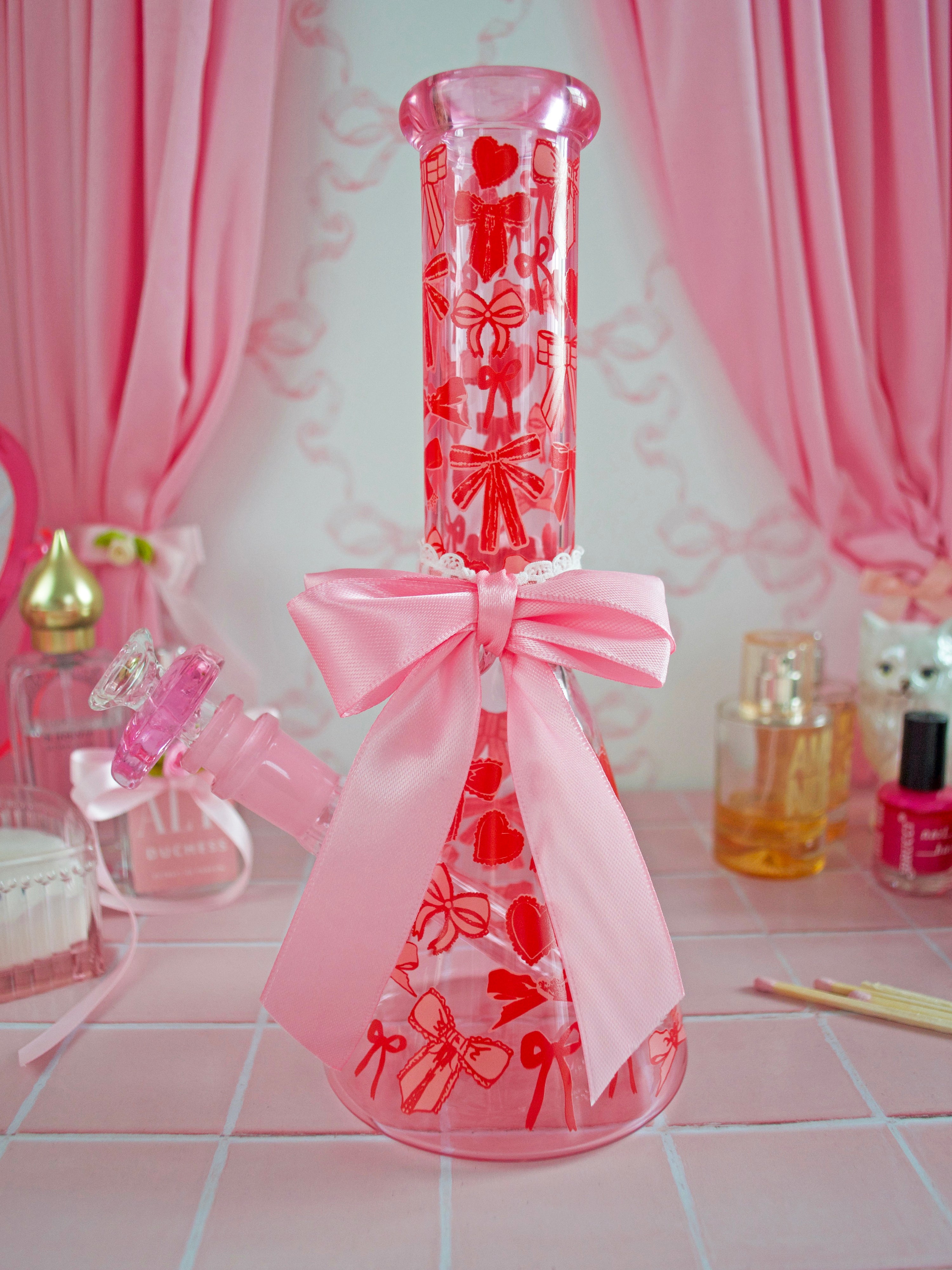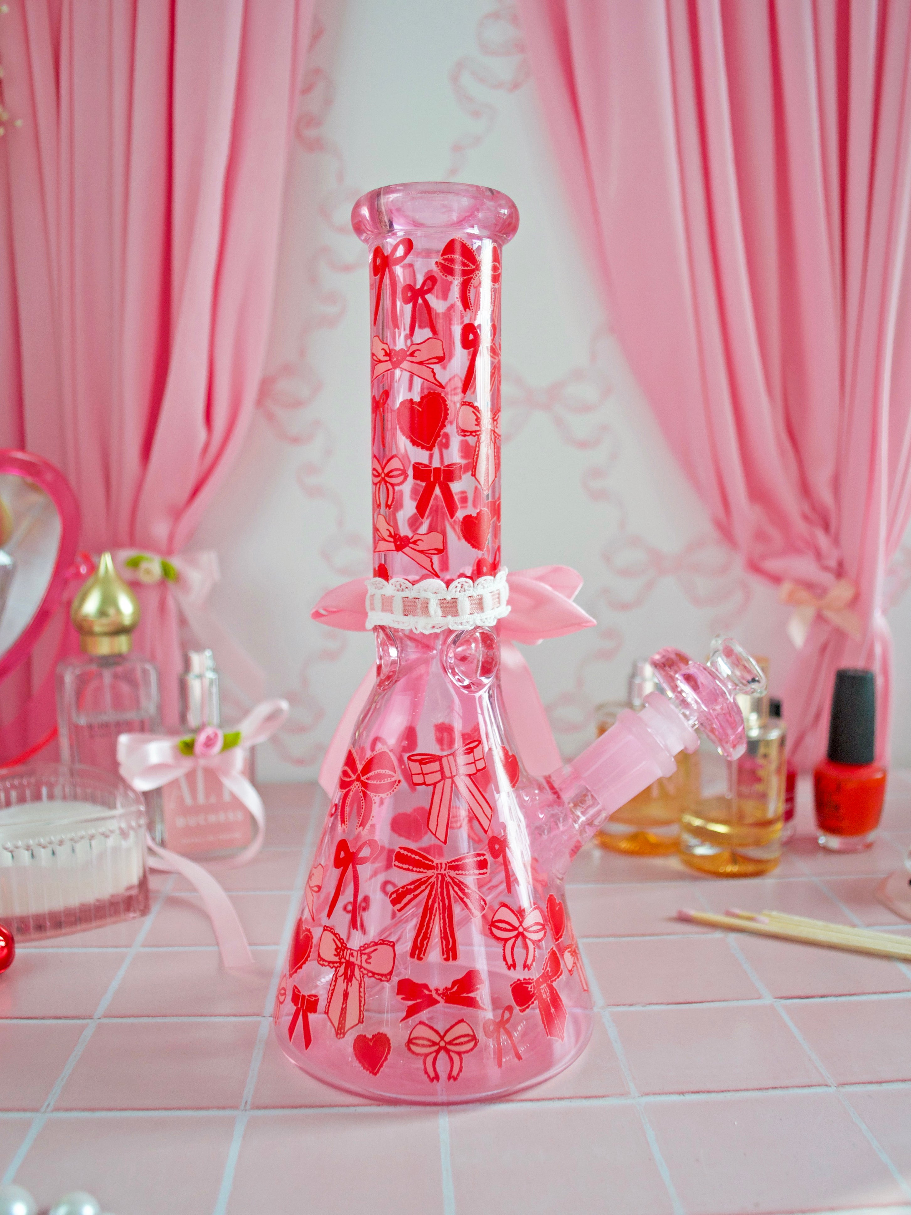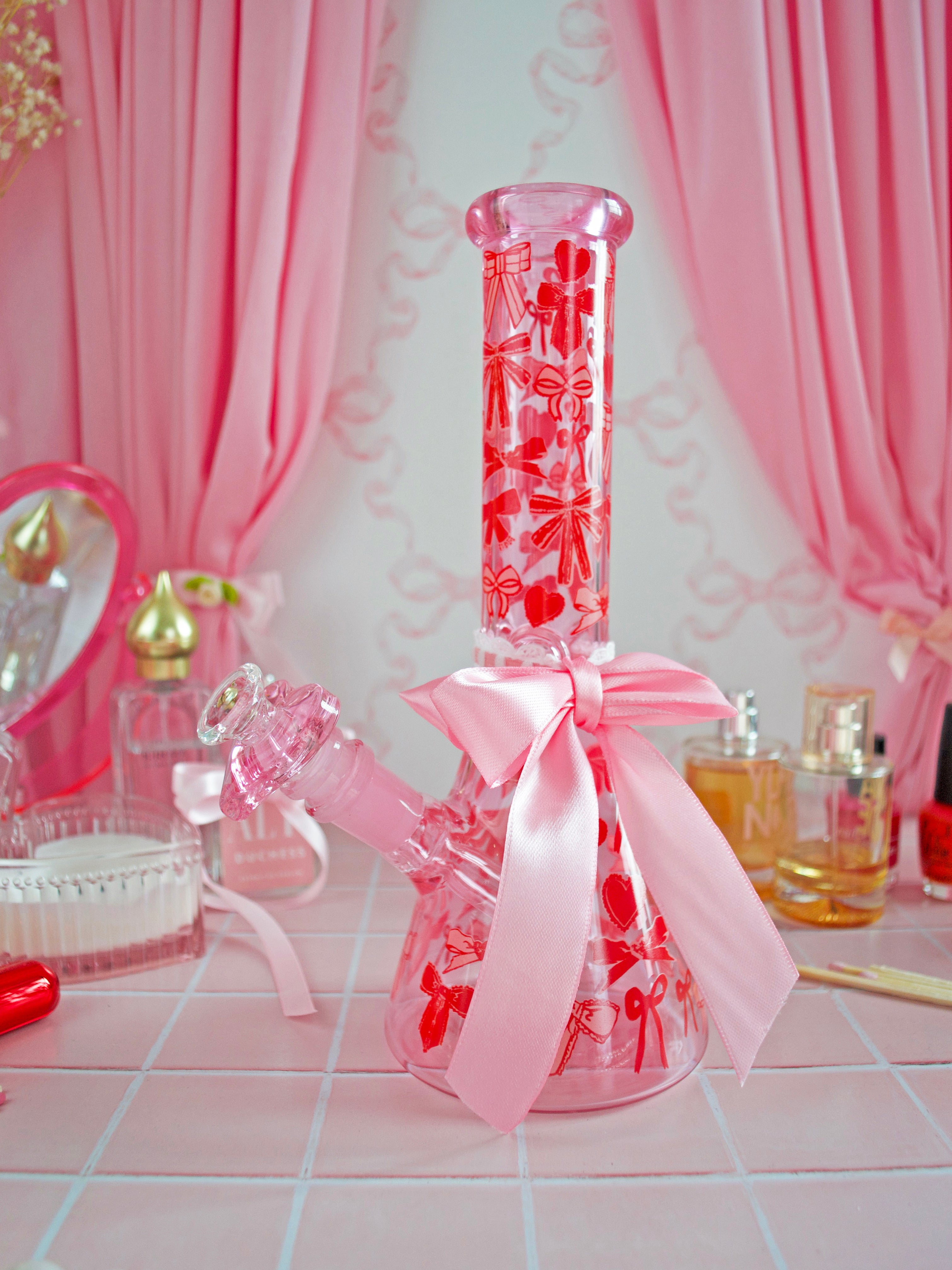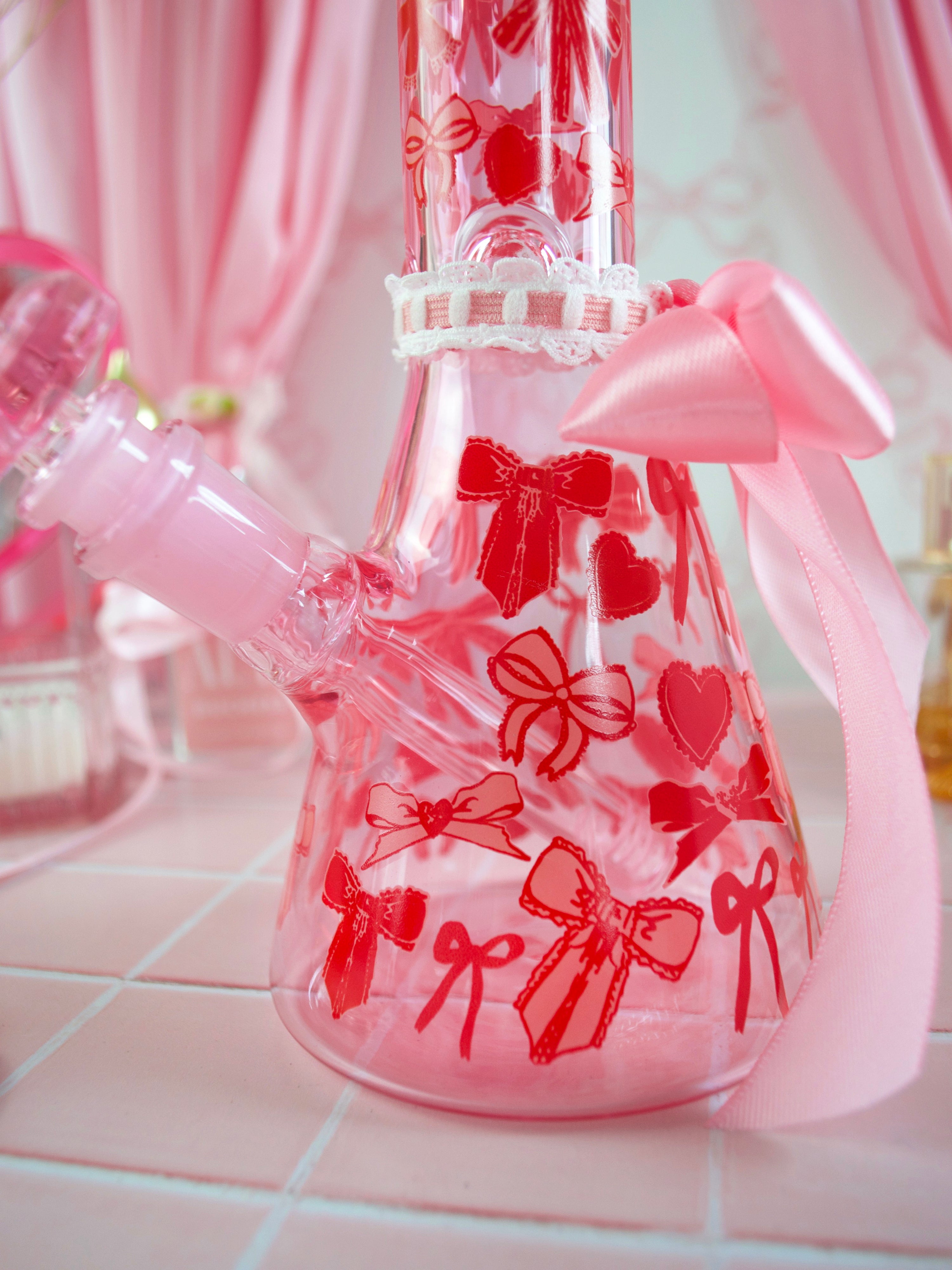 Ribbons and bows for days, this adorable pink bong is the epitome of coquette! She's covered head to toe in a cute bow and heart print, comes with a pink heart slide, and features a removable pink bow attached with a lacy elastic ribbon! She's got a super sturdy beaker-style base and even has an ice catcher for extra smooth hits - we love her!!Â