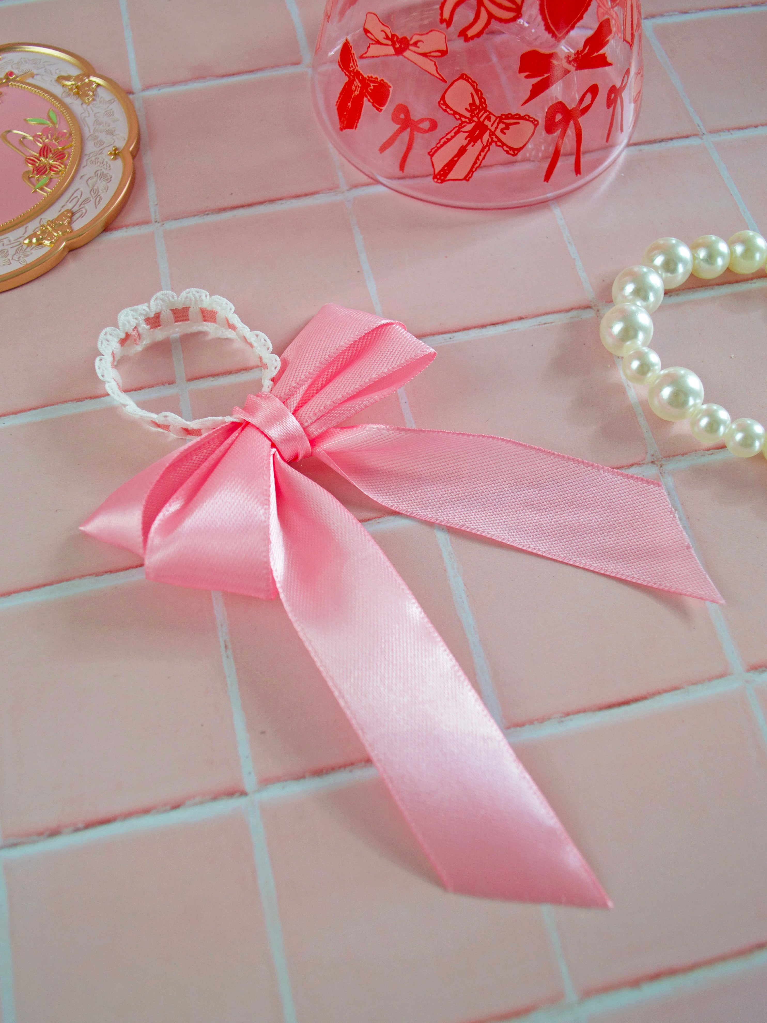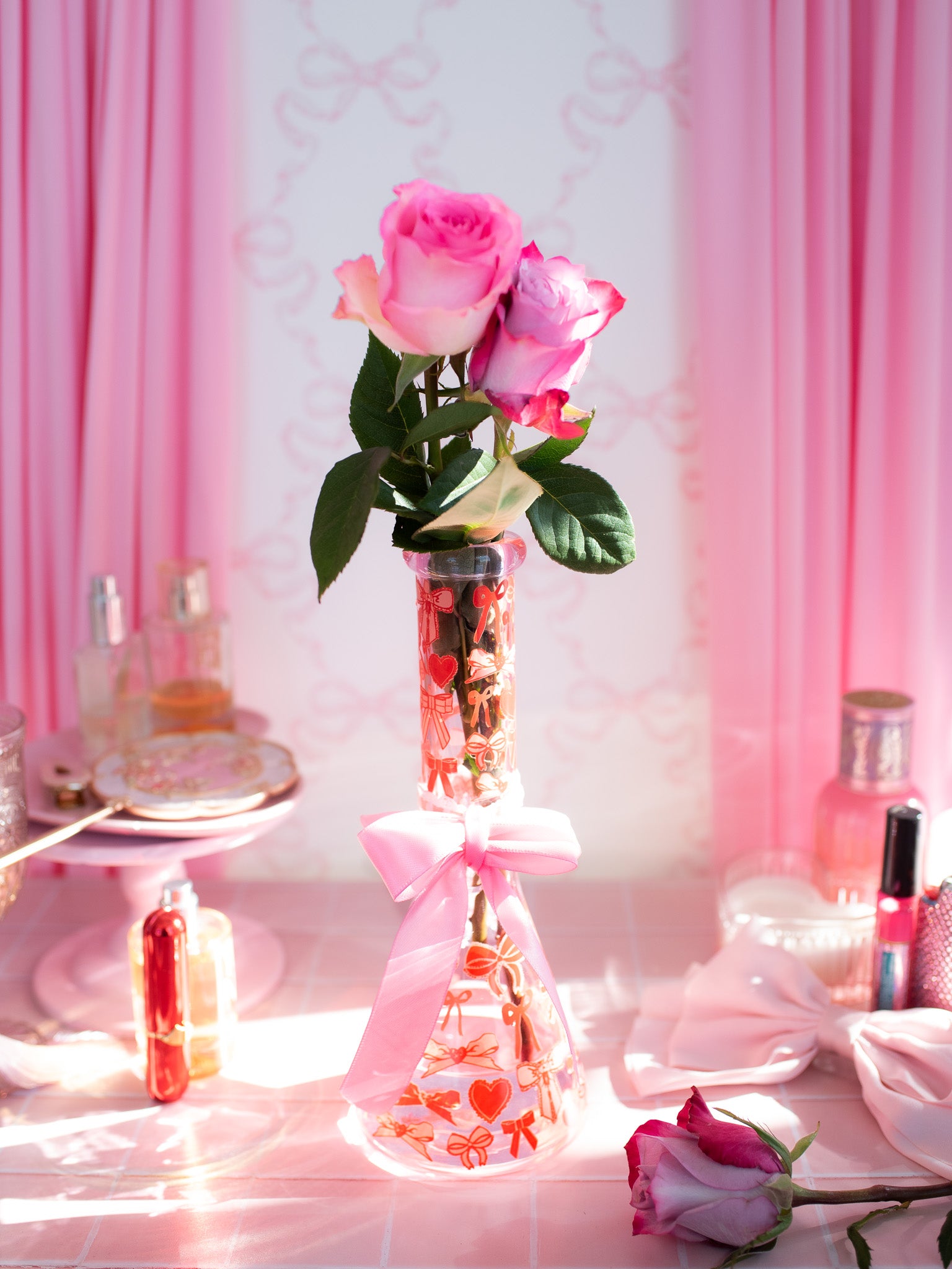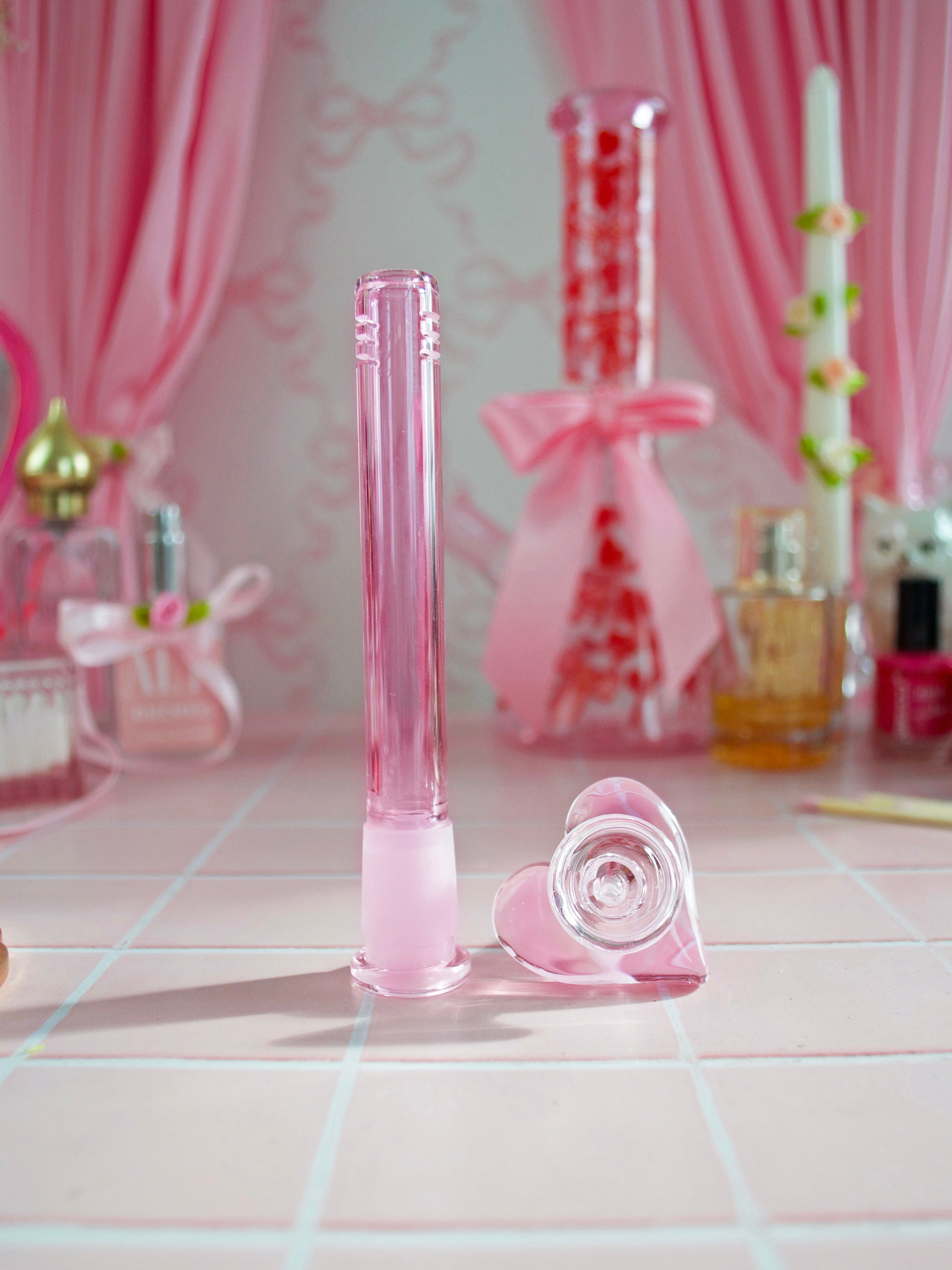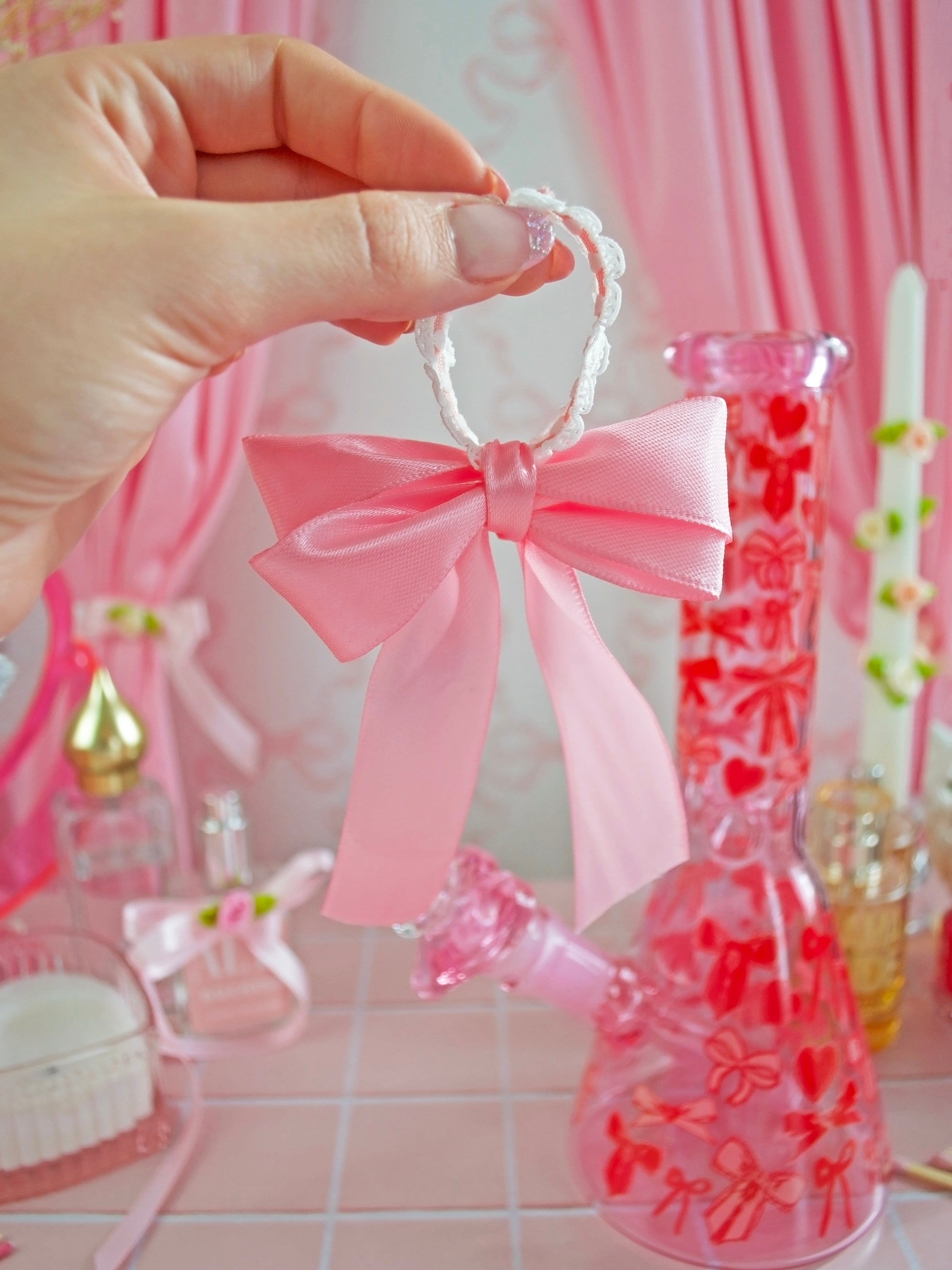 Ribbons and bows for days, this adorable pink bong is the epitome of coquette! She's covered head to toe in a cute bow and heart print, comes with a pink heart slide, and features a removable pink bow attached with a lacy elastic ribbon! She's got a super sturdy beaker-style base and even has an ice catcher for extra smooth hits - we love her!!Â