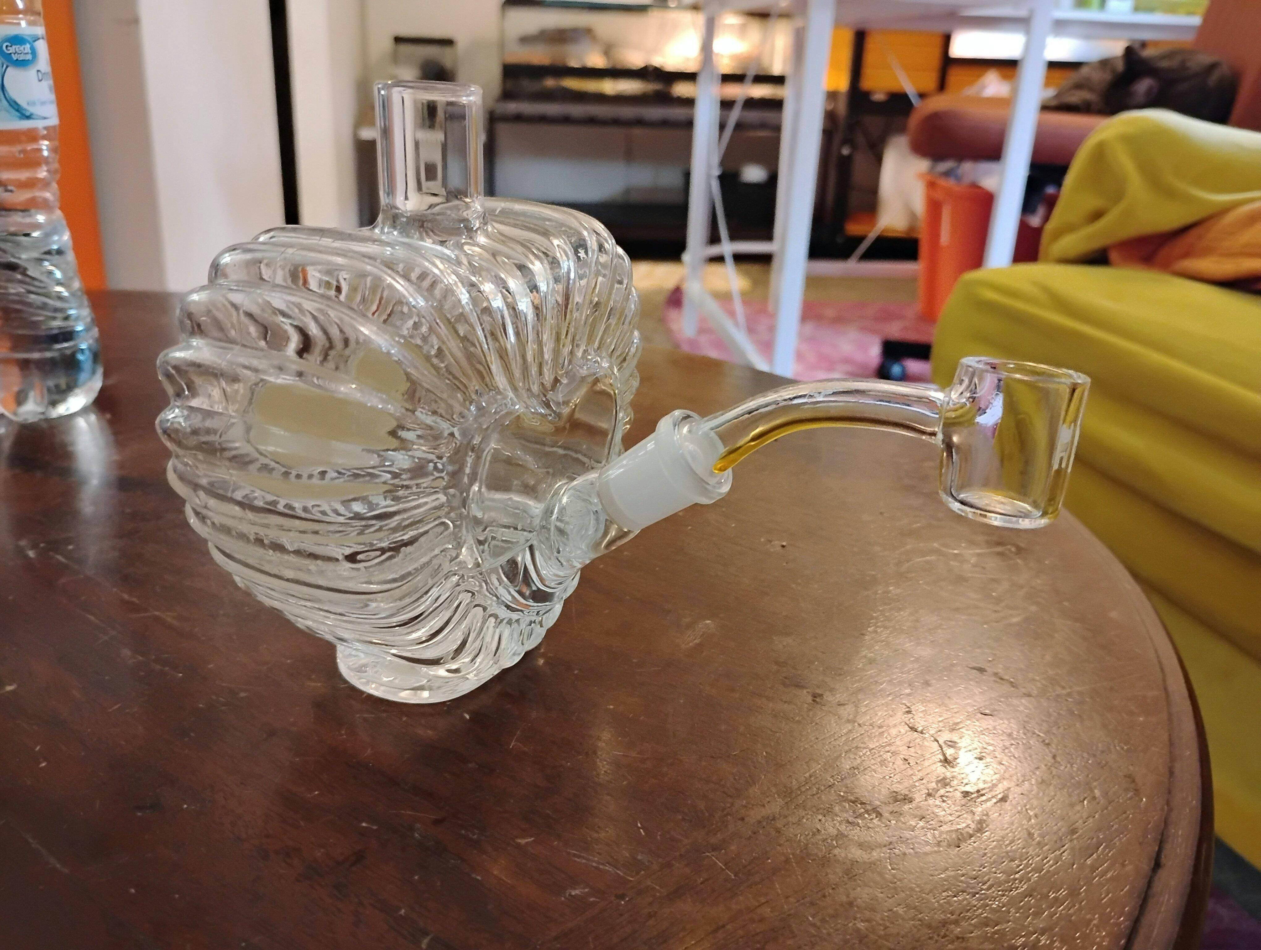 Designed to look like a vintage perfume bottle, you'll never want to hide this piece! Looks gorgeous on a dresser or bar cart when not in use. It has a large smoke chamber with a cute gold heart decal in the center and a removable heart-shaped stopper that looks soooo pretty sitting in the piece in between sessions!